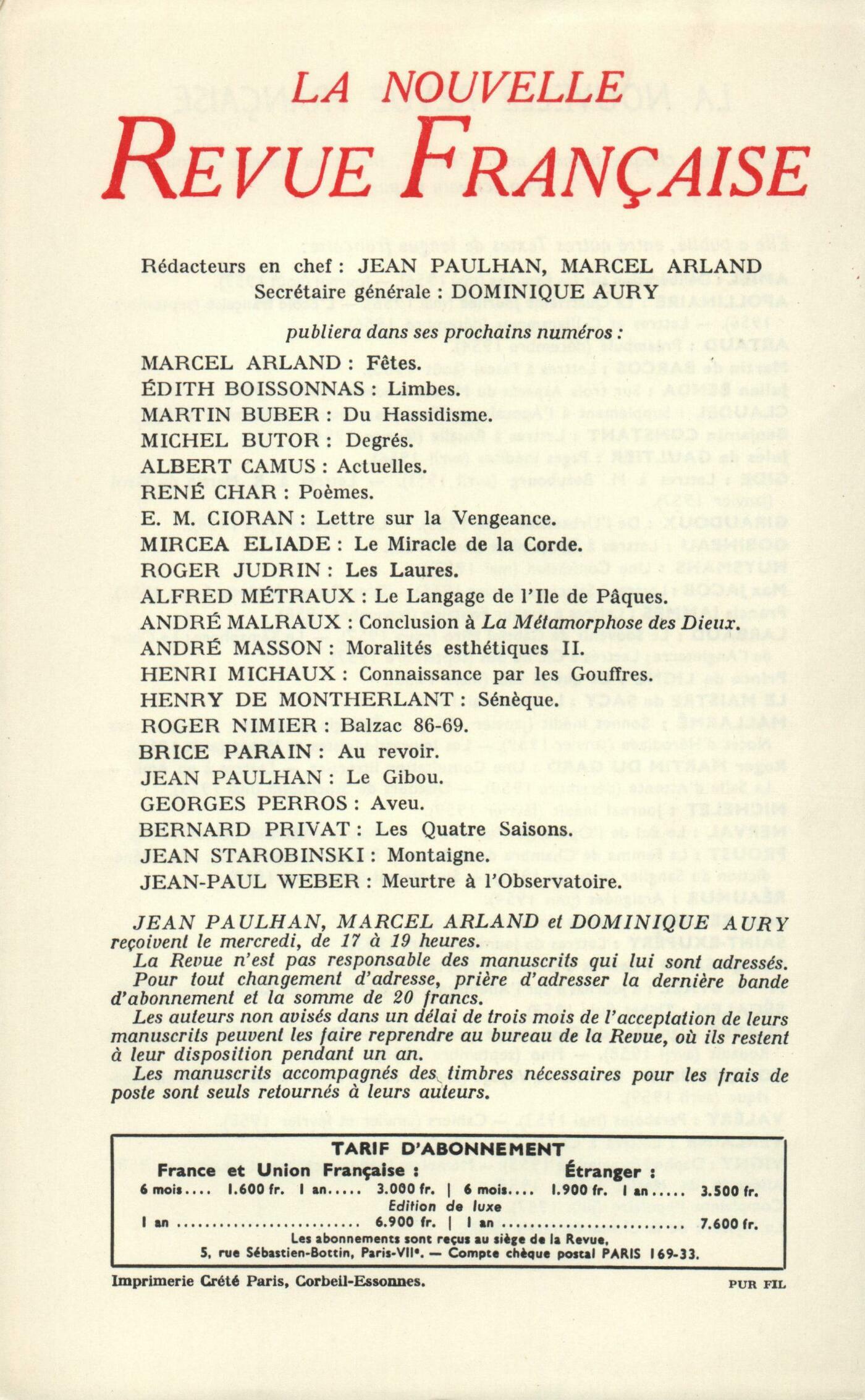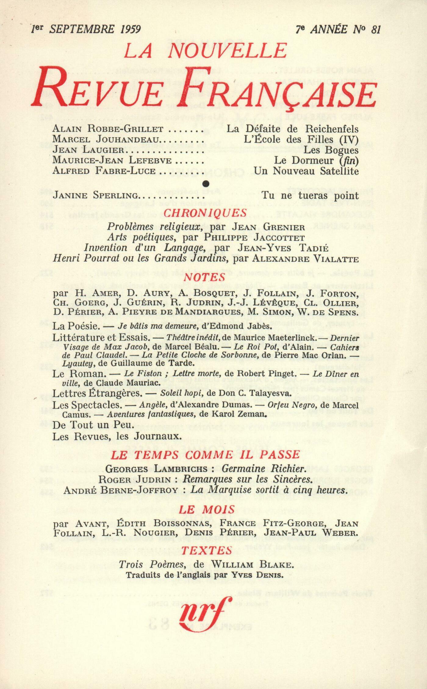 Alain Robbe-Grillet, La Défaite de ReichenfelsMarcel Jouhandeau, L'École des Filles (IV)Jean Laugier, Les BoguesMaurice-Jean Lefebve, Le Dormeur (Fin)Alfred Fabre-Luce, Un Nouveau SatelliteJanine Sperling-Bouscaren, Tu ne tueras pointChroniques : Roger Caillois, Arts poétiquesJean-Yves Tadié, Invention d'un langageAlexandre Vialatte, Henri Pourrat ou Les Grands JardinsJean Grenier, Problčmes religieuxNotes : la poésie : Henry Amer, Je bâtis ma demeure, par Edmond Jabčs (Gallimard)Notes : littérature et essais : Roger Judrin, Théâtre inédit, de Maurice Maeterlinck (Del Duca)Jean Follain, Dernier visage de Max Jacob, par Marcel Béalu (Emmanuel Vitte éditeur)Roger Judrin, Le Roi Pot, par Alain (Gallimard) - Cahiers Paul Claudel, I (Gallimard)Willy de Spens, La Petite Cloche de Sorbonne, par Pierre Mac Orlan (Gallimard)Dominique Aury, Lyautey, le chef en action, par Guillaume de Tarde (Gallimard)Notes : le roman : Claude Ollier, Le Fiston, par Claude Ollier (Éditions de Minuit) - Lettre morte, par Claude Ollier (Éditions de Minuit)Dominique Aury, Le Dîner en ville, par Claude Mauriac (Albin Michel)Notes : lettres étrangčres : André Pieyre de Mandiargues, Soleil Hopi, par Don C. Talayesva (Plon)Notes : les spectacles : Denis Périer, Angčle, d'Alexandre Dumas (Théâtre de la Gaîté-Montparnasse)Michel Simon, Ŕ propos de l'Orfeu Negro, de Marcel CamusClaude Ollier, Aventures fantastiques, de Karol ZemanDe tout un peu : Denis Périer, Corbičres, par Jean Lebrau (Gallimard) - Toisons, par André Miguel (Gallimard)Alain Bosquet, Le Chant réuni, par Rouben Melik (Pierre Seghers) - Le Pęcheur de Lune, par Minou Drouet (Pierre Horay)Jean Forton, Le Pont des sorts, par Joseph Peyré (Flammarion)Denis Périer, Le Cercle des représailles, par Kateb Yacine (Le Seuil) - Les Mains pleines de doigts, par Silvia Monfort (Julliard)Jean Forton, L'Horloger du Cherche-Midi, par Luc Estang (Le Seuil) - Le Bonheur est sur l'autre rive, par Pierre Francescat (Grasset)Jean-Jacques Lévęque, Karskaya (Galerie La Roue)Charles Goerg, ŤYannť (Galerie Breteau)Les revues, les journaux : Collectifs, Sur Max JacobAndré Pieyre de Mandiargues, Chenille pour Unica ZurnJean Schlumberger, TechniqueJean Guérin, Le sottisier - DiversLe temps, comme il passe : Georges Lambrichs, Germaine RichierRoger Judrin, Remarques sur les sincčresAndré Berne-Joffroy, La marquise sortit ŕ cinq heuresLe mois : Avant, Le Rossignol Le Rouge-queue La Tourterelle La Sittelle Le BouvreuilÉdith Boissonnas, Exposition BraqueJean-Paul Weber, Saint-TropLouis-René Nougier, L'origine néolithique de ParisFrance Fitz-George, NocturneDenis Périer, Le petit monde Pablo PicassoJean Follain, Un cinquantenaire au TrocadéroTextes : William Blake, Trois počmes