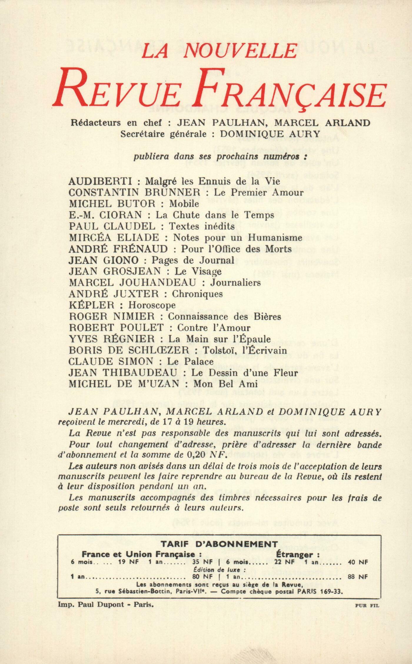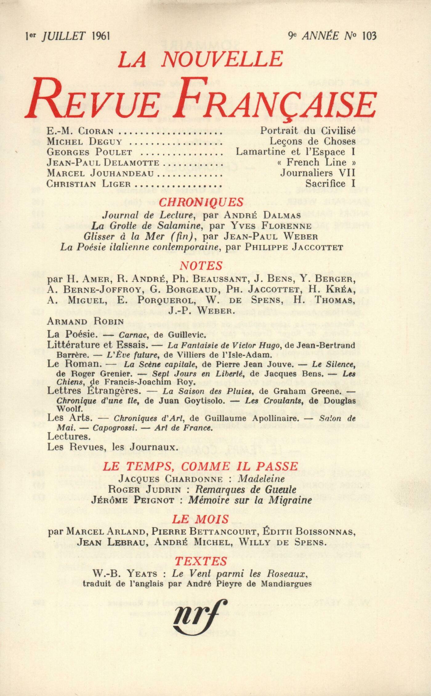 Cioran, Portrait du civiliséMichel Deguy, Leçons de chosesGeorges Poulet, Lamartine et le sentiment de l'espaceJean-Paul Delamotte, French LineMarcel Jouhandeau, Journaliers (VII)Christian Liger, Sacrifice (I)Chroniques : Yves Florenne, La grotte de SalamineJean-Paul Weber, Glisser ŕ la mer (Fin)André Dalmas, Journal de lecturePhilippe Jaccottet, La poésie italienne contemporaineNotes : la poésie : Henri Thomas, Armand RobinNotes : littérature et essais : Philippe Jaccottet, Carnac, par Guillevic (Gallimard)Henry Amer, La Fantaisie de Victor Hugo, II, par Jean-Bertrand Barrčre (José Corti)Notes : le roman : Robert André, L'Čve future, par Villiers de l'Isle-Adam (J.-J. Pauvert)Henry Amer, La Scčne capitale, par Pierre Jean Jouve (Mercure de France)Henri Kréa, Le Silence, par Roger Grenier (Gallimard)Yves Berger, Sept jours en liberté, par Jacques Bens (Gallimard)Notes : lettres étrangčres : Élisabeth Porquerol, Les Chiens, par Francis-Joachim Roy (Robert Laffont)Philippe Beaussant, La saison des pluies, par Graham Greene (Robert Laffont)Willy de Spens, Chronique d'une île, par Juan Goytisolo (Gallimard)Notes : les arts : Jacques Bens, Les Croulants, par Douglas Woolf (Gallimard)André Miguel, Chroniques d'art, par Guillaume Apollinaire (Gallimard)René de Solier, Salon de MaiAndré Miguel, Capogrossi (Galerie du XXe sičcle)Notes : lectures : André Berne-Joffroy, Art de FrancePhilippe Jaccottet, L'escalier des saisons, par Nicole Cartier-Bresson (Cahiers du Sud)André Miguel, L'Homme inhabitable, par Pierre Della Faille (Parler)Jean-Paul Weber, Les Îles sans abord, par Gabrielle Cabrini (Robert Laffont)Georges Borgeaud, Toutes les heures de la nuit, par Christian Guillet (Flammarion)Jacques Bens, Le Jeu de Dames, par Michel Ragon (Albin Michel)René de Solier, Millares (Galerie Daniel Cordier) - Cardenas (Galerie du Dragon)Les revues : Henri Thomas, Les follesPhilippe Jaccottet, De la poésie concrčteJean Guérin, Ŕ propos d'Isidore Isou - DiversLe temps, comme il passe : Jacques Chardonne, MadeleineRoger Judrin, Remarques de gueuleJérôme Peignot, Mémoire sur la migraine (I)Le mois : Marcel Arland, Les Captives de Campigli (Galerie de France)Jean Lebrau, BrindillesAndré Michel, Le DauphinÉdith Boissonnas, Le bleu des vitrauxPierre Bettencourt, La HavaneWilly de Spens, Sons et Lumičres ŕ Fouquet-le-MagnifiqueTextes : William Butler Yeats, Le Vent parmi les roseaux