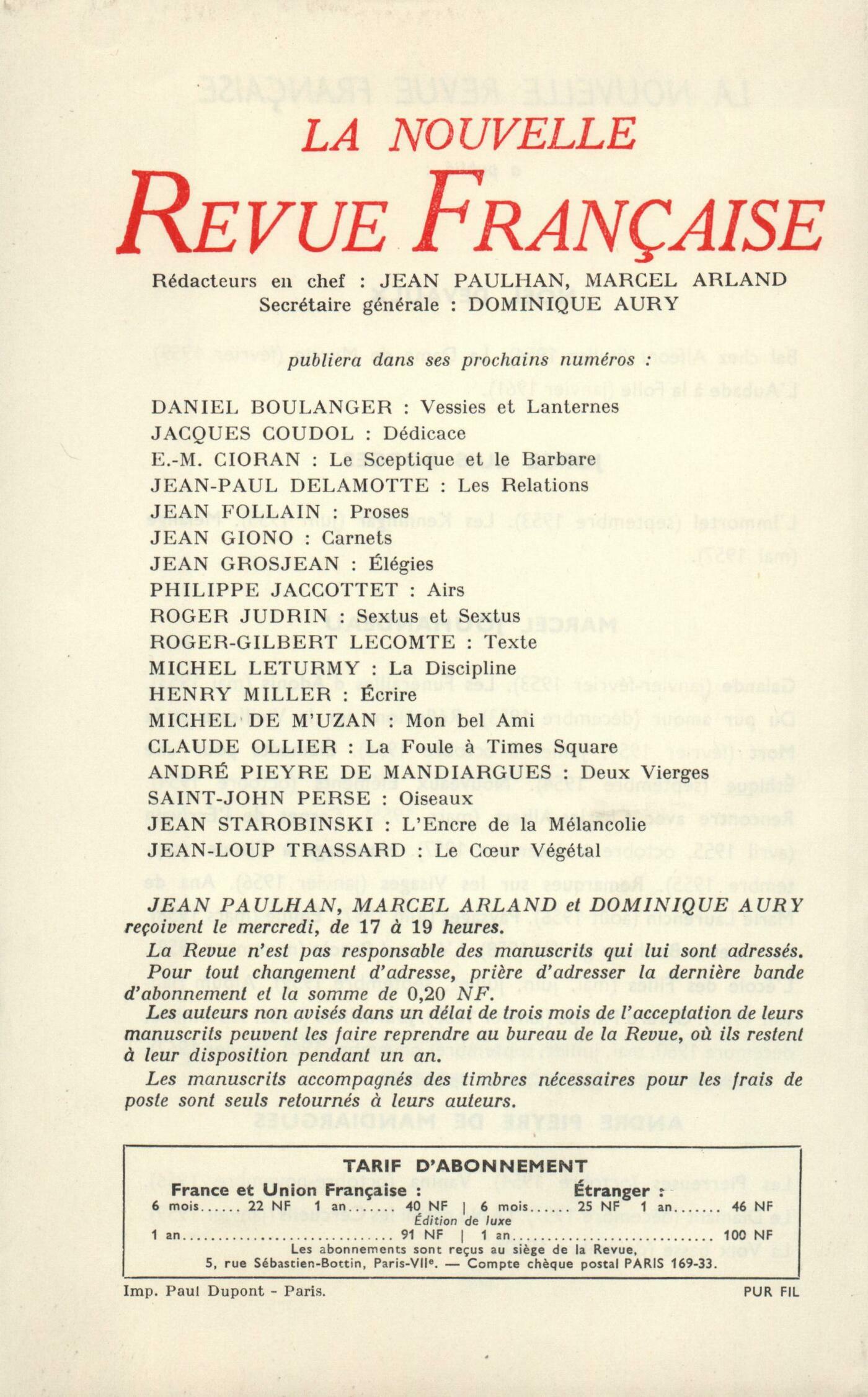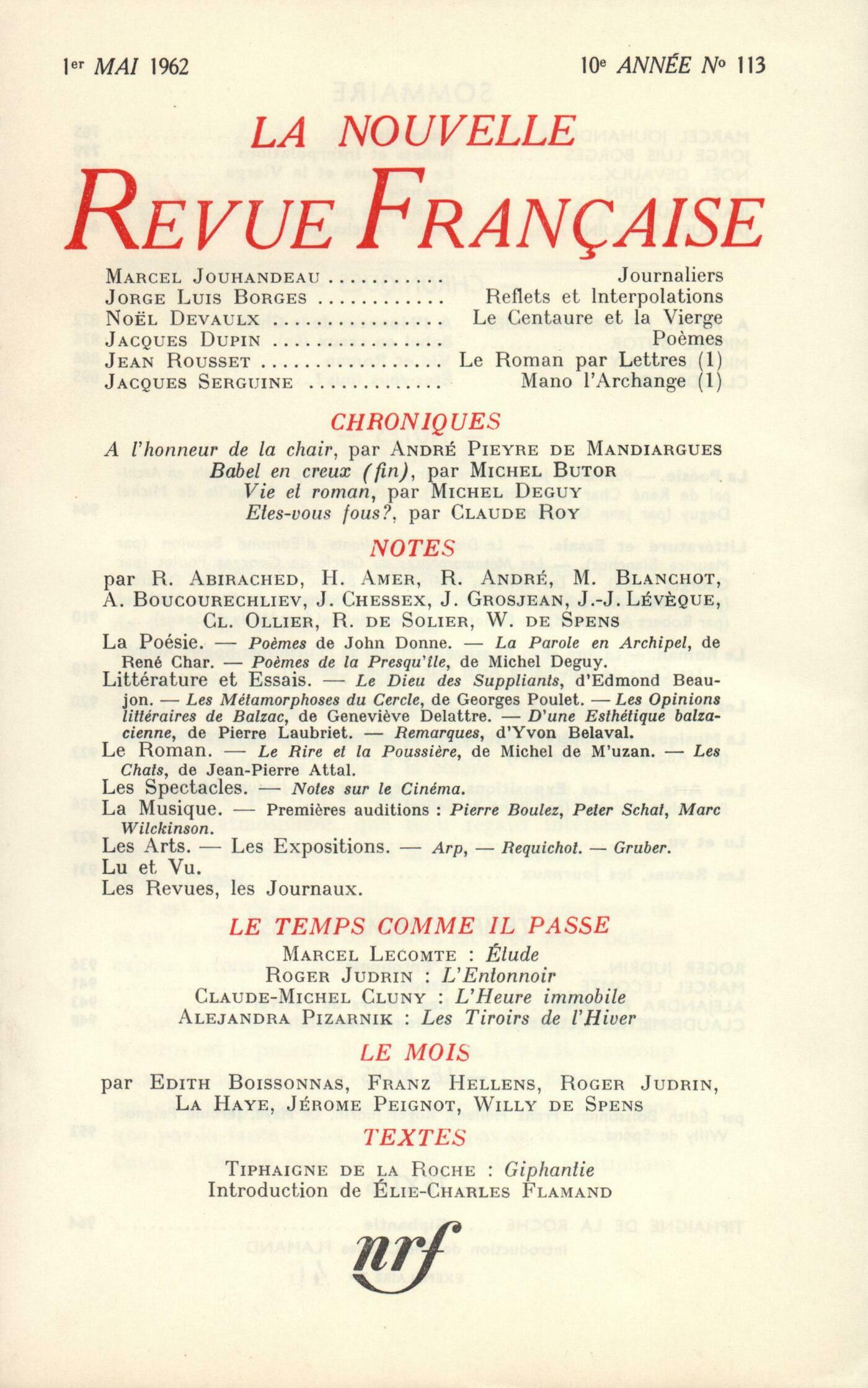 Marcel Jouhandeau, JournaliersJorge Luis Borges, Reflets et InterpolationsNoël Devaulx, Le Centaure et la ViergeJacques Dupin, PočmesJean Rousset, Une forme littéraire : le roman par lettres (I)Jacques Serguine, Mano l'Archange (I)Chroniques : André Pieyre de Mandiargues, Ŕ l'honneur de la chairMichel Butor, Babel en creux (Fin)Michel Deguy, Vie et RomanClaude Roy, Ętes-vous fous?Notes : la poésie : Jean Grosjean, Počmes, de John Donne (Gallimard)Henry Amer, La Parole en archipel, par René Char (Gallimard)Jean Grosjean, Počmes de la presqu'île, par Miche Deguy (Gallimard)Notes : littérature et essais : Maurice Blanchot, Le Dieu des Suppliants, par Edmond Beaujon (Éditions de la Baconničre)Georges Anex, Les Métamorphoses du Cercle, par Georges Poulet (Plon)Robert Abirached, Les Opinions littéraires de Balzac, par Genevičve Delattre (P. U. F.) - L'Intelligence de l'art chez Balzac, par Pierre Laubriet (Didier)Willy de Spens, Remarques, par Yvon Belaval (Gallimard)Notes : le roman : Robert André, Le Rire et la Poussičre, par Michel de M'Uzan (Gallimard)Jacques Chessex, Les Chats, par Jean-Pierre Attal (Julliard)Notes : les spectacles : Claude Ollier, Cinéma : Eddie Sachs ŕ Indianapolis La main dans le pičge Les sept péchés capitauxNotes : la musique : André Boucourechliev, Premičres auditionsNotes : les arts : Jean-Jacques Lévęque, Arp (Musée d'Art moderne) Anonymes, Requichot (Galerie Daniel Cordier) - Francis Gruber (Galerie du Passeur)Notes : lectures : Philippe Jaccottet, Vingt et un počmes, d'Umberto Saba (Rencontre) - Mahafaliennes, par Robert Mallet (Gallimard)André Miguel, Trois crimes rituels, par Marcel Jouhandeau (Gallimard)Denis Périer, Le Bruit lointain du Temps, par Maurice Toesca (Albin Michel)Willy de Spens, Un autre été, par Jean Freustié (La Table Ronde)Denis Périer, Le roman de la Scorpionne, par Roger Gérard-Doscot (Gallimard)Les revues : Jean Guérin, Vie et langageEmmanuel Berl, Avatars de la bourgeoisieJean Guérin, DiversLe temps, comme il passe : Roger Judrin, L'EntonnoirMarcel Lecomte, ÉtudeAlejandra Pizarnik, Les Tiroirs de l'hiverClaude Michel Cluny, L'Heure immobileLe mois : Roger Judrin, D'une supercherie sincčreÉdith Boissonnas, Avant La Haye, PočmesFranz Hellens, Le caméléonWilly de Spens, Clio chez Fabre-LuceJérôme Peignot, Journal d'Espagne (Fin)Textes : Charles-François Tiphaigne de La Roche, Giphantie