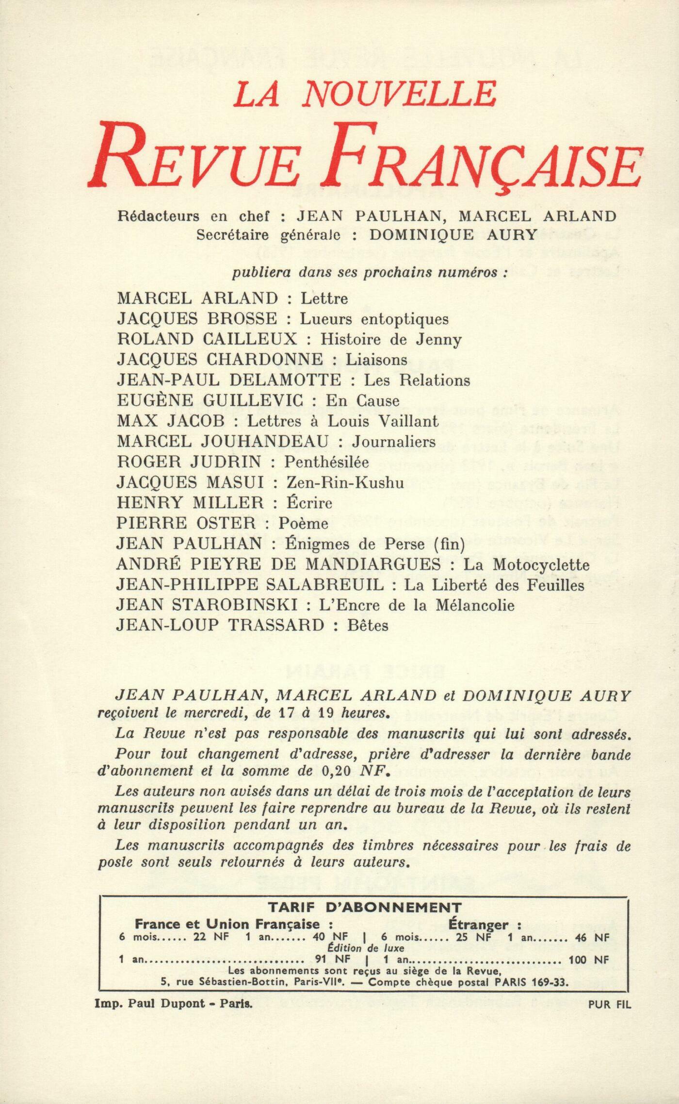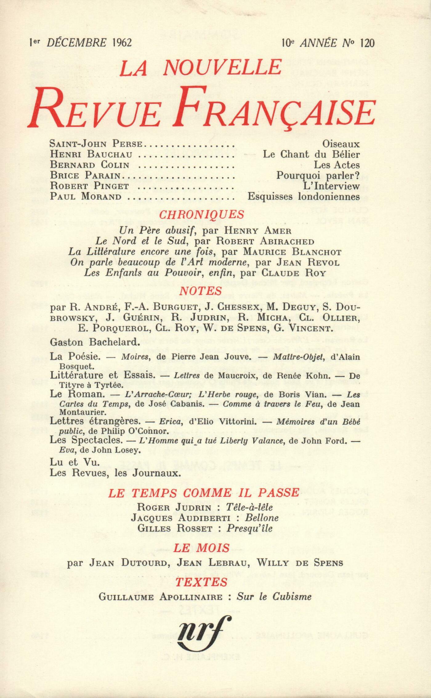 Saint-John Perse, OiseauxHenry Bauchau, Le Chant du bélierBernard Collin, Les ActesBrice Parain, Pourquoi parler?Robert Pinget, L'InterviewPaul Morand, Esquisses londoniennesChroniques : Maurice Blanchot, La littérature encore une foisHenry Amer, Un Pčre abusifRobert Abirached, Le Nord et le SudClaude Roy, Les enfants au pouvoir, enfinJean Revol, On parle beaucoup de l'art moderneNotes : Michel Deguy, Gaston BachelardNotes : la poésie : René Micha, Moires, par Pierre Jean Jouve (Mercure de France)Serge Doubrovsky, Maître objet, par Alain Bosquet (Gallimard)Notes : littérature et essais : Roger Judrin, Lettres de Maucroix, par Renée Kohn (Presses Universitaires de France) - De Tityre ŕ TyrtéeNotes : le roman : Jacques Chessex, L'Arrache-cur L'Herbe rouge, par Boris Vian (Jean-Jacques Pauvert)Robert André, Les Cartes du Temps, par José Cabanis (Gallimard)Roger Judrin, Comme ŕ travers le feu, par Jean Montaurier (Gallimard)Notes : lettres étrangčres : Élisabeth Porquerol, Erica, par Elio Vittorini (Gallimard)Frantz André Burguet, Mémoires d'un bébé public, par Philip O'Connor (Julliard)Notes : les spectacles : Claude Ollier, L'Homme qui a tué Liberty Valance, de John Ford - Éva, de John LoseyLu et vu : Élisabeth Porquerol, Le Chien de l'aube, par Suzanne Martin (Gallimard)Gilbert Vincent, Histoire d'une salamandre, par Catherine Paysan (Denoël)Willy de Spens, La Retenue, par Jean-Paul Aron (Grasset) - Masculin singulier, par Gilles Rosset (Julliard)Gilbert Vincent, Le Cercle, par Michčle Perrein (Julliard) - Changement d'herbage, par Chantal des Nouhes (Denoël)Claude Roy, La Nuit a sa clarté, de Christopher Fry (Odéon-Théâtre de France) - L'Échange, de Paul Claudel (Théâtre Hébertot)Les revues : Julien Gracq, Le roman reverdiraJean Guérin - Paul Nelson, Faits et gestes de BraqueJean Guérin, Les beaux styles - DiversLe temps, comme il passe : Jacques Audiberti, BelloneGilles Rosset, Presqu'îleRoger Judrin, Tęte-ŕ-tęteLe mois : Jean Dutourd, Le square BoucicautJean Lebrau, BrindillesWilly de Spens, Pour sauver la poésieTextes : Guillaume Apollinaire, Sur le Cubisme