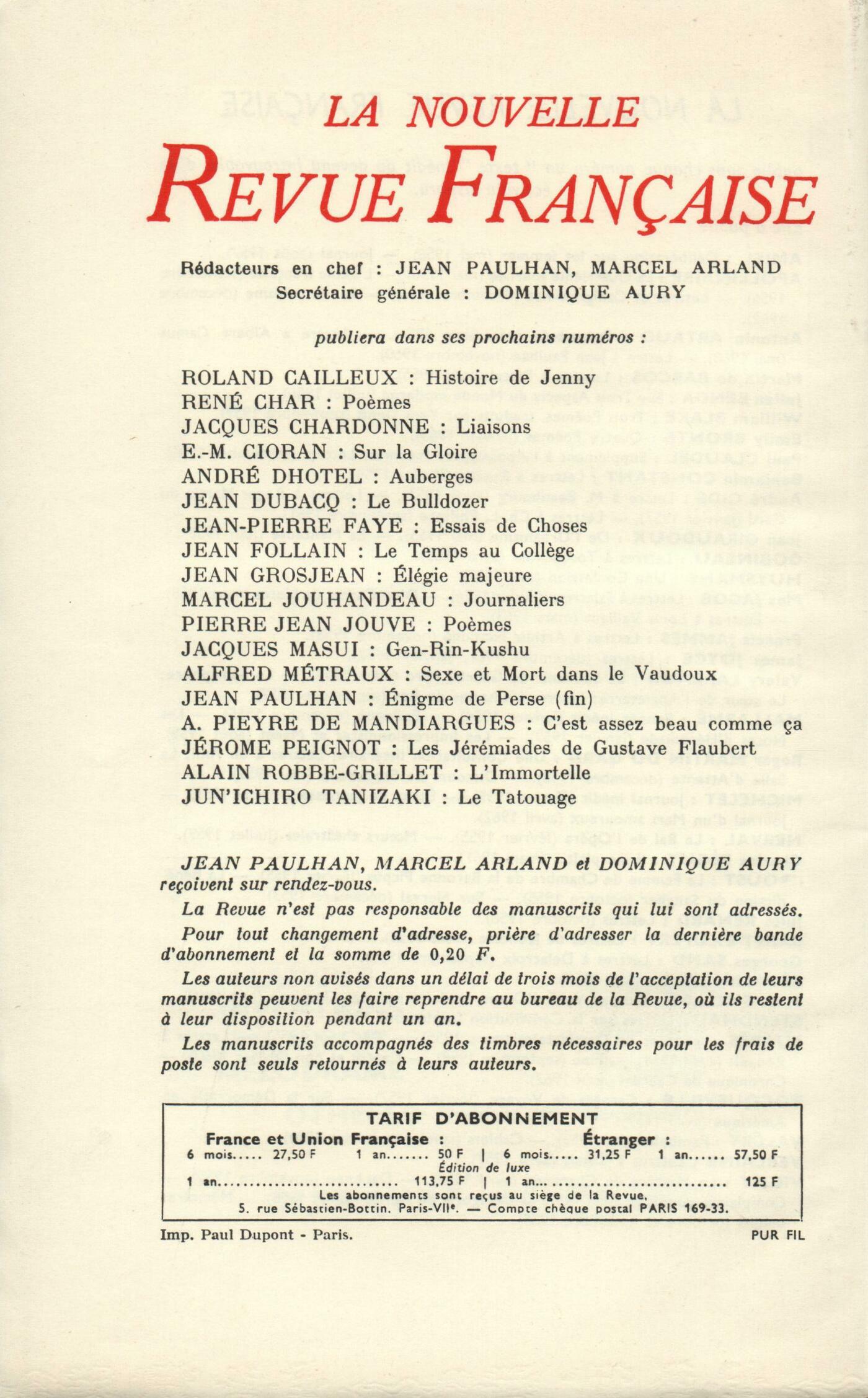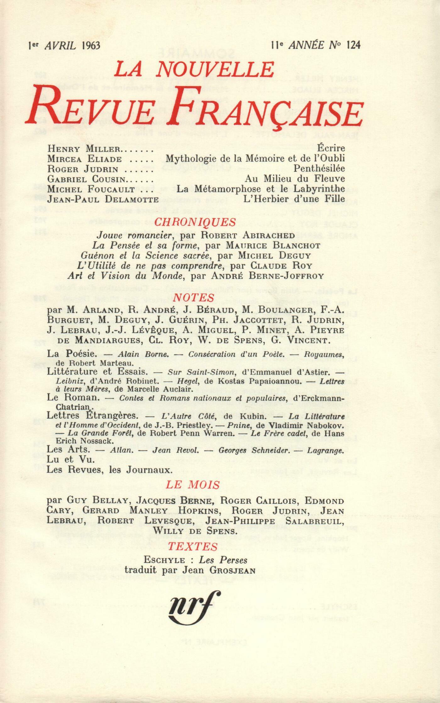 Henry Miller, ÉcrireMircea Eliade, Mythologie de la mémoire et de l'oubliRoger Judrin, PenthésiléeGabriel Cousin, Au mileu du fleuveMichel Foucault, La Métamorphose et le LabyrintheJean-Paul Delamotte, L'herbier d'une filleChroniques : Maurice Blanchot, La Pensée et sa forme (II)Robert Abirached, Jouve romancierMichel Deguy, Guénon et la ŤScience sacréeťClaude Roy, L'utilité de ne pas tout comprendreAndré Berne-Joffroy, Art et vision du mondeNotes : la poésie : Philippe Jaccottet, Alain BornePierre Minet, Consécration d'un počteMichel Deguy, Royaumes, par Robert Marteau Notes : littérature et essais : Willy de Spens, Sur Saint-Simon, par Emmanuel d'Astier Michel Deguy, Leibniz, par André Robinet - Hegel, par Kostas Papaioannou Roger Judrin, Lettres ŕ leurs mčres, par Marcelle Auclair Notes : le roman : Michel Boulanger, Contes et romans nationaux et populaires, par Erckmann-Chatrian Notes : lettres étrangčres : André Pieyre de Mandiargues, L'Autre Côté, par Kubin Roger Judrin, La littérature et l'homme d'Occident, par J. B. Priestley Frantz André Burguet, Pnine, par Vladimir Nabokov Willy de Spens, La Grande Foręt, par Robert Penn Warren André Miguel, Le Frčre cadet, par Hans Erich Nossack Notes : les arts : Janine Béraud, Atlan Marcel Arland, Jean Revol Michel Deguy, Georges SchneiderJean-Jacques Lévęque, Lagrange Lu et vu : Gilbert Vincent, Bloc-notes, de François MauriacJean Guérin, Mirage de la santé, par René Dubos Jean Lebrau, Le Béarn de Charles de Bordeu, par J.-A. Catala André Miguel, Vesper, par Jean Malrieu Gilbert Vincent, Les Grenouilles, par Raymond Duesberg - Le Fusil de chasse, par Yasushi Inoué - Dans la paix comme dans la guerre, par Guillermo Cabrera Infante André Miguel, La Musique sur la colline, par Saki - Leacock Robert André, Le Coq rouge, par Moidrag BulatovicClaude Roy, Le Piéton de l'air, d'Eugčne Ionesco - Le Misanthrope, de Moličre - Galileo Galilée, de Bertolt Brecht - L'Aboyeur et l'Automate, de Gabriel Cousin - Les officiers, de Lenz - Le Théâtre du merveilleux, par Maria Hannah Winter Les revues, les journaux : Jean Guérin - Francis Ponge, D'un nouveau genre littéraireJean Guérin, Ŕ propos de Robert Frost - Enfin, Charles-Albert CingriaRobert Kanters, Les pičgesJean Guérin, Curiosités - DiversLe mois : Roger Judrin, La Plume et la Peine , épitaphe de Pierre HampRoger Caillois, Beautés du Monde invisibleGuy Bellay, Commune mesureRobert Levesque, Coup d'il sur PontignyJean Lebrau, BrindillesGerard Manley Hopkins, Je m'éveille et je palpe la peau de la ténčbre Willy de Spens, Érotisme et libertinage Jean-Philippe Salabreuil, Détraqué Jacques Berne, S. F. Edmond Cary, Rabelais traduit Eschyle, Les Perses