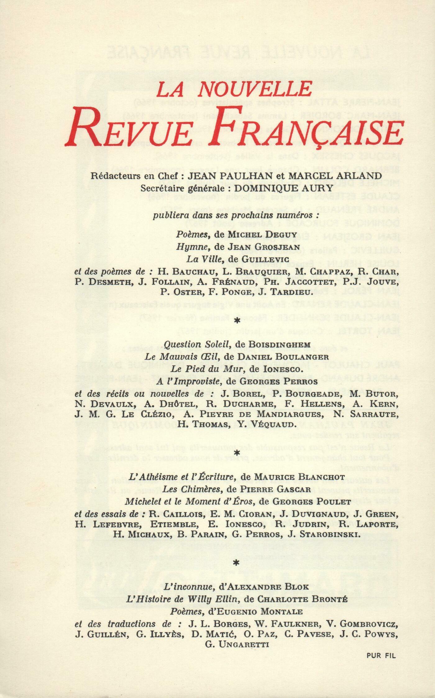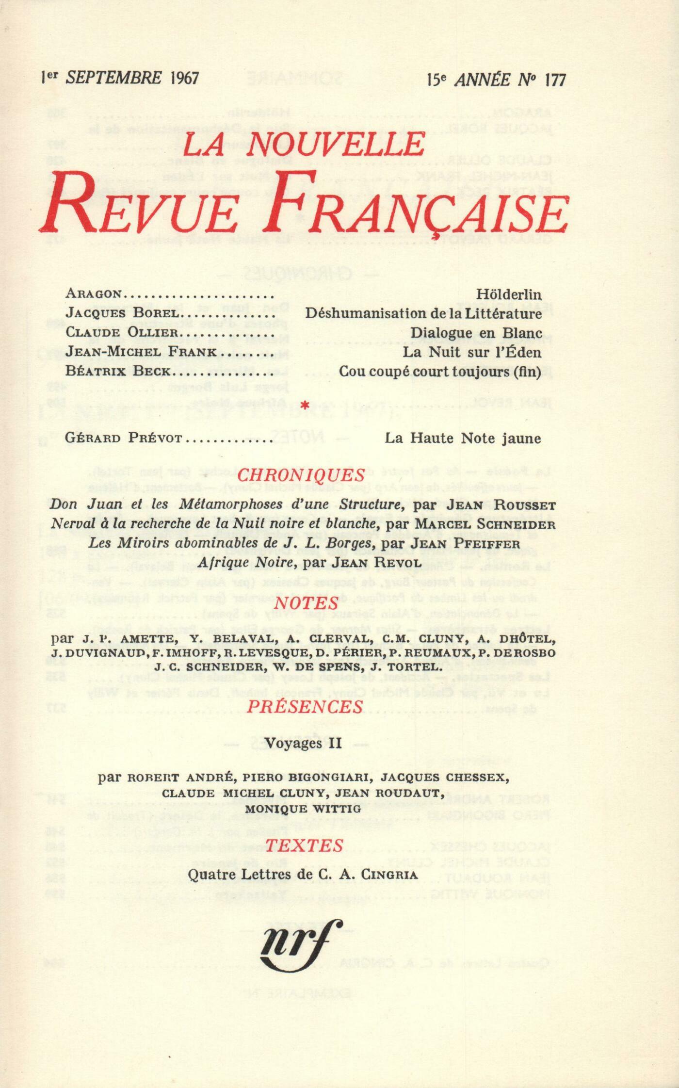 Louis Aragon, HölderlinJacques Borel, Sur la déshumanisation de la littératureClaude Ollier, Dialogue en blancJean-Michel Frank, La Nuit sur l'ÉdenBéatrix Beck, Cou coupé court toujours (Fin)Gérard Prévot, La Haute Note jauneChroniques : Jean Rousset, Don Juan et les métamorphoses d'une structureMarcel Schneider, Nerval ŕ la recherche de la nuit noire et blancheJean Pfeiffer, Les miroirs abominables de Jorge Luis BorgesJean Revol, Afrique NoireNotes : la poésie : Jean Tortel, Au pas feutré du songe, par Emmanuel Lochac (Les Cahiers des Images de Paris)Claude Michel Cluny, Jours effeuillés, par Jean Arp (Gallimard) - Battement, par Hélčne Mozer (Éditions Gaston Puel)Notes : littérature générale et essais : Robert Levesque, Le Coran (Gallimard)André Dhôtel, Études et témoignages, par Amédée Ponceau (Desclée de Brouwer)Jean Duvignaud, Le retour du tragique, par Jean-Marie Domenach (Le Seuil)Notes : le roman : Yvon Belaval, L'Antagoniste, par Jean-Pierre Attal (Gallimard)Alain Clerval, La Confession du pasteur Burg, par Jacques Chessex (Bourgois)Patrick Reumaux, Vendredi ou Les limbes du Pacifique, par Michel Tournier (Gallimard)Willy de Spens, La Dénonciation, par Alain Spiraux (Société des Éditions Modernes)Notes : lettres étrangčres : Patrick de Rosbo, Silas Marner, par George Eliot (Gallimard)Jean-Claude Schneider, Le Laitier, par Peter Bichsel (Gallimard), Un amateur de demi-teintes, par Alfred Andersch (Le Seuil)Notes : les spectacles : Claude Michel Cluny, Accident, de Joseph LoseyLu et [vu] : Claude Michel Cluny, Papiers d'identité, par Franck Venaille (Pierre-Jean Oswald)Denis Périer, La Nature est un talisman, par Jacques de Bourbon Busset (Gallimard)Willy de Spens, La couleur du gris, par Roger Bésus (Plon) - Les Collines de l'Est, par Jean Freustié (Grasset)Denis Périer, Journal d'un étranger ŕ Paris, par Curzio Malaparte (Denoël)François Imhoff, Bourdelle (Galerie Claude Bernard) - Sculptures pour l'architecture, bronzes, gouaches, de Zadkine (Galerie Lucie Weill)Jean-Jacques Lévęque, Asger Jorn (Galerie Jeanne Bucher et Galerie Rive Gauche)Présences. Voyages, II : Robert André, MycčnesPiero Bigongiari, Florence, le désertJacques Chessex, Carnet du MormontClaude Michel Cluny, Rio de JaneiroJean Roudaut, Les remparts de ByzanceMonique Wittig, YallankoroTextes : Charles-Albert Cingria, Quatre lettres