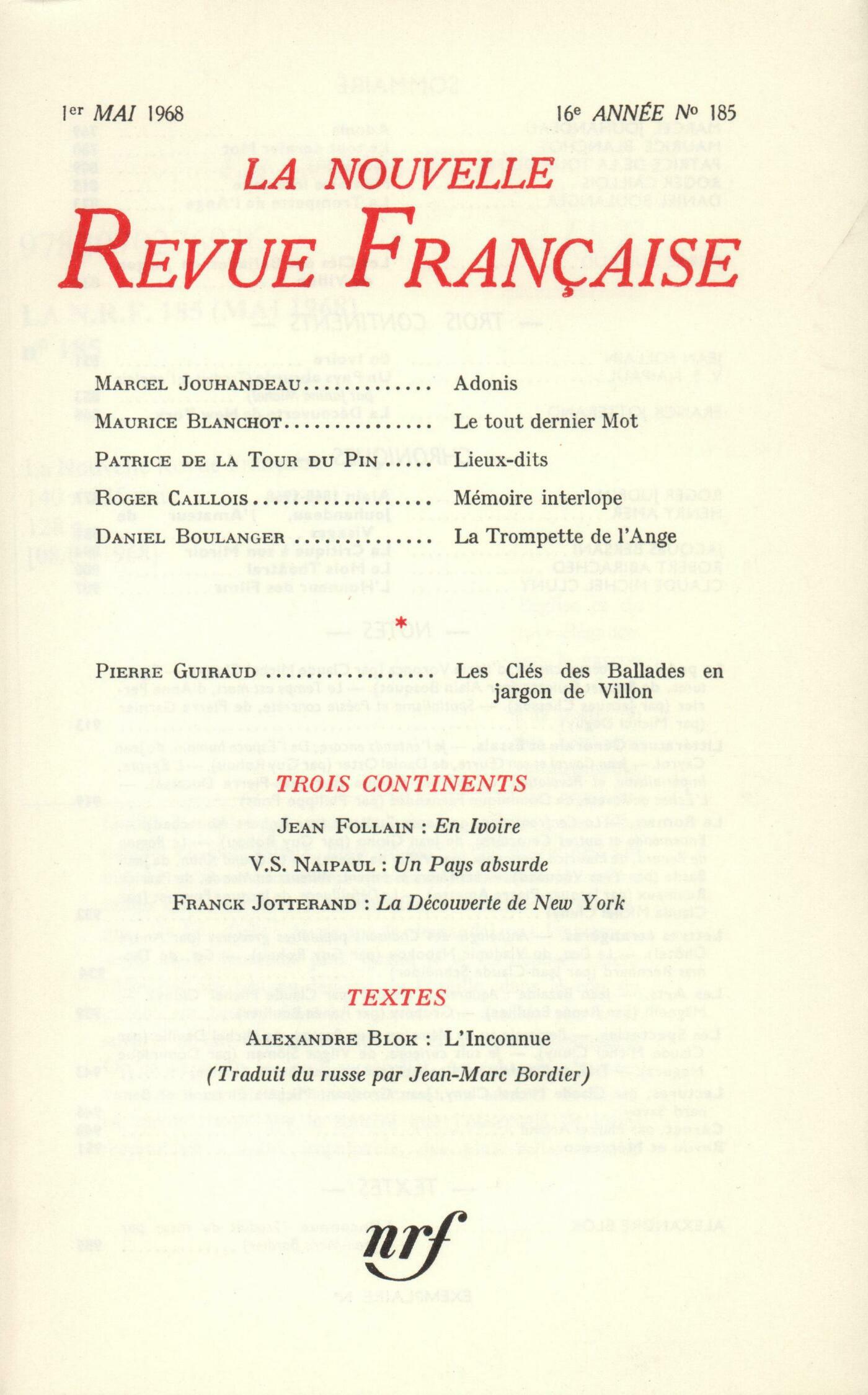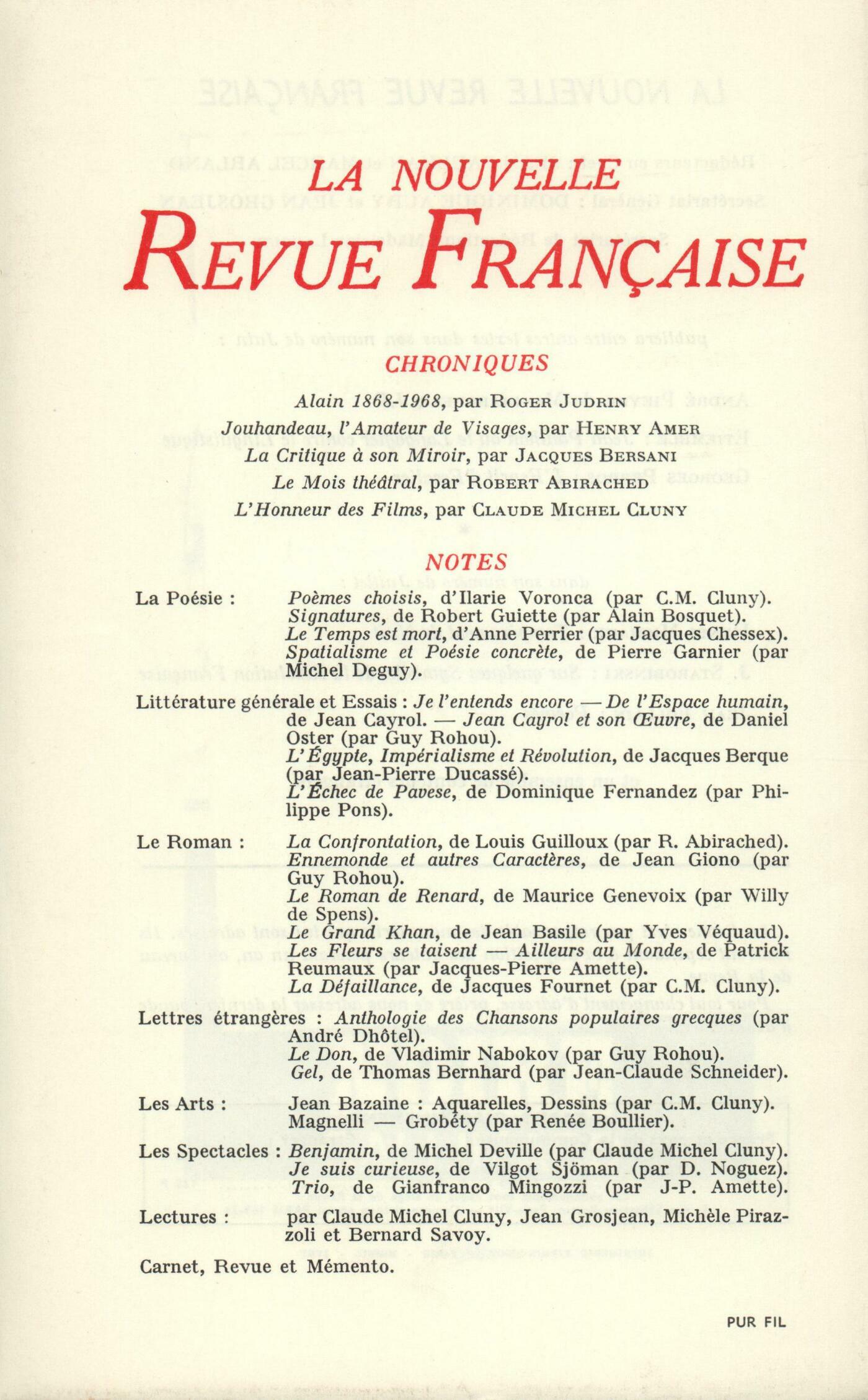 Marcel Jouhandeau, AdonisMaurice Blanchot, Le tout dernier motPatrice de La Tour du Pin, Lieux-ditsRoger Caillois, Mémoire interlopeDaniel Boulanger, La trompette de l'ange Les petits oncles L'ébénistePierre Guiraud, Les clés des Ballades en jargon de VillonTrois continents : Jean Follain, En IvoireV.S. Naipaul, Un pays absurdeFranck Jotterand, La découverte de New YorkChroniques : Roger Judrin, Alain 1868-1968Henry Amer, Jouhandeau, l'amateur de visagesJacques Bersani, La critique ŕ son miroirRobert Abirached, Le mois théâtralClaude Michel Cluny, L'honneur des filmsNotes : la poésie : Claude Michel Cluny, Počmes choisis, d'Ilarie Voronca (Seghers)Alain Bosquet, Signatures, par Robert Guiette (André de Rache)Jacques Chessex, Le temps est mort, par Anne Perrier (Payot)Michel Deguy, Spatialisme et poésie concrčte, par Pierre Garnier (Gallimard)Notes : littérature générale et essais : Guy Rohou, Je l'entends encore, par Jean Cayrol (Le Seuil) - De l'espace humain, par Jean Cayrol (Le Seuil) - Jean Cayrol et son uvre, par Daniel Oster (Le Seuil)Jean-Pierre Ducassé, L'Égypte, par Jacques Berque (Gallimard)Philippe Pons, L'échec de Pavese, par Dominique Fernandez (Grasset)Notes : le roman : Robert Abirached, La Confrontation, par Louis Guilloux (Gallimard)Guy Rohou, Ennemonde et autres caractčres, par Jean Giono (Gallimard)Willy de Spens, Le Roman de Renard, par Maurice Genevoix (Plon)Yves Véquaud, Le Grand Khan, par Jean Basile (Grasset)Jacques-Pierre Amette, Les fleurs se taisent, par Patrick Reumaux (Gallimard) - Ailleurs au monde, par Patrick Reumaux (Gallimard)Claude Michel Cluny, La Défaillance, par Jacques Fournet (Gallimard)Notes : lettres étrangčres : André Dhôtel, Anthologie des chansons populaires grecques (Gallimard)Guy Rohou, Le Don, par Vladimir Nabokov (Gallimard)Jean-Claude Schneider, Gel, par Thomas Bernhard (Gallimard)Notes : les arts : Claude Michel Cluny, Aquarelles, dessins, de Jean Bazaine (Galerie Maeght)Renée Boullier, Magnelli (Musée d'Art moderne) - Grobéty (Galerie Jeanne Castel)Notes : les spectacles : Claude Michel Cluny, Benjamin ou Les mémoires d'un puceau, de Michel DevilleDominique Noguez, Je suis curieuse, de Vilgot SjömanJacques-Pierre Amette, Trio, de Gianfranco MingozziLectures : Claude Michel Cluny, Počmes, d'Elisabeth Laurila (Seghers)Bernard Savoy, La comédie française au XVIIIe sičcle, par Claude Alasseur (Mouton)Jean Grosjean, La Marne, par A. Goutard (Laffont)Michčle Pirazzoli-t'Serstevens, Récits d'une vie fugitive, par Chen Fou (Gallimard)Marcel Arland, Carnet Anonymes, Revue - MémentoTextes : Alexandre Blok, L'inconnue Les pas du commandeur