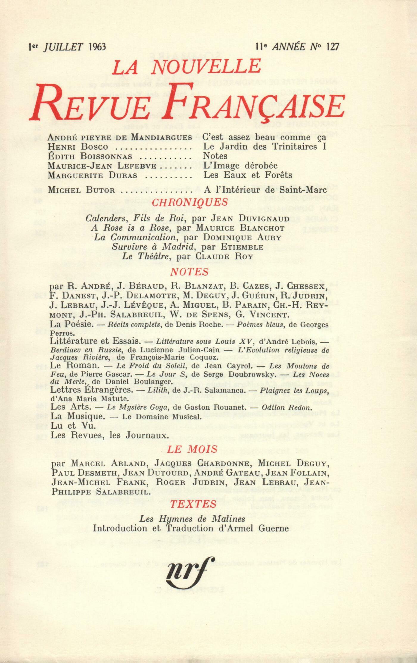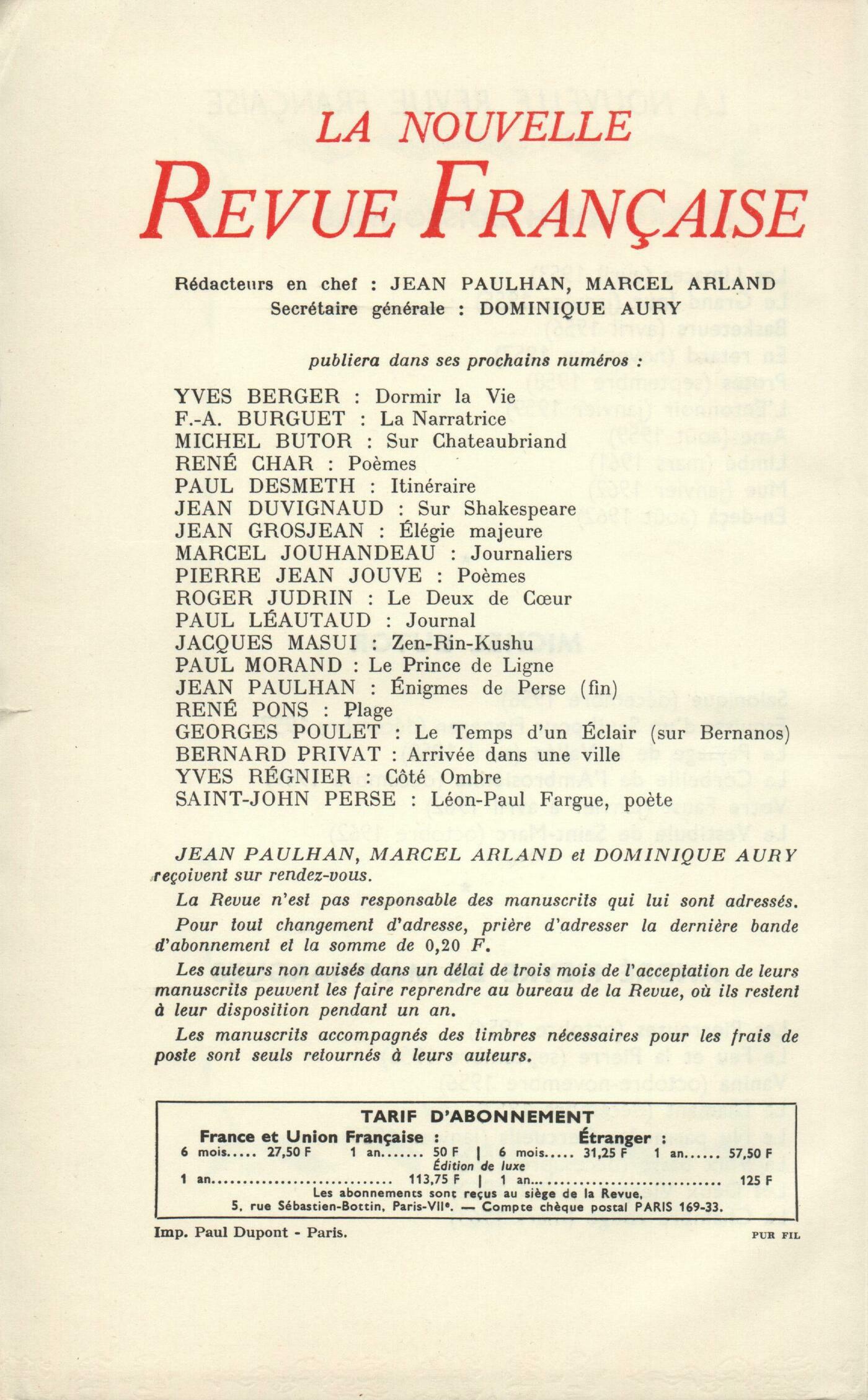André Pieyre de Mandiargues, C'est assez beau comme çaHenri Bosco, Le Jardin des TrinitairesÉdith Boissonnas, NotesMaurice-Jean Lefebve, L'Image dérobéeMarguerite Duras, Les Eaux et ForętsMichel Butor, Ŕ l'intérieur de Saint-MarcChroniques : Maurice Blanchot, A Rose is a Rose...Dominique Aury, La CommunicationJean Duvignaud, Calenders, Fils de RoiClaude Roy, Le roi Brook, le roi Vilar et le duc Fresnay Étiemble, Survivre ŕ MadridNotes : la poésie : Michel Deguy, Récits complets, par Denis Roche Robert André, Počmes bleus, par Georges Perros Notes : littérature et essais : Willy de Spens, Littérature sous Louis XV, par André Lebois Roger Judrin, Jean-Jacques Rousseau, par Marcel Raymond Brice Parain, Berdiaev en Russie, par Lucienne Julien-Cain Roger Judrin, L'évolution religieuse de Jacques Rivičre, par François-Marie Coquoz Notes : le roman : Roger Blanzat, Le froid du soleil, par Jean Cayrol Charles-Henry Reymont, Les moutons de feu, par Pierre Gascar Jean-Paul Delamotte, Le jour S, par Serge Doubrowsky Willy de Spens, Les noces du merle, par Daniel Boulanger Notes : lettres étrangčres : Willy de Spens, Lilith, par J. R. Salamanca - Plaignez les loups!, par Ana Maria Matute Notes : les arts : Jean Lebrau, Le mystčre Goya, par Gaston Rouanet Frank Dunand, Odilon Redon Notes : la musique : Francis Danest, Le domaine musicalLu et vu : André Miguel, Je parle de l'Obscur, par Jean Todrani Jean Lebrau, Le Lieu et la Formule, par Jean Digot André Miguel, Supplément d'âme, par Roland Busselen Gilbert Vincent, Lettres au Petit Corsaire, par Colette André Miguel, La Nuit de Mougins, par Roger Vrigny Gilbert Vincent, Tamerlan, par Jean-Pierre Attal Willy de Spens, Aux balcons du ciel, par Jean Freustié Jacques Chessex, Sans alcool, par Alice Rivaz Gilbert Vincent, Le Septičme Sexe, par Alain Ancelot Bernard Cazes, Karl Marx, par Isaiah Berlin Robert André, Un été australien, par Colin MacInnes Willy de Spens, Une maničre de mourir, par Mario Monteforte Toledo Jean-Jacques Lévęque, Alechinsky - André Bloc Janine Béraud, Aquarelles d'Estčve Jean-Philippe Salabreuil, Brauer Les revues : André Dalmas - Anonymes, CommercePierre Leyris, Ŕ propos de John ClareJacques Masui, Hermčs Anonymes, DiversLe mois : Jacques Chardonne, Lettre ŕ Jean RostandMarcel Arland, Mathieu au Musée d'art moderneJean Follain, Chronique du goűtJean Dutourd, Le jeteur de perlesPaul Desmeth, Mieux qu'une aventure Jean Lebrau, Brindilles Jean-Philippe Salabreuil, Clotilde Jean-Michel Frank, Partour dans le soleil Michel Deguy, Les racketers du passé André Gateau, Deux počmes Roger Judrin, Le chien Textes Armel Guerne, Ŕ propos d'une poésie généralement inconnue Anonymes, Les Hymnes de Matines