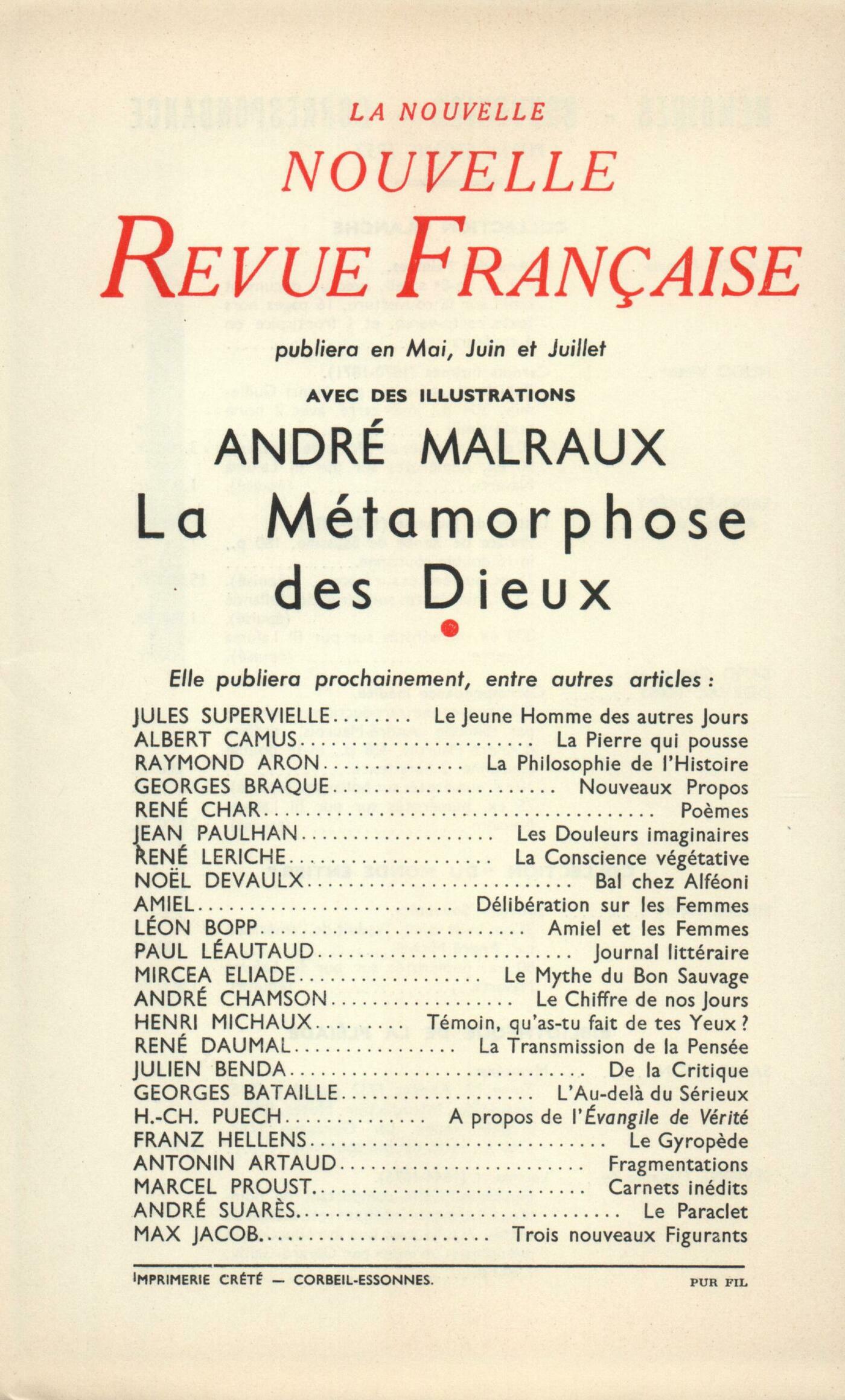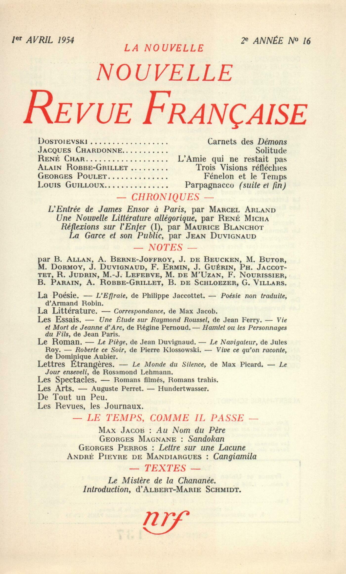 Fédor Dostoïevski, Carnets des DémonsJacques Chardonne, SolitudeRené Char, L'Amie qui ne restait pasAlain Robbe-Grillet, Trois Visions réfléchiesGeorges Poulet, Fénelon et le TempsLouis Guilloux, Parpagnacco (Fin)Chroniques : recherches : Maurice Blanchot, Réflexions sur l'Enfer (I)Marcel Arland, L'entrée de James Ensor à ParisChroniques : le théâtre : Jean Duvignaud, La Garce et son publicRené Micha, Une nouvelle littérature allégoriqueNotes : la poésie : Maurice-Jean Lefebve, L'Effraie et autres poésies, par Philippe Jaccottet (Gallimard)Philippe Jaccottet, Poésie non traduite, par Armand Robin (Gallimard)Notes : la littérature : Georges Perros, Correspondance, de Max Jacob (Éditions de Paris)Notes : les essais : Michel Butor, Une étude sur Raymond Roussel, par Jean Ferry (Arcanes)Roger Judrin, Vie et mort de Jeanne d'Arc, par Régine Pernoud (Hachette)Jean Duvignaud, Hamlet ou Les personnages du fils, par Jean Paris (Éditions du Seuil)Notes : le roman : Alain Robbe-Grillet, Le Piège, par Jean Duvignaud (Gallimard)France Ermin, Le Navigateur, par Jules Roy (Gallimard)Brice Parain, Roberte ce soir, par Pierre Klossowski (Éditions de Minuit)France Ermin, Vive ce qu'on raconte, par Dominique Aubier (Éditions du Seuil)Notes : lettres étrangères : Roger Judrin, Le Monde du Silence, par Max Picard (Presses Universitaires de France) - Le Jour enseveli, par Rosamond Lehmann (Plon)Notes : les spectacles : François Nourissier, Romans filmés, romans trahisNotes : les arts : Marie Dormoy, Auguste PerretAndré Berne-Joffroy, Hundertwasser (Studio Paul Facchetti)De tout un peu : Jean de Beucken, Des mille Collines aux neuf Volcans, par Marie Gevers (Stock)Michel de M'Uzan, Psychanalyse de Paris, par Frédéric Hoffet (Grasset)Gilbert Villars, Les Faux Abandons, par Jean Guirec (Albin Michel)Blaise Allan, Antoine et Cléopâtre, de Shakespeare (Théâtre des Champs-Élysées)Jean Duvignaud, Théâtre, de Federico Garcia Lorca (Gallimard) - Théâtre, V, de Luigi Pirandello (Gallimard) - Richard II, de Shakespeare (T. N. P.) - Ruy Blas, de Victor Hugo (T. N. P.) - Jacques Copeau, le Réformateur, par Georges Lerminier (Presses Littéraires de France)Gilbert Villars, "Leurs coeurs", à la Radiodiffusion FrançaiseLes revues, les journaux : Claude Le Maguet, Un poèmeJean Guérin, Chez les écrivains professionnels (Suite) - Le crime ne paie pasHenri, dit Le Douanier Rousseau, Une lettreJean Guérin, DiversLe temps, comme il passe : Max Jacob, Au Nom du PèreAndré Pieyre de Mandiargues, CangiamilaGeorges Perros, Lettre sur une lacuneGeorges Magnane, SandokanTextes : Jehan Michel, Le Mistère de la Chananée
