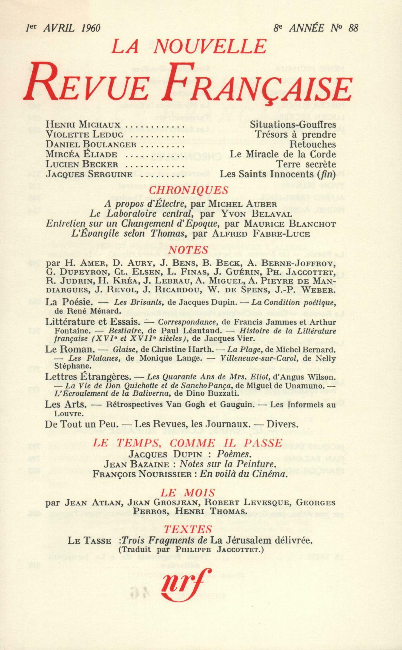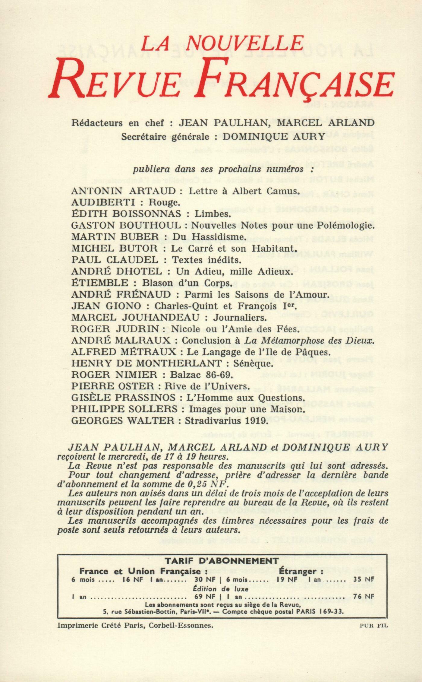 Henri Michaux, Situations-Gouffres (I)Violette Leduc, Trésors ŕ prendreDaniel Boulanger, RetouchesMircea Eliade, Le ŤMiracle de la Cordeť et la préhistoire du spectacleLucien Becker, Terre secrčteJacques Serguine, Les Saints Innocents (Fin)Chroniques : recherches : Maurice Blanchot, Entretien sur un changement d'époqueChroniques : Yvon Belaval, Le Laboratoire central (II)Alfred Fabre-Luce, L'Évangile selon ThomasMichel Auber, Ŕ propos d'ÉlectreNotes : la poésie : André Miguel, Les Brisants, par Jacques Dupin (G. L. M.)Henry Amer, La Condition poétique, par René Ménard (Gallimard)Notes : littérature et essais : Roger Judrin, Correspondance, de Francis Jammes et Arthur Fontaine (Gallimard)Claude Elsen, Bestiaire, par Paul Léautaud (Grasset)Roger Judrin, Histoire de la littérature française (XVIe et XVIIe sičcles), par Jacques Vier (Armand Colin)Notes : le roman : Jean Ricardou, Glaise, par Christine Harth (Julliard)Jean-Paul Weber, La Plage, par Michel Bernard (Julliard)Jacques Bens, Les Platanes, par Monique Lange (Gallimard)Béatrix Beck, Villeneuve-sur-Carol, par Nelly Stéphane (N. R. F.)Notes : lettres étrangčres : Dominique Aury, Les quarante ans de Mrs. Eliot, par Angus Wilson (Stock)Willy de Spens, La Vie de Don Quichotte et de Sancho Pança, par Miguel de Unamuno (Albin Michel) - Un fondateur de la libre pensée, par Louis-Philippe May (Albin Michel)André Miguel, L'Écroulement de la Baliverna, par Dino Buzzati (Laffont)Notes : les arts : Jean Revol, Rétrospectives Van Gogh et Gauguin (Musée Jacquemard-André et Galerie Charpentier)André Berne-Joffroy, Les Informels au LouvreDe tout un peu : Philippe Jaccottet, Charles Vildrac, par Georges Bouquet et Pierre Menanteau (Seghers)André Pieyre de Mandiargues, Počmes, par E.-L.-T. Mesens (Le Terrain Vague)Jacques Bens, Marges du temps, par Alexandre Arnoux (Arthčme Fayard)Henry Amer, Tęte-de-Nčgre, par Maurice Fourré (Gallimard)Jean Lebrau, Journal de Jean Lagny, par Jacques Chabrier (Debresse)Henri Kréa, L'Hydre, par Guillaume Loubet (Seuil)Willy de Spens, Le Panache blanc, par Gilbert Ganne (Gallimard)Jacques Bens, La Rose et le Sel, par Serge Malaval (Gallimard)Lucette Finas, Les Fiançailles, par Goffredo Parise (Gallimard)Les revues, les journaux : Jean Guérin, D'un hommage ŕ Camus - Que dire ŕ nos filles - Sur Valery Larbaud - DiversLe temps, comme il passe : Jacques Dupin, PočmesJean Bazaine, Notes sur la peintureFrançois Nourissier, En voilŕ du cinéma!Le mois : Robert Levesque, Noël ŕ AgadirJean Grosjean, La treille et la maisonGeorges Perros, SuiteHenri Thomas, T. V. Atlan, Une lettreTextes : Le Tasse, Trois fragments de la Jérusalem délivrée