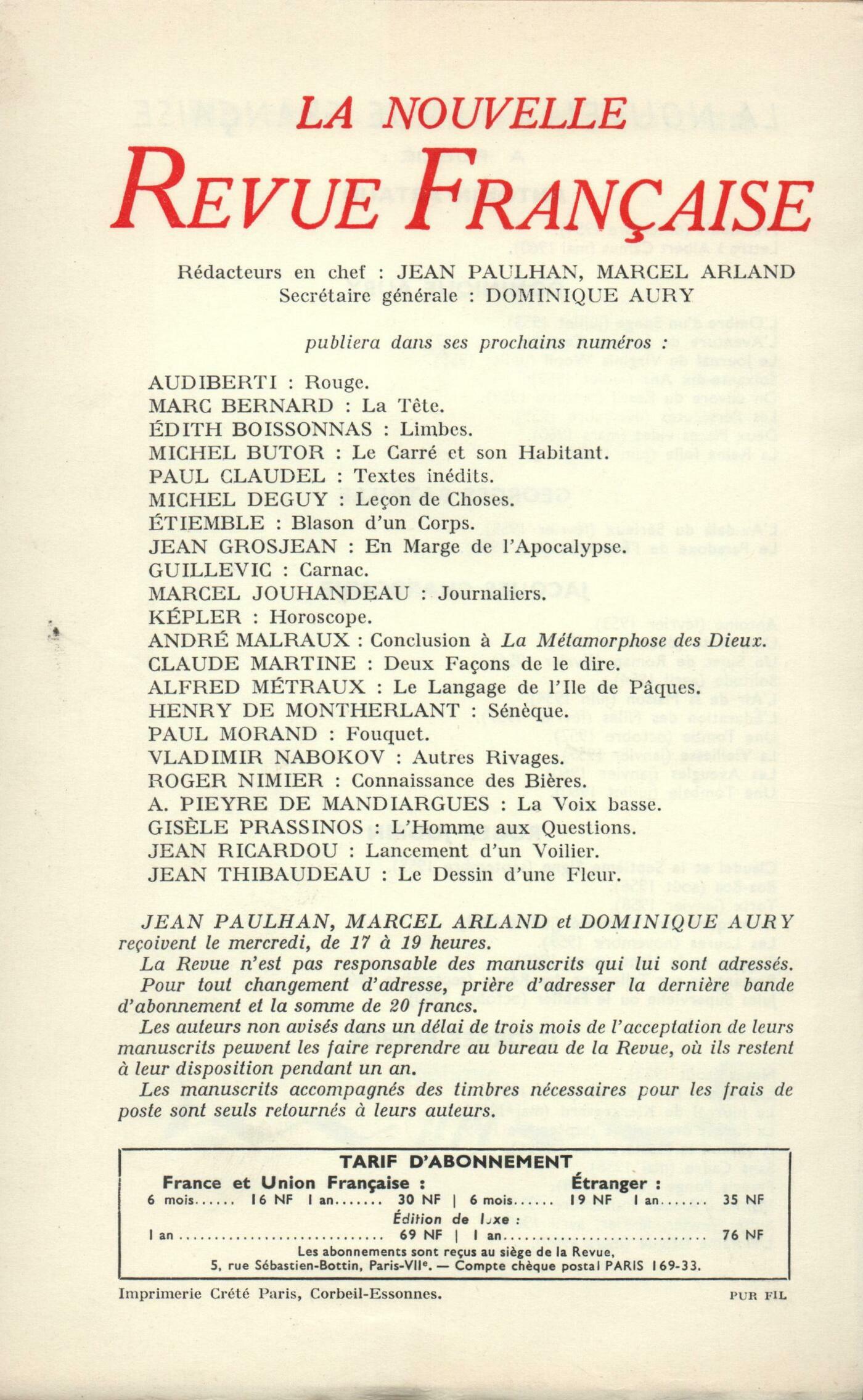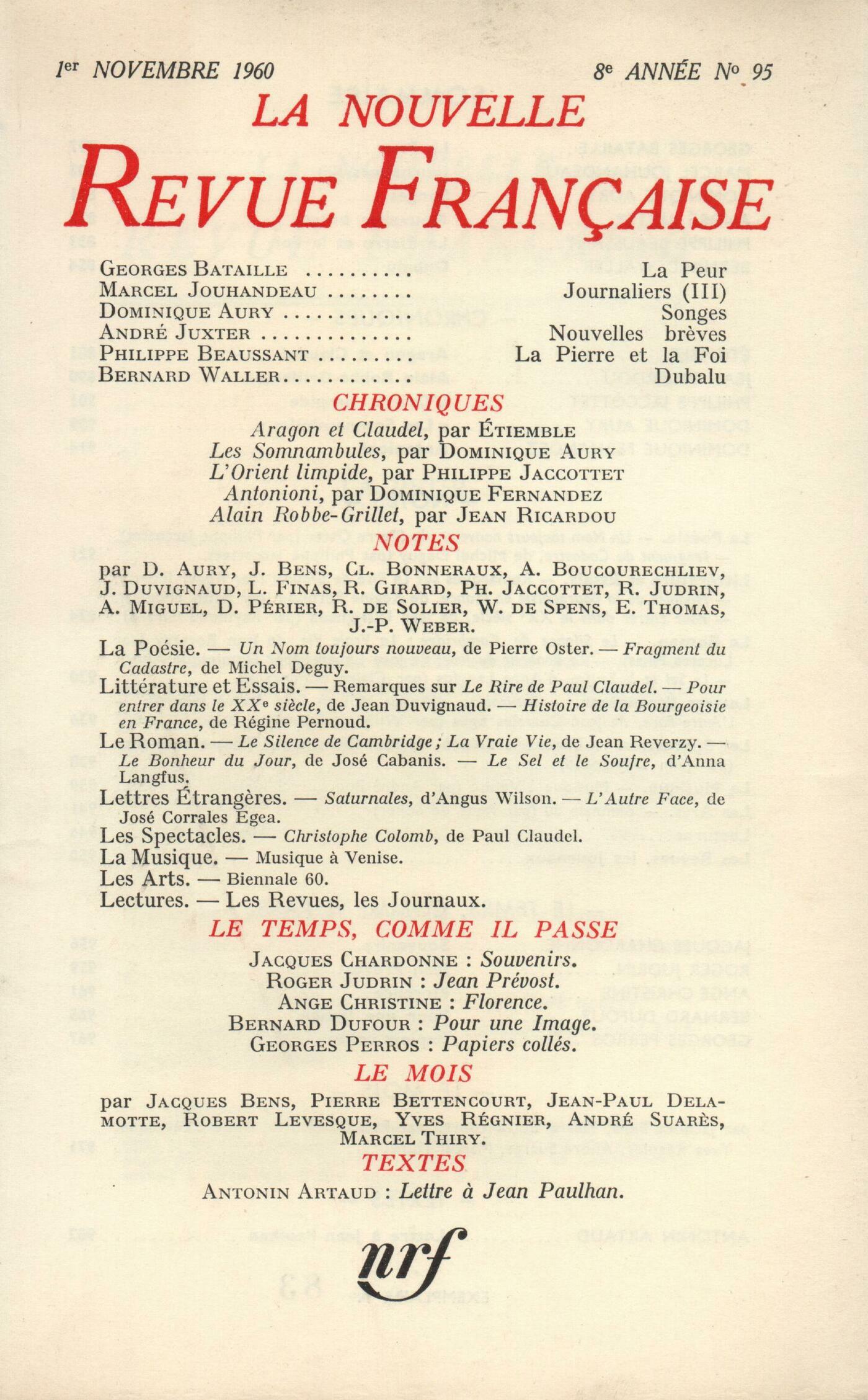 Georges Bataille, La PeurMarcel Jouhandeau, Journaliers (III)Dominique Aury, SongesAndré Juxter, Nouvelles brčvesPhilippe Beaussant, La Sculpture romane ou Le jeu de la pierre et de la foiBernard Waller, DubaluChroniques : Étiemble, Aragon et ClaudelJean Ricardou, Description et infraconscience chez Alain Robbe-GrilletPhilippe Jaccottet, L'Orient limpideDominique Aury, Les SomnambulesChroniques : le cinéma : Dominique Fernandez, Antonioni, počte du matriarcatNotes : la poésie : Philippe Jaccottet, Un Nom toujours nouveau, par Pierre Oster (Gallimard) - Fragment du cadastre, par Michel Deguy (Gallimard)Notes : littérature et essais : Roger Judrin, Remarques sur Paul ClaudelRaymond Girard, Pour entrer dans le XXe sičcle, par Jean Duvignaud (Grasset)Édith Thomas, Histoire de la bourgeoisie en France, I, par Régine Pernoud (Le Seuil)Notes : le roman : Lucette Finas, Le Silence de Cambridge, par Jean Reverzy (Les Lettres Nouvelles)Dominique Aury, Le Bonheur du jour, par José Cabanis (Gallimard)Claire Bonneraux, Le Sel et le Soufre, par Anne Langfus (Gallimard)Notes : lettres étrangčres : André Miguel, Saturnales, par Angus Wilson (Stock)Willy de Spens, L'Autre Face, par José Corrales Egea (Gallimard)Notes : les spectacles : Jean Duvignaud, Reprise de Christophe Colomb au Théâtre de FranceNotes : la musique : André Boucourechliev, Musique ŕ VeniseNotes : les arts : René de Solier, Biennale 60Notes : lectures : Willy de Spens, Antonin Artaud, le suicidé de la société, par Jean Hort (Éditions Connaître)Denis Périer, Un Amour pour rien, par Jean d'Ormessson (Julliard) - Le Congrčs d'Aix, par Solange Fasquelle (Julliard) - La Tentation du Cardinal, par Jean-Jacques Thierry (Gallimard) - Le Temps de Chartres, par Maurice Clavel (Julliard)Jean-Paul Weber, Le Secret des autres, par Gabrielle Rollin (Gallimard)Jacques Bens, Un Dimanche ŕ la campagne, par Claude Sylvian (Gallimard)Dominique Aury, La Termitičre, par Daniel Gillčs (Gallimard)Les revues, les journaux : Jacques Dupin, Deux počmesJean Guérin, Autour des éditeurs (suite)Robert Kanters, L'amour tel qu'on le chanteJean Guérin, DiversLe temps, comme il passe : Jacques Chardonne, SouvenirsRoger Judrin, Jean Prévost ou Le lion obéissantAnge Christine, FlorenceBernard Dufour, Pour une imageGeorges Perros, Papiers collésLe mois : André Suarčs, PharisJean-Paul Delamotte, Inconnaissance d'Aix-en-ProvenceYves Régnier, Le carillonJacques Bens, Drôle de libertéRobert Levesque, Naissance d'une RépubliqueMarcel Thiry, Vue des femmesPierre Bettencourt, Espaces limités (II)Textes : Antonin Artaud, Lettre ŕ Jean Paulhan