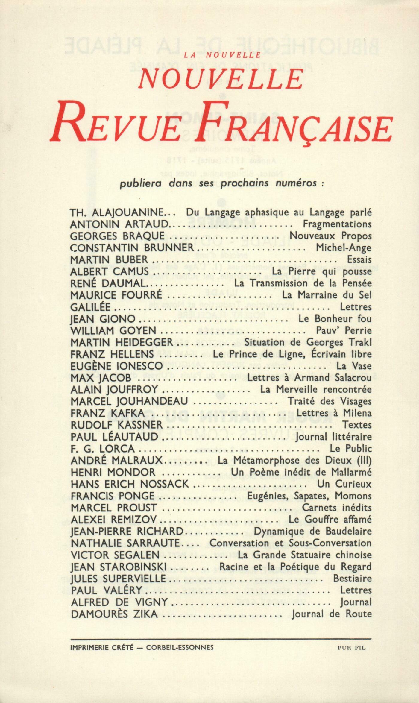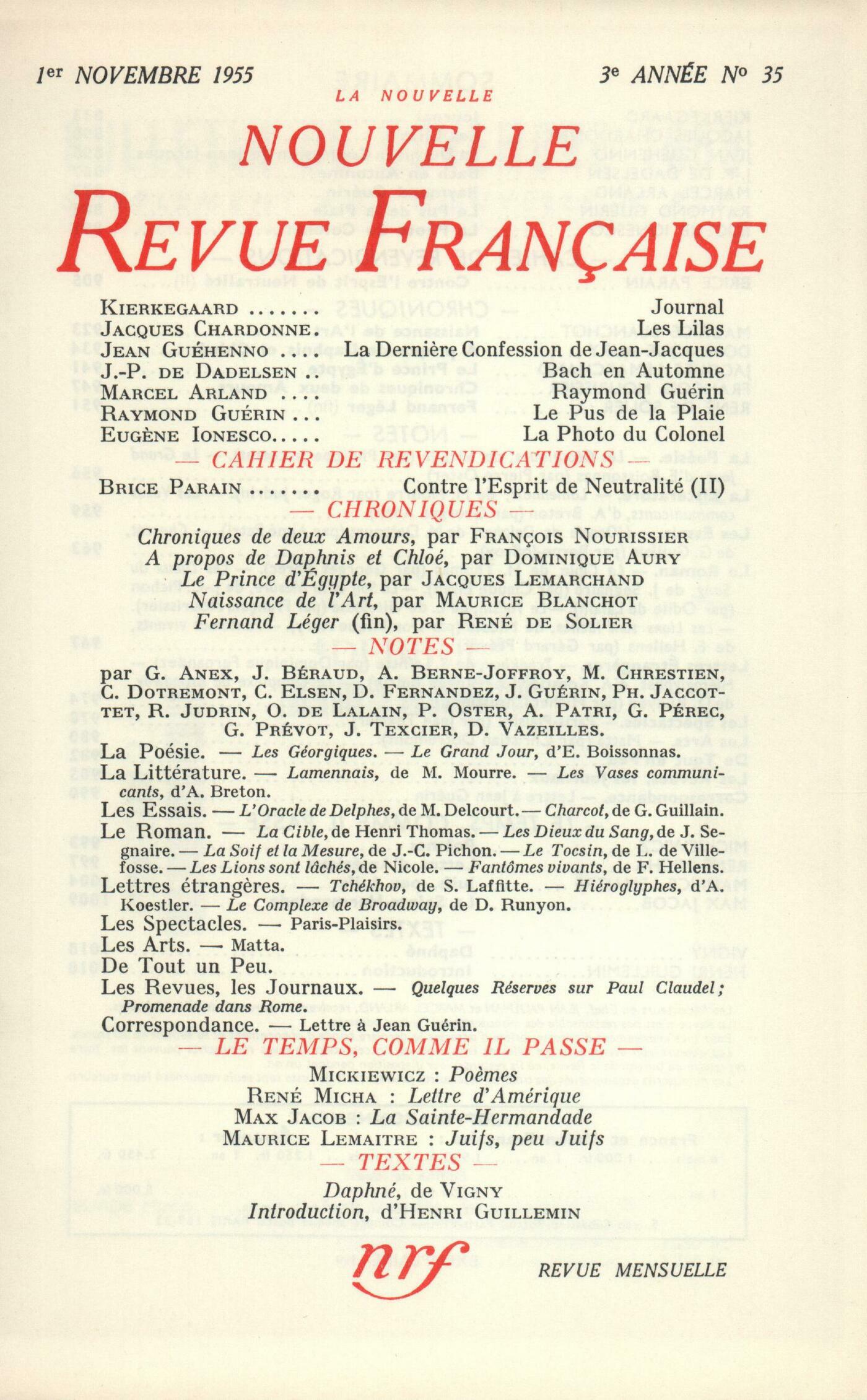 Sören Kierkegaard, Journal 1849 (Fragments)Jacques Chardonne, Les LilasJean Guéhenno, La derničre confession de Jean-JacquesJean-Paul de Dadelsen, Bach en automneMarcel Arland, Raymond GuérinRaymond Guérin, Le Pus de la PlaieEugčne Ionesco, La Photo du ColonelCahier de revendications : Brice Parain, Contre l'esprit de neutralité (II)Choniques : recherches : Maurice Blanchot, Naissance de l'ArtChroniques : Dominique Aury, Ŕ propos de Daphnis et ChloéChroniques : le théâtre : Jacques Lemarchand, Le Prince d'ÉgypteChroniques : le cinéma : François Nourissier, Chroniques de deux amoursChroniques : René de Solier, Léger (Fin)Notes : la poésie : Philippe Jaccottet, Les Géorgiques, par Virgile (Rencontre)Pierre Oster, Le Grand Jour, par Édith Boissonnas (Gallimard)Notes : la littérature : Roger Judrin, Lamennais ou L'hérésie des Temps Modernes, par Michel Mourre (Amiot-Dumont)Georges Anex, Les Vases communicants, par André Breton (Gallimard)Notes : les essais : Aimé Patri, L'Oracle de Delphes, par Marie Delcourt (Payot)André Berne-Joffroy, J.-M. Charcot, par Georges Guillain (Masson)Notes : le roman : Georges Perec, La Cible, par Henri Thomas (Gallimard)Claude Elsen, Les Dieux du Sang, par Julien Segnaire (Gallimard)Odile de Lalain, La Soif et la Mesure, par Jean-Charles Pichon (Stock)François Nourissier, Le Tocsin, par Louis de Villefosse (Julliard)Dominique Aury, Les Lions sont lâchés, par Nicole (Julliard)Gérard Prévot, Fantômes vivants, par Franz Hellens ((Albin Michel)Notes : lettres étrangčres : Dominique Fernandez, Tchékhov par lui-męme, par Sophie Laffitte (Seuil)Roger Judrin, Hiéroglyphes, par Arthur Koestler (Calmann-Lévy)Michel Chrestien, Le Complexe de Broadway, par Damon Runyon (Gallimard)Notes : les spectacles : Jean Texcier, Paris-PlaisirsNotes : les arts : Christian Dotremont, MattaDe tout un peu : Claude Elsen, Promenades dans Rome, par Stendhal (J.-J. Pauvert)Jean Guérin, Cahiers, d'A. de Chateaubriant (Grasset) - Le Gros Lot, par Christian Murciaux (Plon)Odile de Lalain, Le Vin d'orage, par Jean Proal (Julliard)Janine Béraud, il pour oeil, par Vahé Katcha (Plon)Dominique Vazeilles, Juyungo, par Adalberto Ortiz (Gallimard)Jacques Lemarchand, Histoire de rire, d'Armand Salacrou (Théâtre Saint-Georges) - Procčs de famille, de Diego Fabbri (L'uvre)Les revues, les journaux : François Mauriac - Jean Guérin, Quelques réserves sur Paul ClaudelMichel Cournot, Promenade dans RomeJean Grenier, Germaine Richier, sculpteur du terrible Anonymes, DiversCorrespondance : Jacques Jauloin, Lettre ŕ Jean GuérinLe temps, comme il passe : Adam Mickiewicz, PočmesRené Micha, Lettre d'AmériqueJules Lemaitre, Juifs, peu juifsMax Jacob, La Sainte-HermandadeTextes : Alfred de Vigny, Daphné