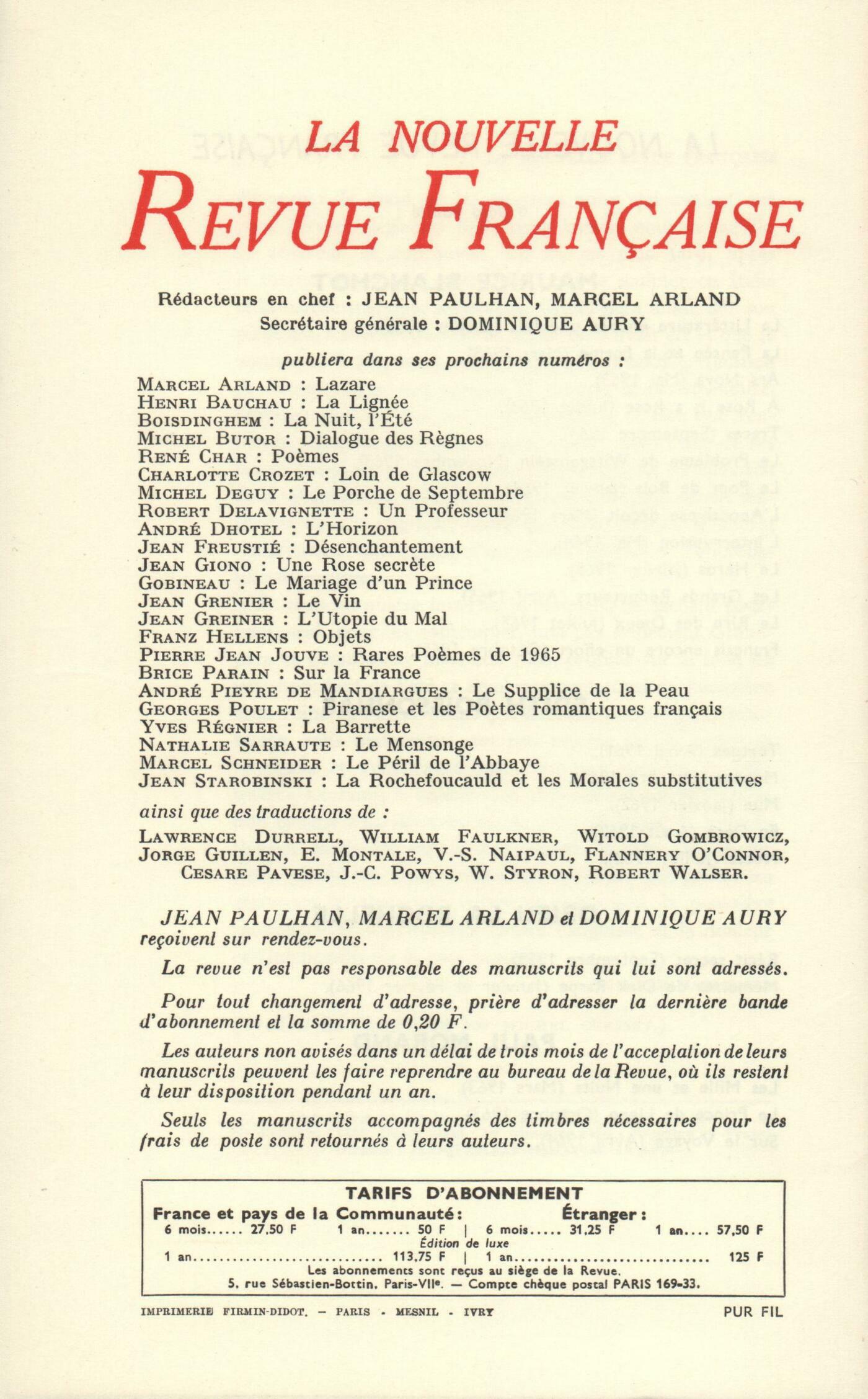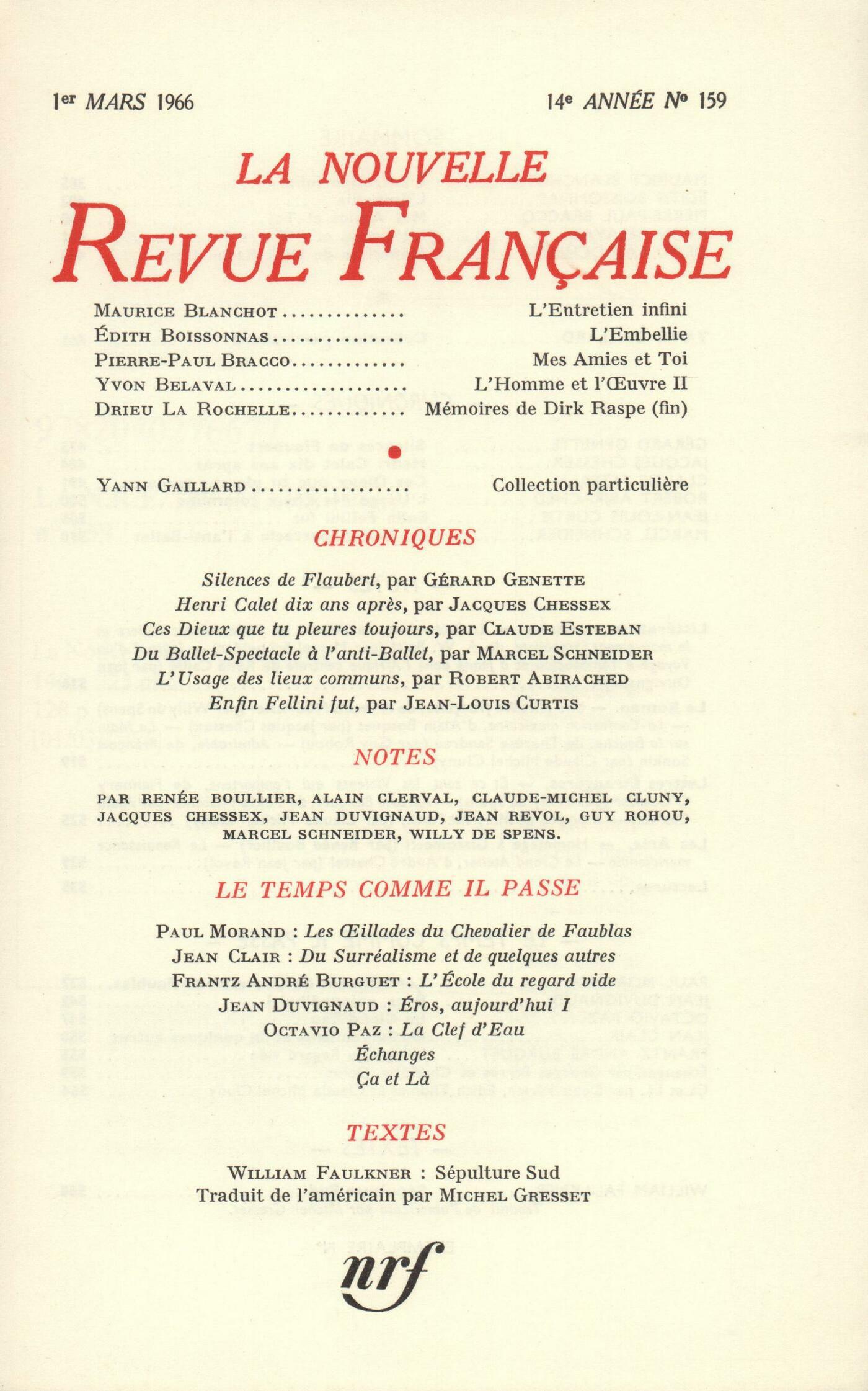 Maurice Blanchot, L'Entretien infiniÉdith Boissonnas, L'EmbelliePierre-Paul Bracco, Mes amies et toiYvon Belaval, L'Homme et l'uvre (Fin)Pierre Drieu la Rochelle, Mémoires de Dirk Raspe (Fin)Yann Gaillard, Collection particuličreChroniques : Gérard Genette, Silences de FlaubertJacques Chessex, Henri Calet dix ans aprčsClaude Esteban, Ces Dieux que tu pleures toujours...Robert Abirached, L'usage des lieux communsJean-Louis Curtis, Enfin Fellini futMarcel Schneider, Du ballet-spectacle ŕ l'anti-balletNotes : littérature et essais : Marcel Schneider, Le Prétendant, par Villiers de L'Isle-Adam (Corti) - Villiers et le mouvement symboliste, par A.-W. Raitt (Corti)Jean Duvignaud, Journal d'un voyage ŕ Tombouctou et ŕ Jenné dans l'Afrique centrale, par René Caillé (Éditions Anthropos)Notes : le roman : Willy de Spens, Une Histoire française, par François Nourissier (Grasset)Jacques Chessex, La Confession mexicaine, par Alain Bosquet (Grasset)Guy Rohou, La main sur la bouche, par Thérčse Sandreau (Gallimard)Claude Michel Cluny, Admirable, par François Sonkin (Denoël)Notes : lettres étrangčres : Willy de Spens, Et ce sont les violents qui l'emportent, par Flannery O'Connor (Gallimard)Alain Clerval, Aprčs le banquet, par Yukio Mishima (Gallimard)Claude Michel Cluny, A propos de Mary McCarthyNotes : les arts : Renée Boullier, Hommage ŕ GiacomettiJean Revol, La Renaissance méridionale, par André Chastel (Gallimard) - Le Grand Atelier, par André Chastel (Gallimard)Lectures : Willy de Spens, Qui vive, par Jacques Lanzmann (Denoël) - Les Miroirs et les Chaînes, par Francis Garnung (Albin Michel) - Les Saisons, par Maurice Pons (Julliard) - Une pyramide sur la mer, par Michel Bataille (Robert Laffont)Le temps comme il passe : Paul Morand, Les illades du chevalier de FaublasJean Duvignaud, Éros, aujourd'huiOctavio Paz, La clef d'eauJean Clair, Du surréalisme et de quelques autresFrantz André Burguet, L'école du regard videÉchanges : Georges Perros, Une maladie ŕ reboursCharlotte Delbo, Les leçons de JouvetTextes : Denis Périer - Édith Thomas - Claude Michel Cluny, Çŕ et lŕWilliam Faulkner, Sépulture Sud