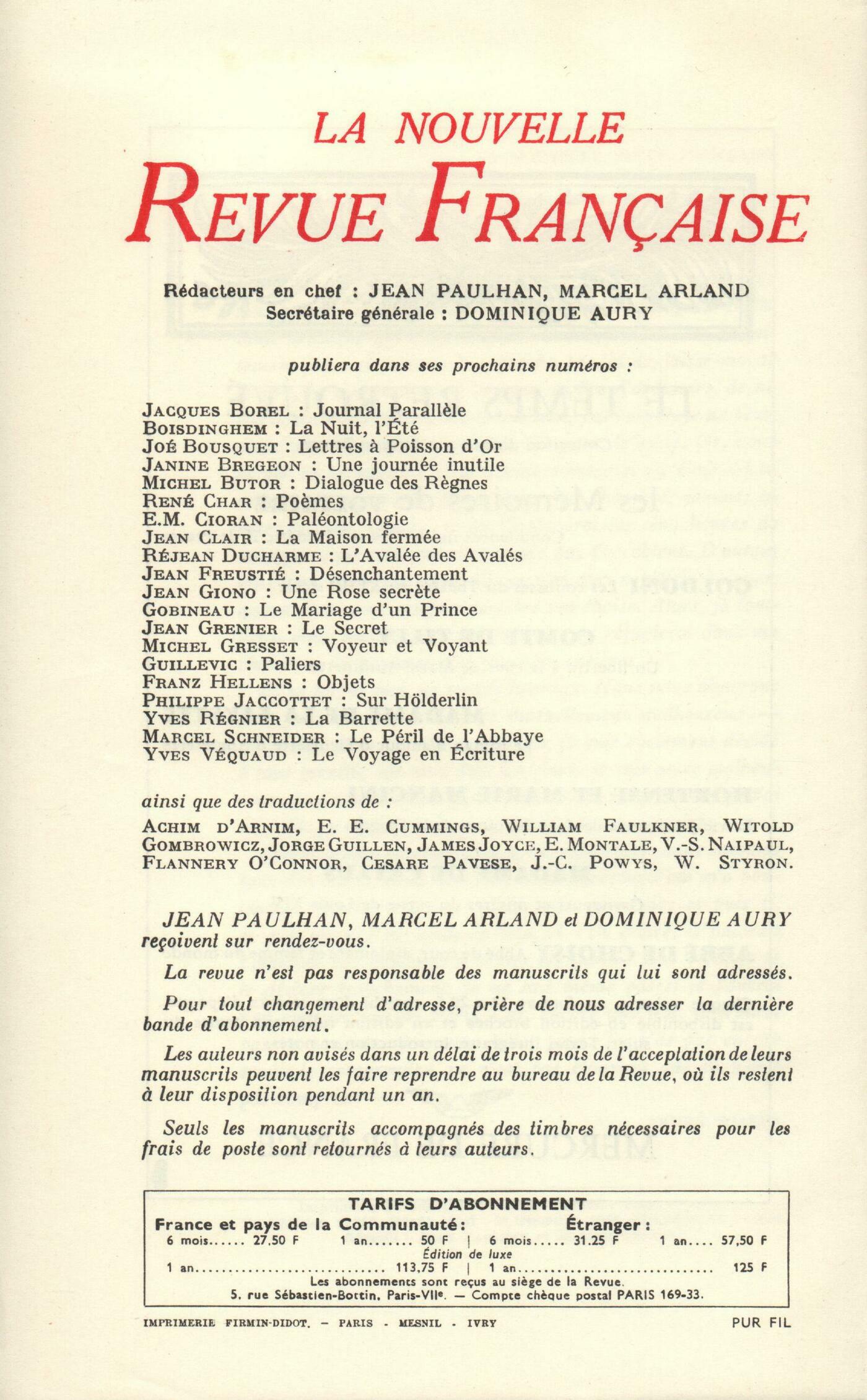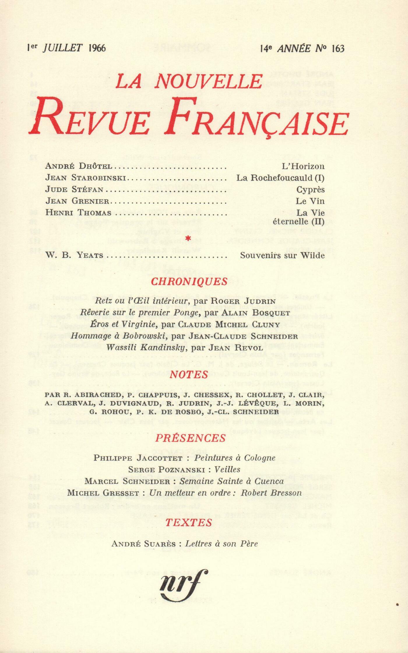André Dhôtel, L'HorizonJean Starobinski, La Rochefoucauld et les morales substitutivesJude Stéfan, CyprčsJean Grenier, Le vinHenri Thomas, La Vie éternelle (II)William Butler Yeats, Souvenirs sur WildeChroniques : Roger Judrin, Retz ou L'il intérieurAlain Bosquet, Ręverie sur le premier PongeClaude Michel Cluny, Éros et VirginieJean-Claude Schneider, Hommage ŕ BobrowskiJean Revol, Wassili KandinskyNotes : la poésie : Pierre Chappuis, Počmes tunisiens, par Roland Brachetto (Mercure de France) - Ombres, par Jean-Paul Burgart (Mercure de France)Notes : littérature et essais : Roger Judrin, Mémoires pour Catherine II, de Diderot (Garnier)Robert Abirached, Propos comme ça, par Jacques Chardonne (Grasset)Jean Duvignaud, Brisées, par Michel Leiris (Mercure de France)Louis Morin, La Face humaine, par Pierre Emmanuel (Le Seuil)Alain Clerval, Les Événements de Palerme, par Dominique Fernandez (Grasset)Notes : le roman : Jacques Chessex, Le Déluge, par J. M. G. Le Clézio (Gallimard)Guy Rohou, La Quarantaine, par Jean-Louis Curtis (Julliard)Alain Clerval, La Robe, par Bruno Gay-Lussac (Gallimard)Notes : lettres étrangčres : Patrick de Rosbo, Toits pointus, par Dorothy Richardson (Mercure de France)Roland Chollet, L'Oiseau bariolé, par Jerzy Kosinski (Flammarion)Jean-Claude Schneider, Paysage en béton, par Jakov Lind (Gallimard)Notes : les arts : Jean Clair, Balthus ou Les métempsycosesJean-Jacques Lévęque, Jacques Doucet (Galerie Dina Vierny)Présences : Philippe Jaccottet, Peintures ŕ CologneSerge Poznanski, VeillesMarcel Schneider, Semaine Sainte ŕ CuencaMichel Gresset, Un metteur en ordre : Robert BressonÇŕ et lŕ : Pierre Bourgeade, Jean Paulhan et les philosophesDenis Périer, Mésaventures d'un sculpteur Anonymes, Revue - MémentoTextes : André Suarčs, Lettres ŕ son pčre