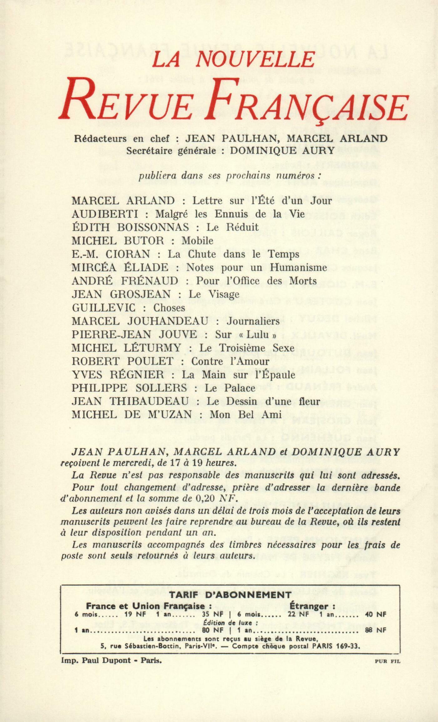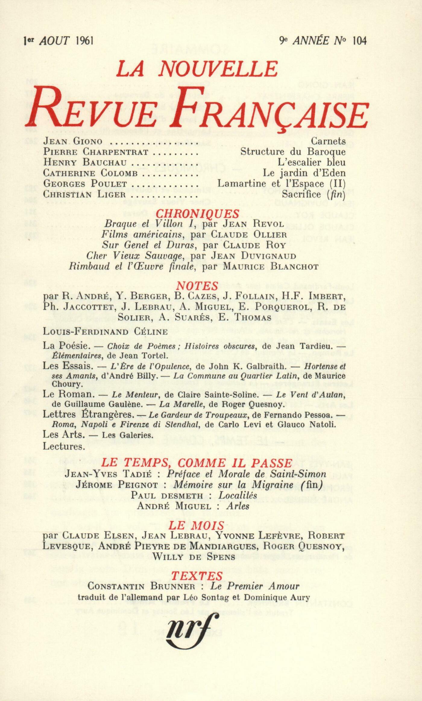Jean Giono, CarnetsPierre Charpentrat, Remarques sur la structure de l'espace baroqueHenry Bauchau, L'escalier bleuCatherine Colomb, Le jardin d'ÉdenGeorges Poulet, Lamartine et le sentiment de l'espace (Fin)Christian Liger, Sacrifice (Fin)Chroniques : Maurice Blanchot, Rimbaud et l'uvre finaleJean Duvignaud, Cher vieux sauvageClaude Roy, Sur Genet et DurasClaude Ollier, Films américainsJean Revol, Braque et Villon, message vivant du cubismeNotes : André Suarčs, Ŕ propos de CélineNotes : la poésie : Philippe Jaccottet, Choix de počmes, de Jean Tardieu (Gallimard) - Histoires obscures, par Jean Tardieu (Gallimard) - Élémentaires, par Jean Tortel (Mermod)Notes : les essais : Bernard Cazes, L'čre de l'opulence, par John K. Galbraith (Calmann-Lévy)Édith Thomas, Hortense et ses amants, par André Billy (Flammarion)Jean Follain, La Commune au Quartier latin, par Maurice Choury (Club des Amis du Livre progressiste)Notes : le roman : Yves Berger, Le Menteur, par Claire Sainte-Soline (Grasset)Élisabeth Porquerol, Le vent d'autan, par Guillaume Gaulčne (Gallimard)Robert André, La Marelle, par Roger Quesnoy (Grasset)Notes : lettres étrangčres : Philippe Jaccottet, Le Gardeur de troupeaux, par Fernando Pessoa (Gallimard)Henri-François Imbert, Roma, Napoli e Firenze di Stendhal, par Carlo Levi et Glauco Natoli (Parenti)Notes : les arts : René de Solier, Burri (Galerie de France) - Foldes (Galerie Rive Droite) - Chillida (Galerie Maeght)Notes : lectures : André Miguel, L'Arbre de l'avenir, par André Marissel (Subervie)Philippe Jaccottet, Ce crissement de faulx, par Jean-Louis Depierris (Médianes) - Ombre gardienne, par Mohammed Dib (Gallimard)Jean Lebrau, Albert Aurier, par Pierre de Gorsse (Comminges)Le temps, comme il passe : Jean-Yves Tadié, Préface et morale de Saint-SimonPaul Desmeth, LocalitésJérôme Peignot, Mémoire sur la migraine (Fin)André Miguel, En ArlesLe mois : Roger Quesnoy, Pour la paresseAlejandra Pizarnik, L'absentWilly de Spens, Le tour du monde en douze cents pagesJean Lebrau, BrindillesRobert Levesque, Éloge du dimancheYvonne Lefčvre, TourismeClaude Elsen, L'amour des bętesTextes : Constantin Brunner, Le Premier Amour