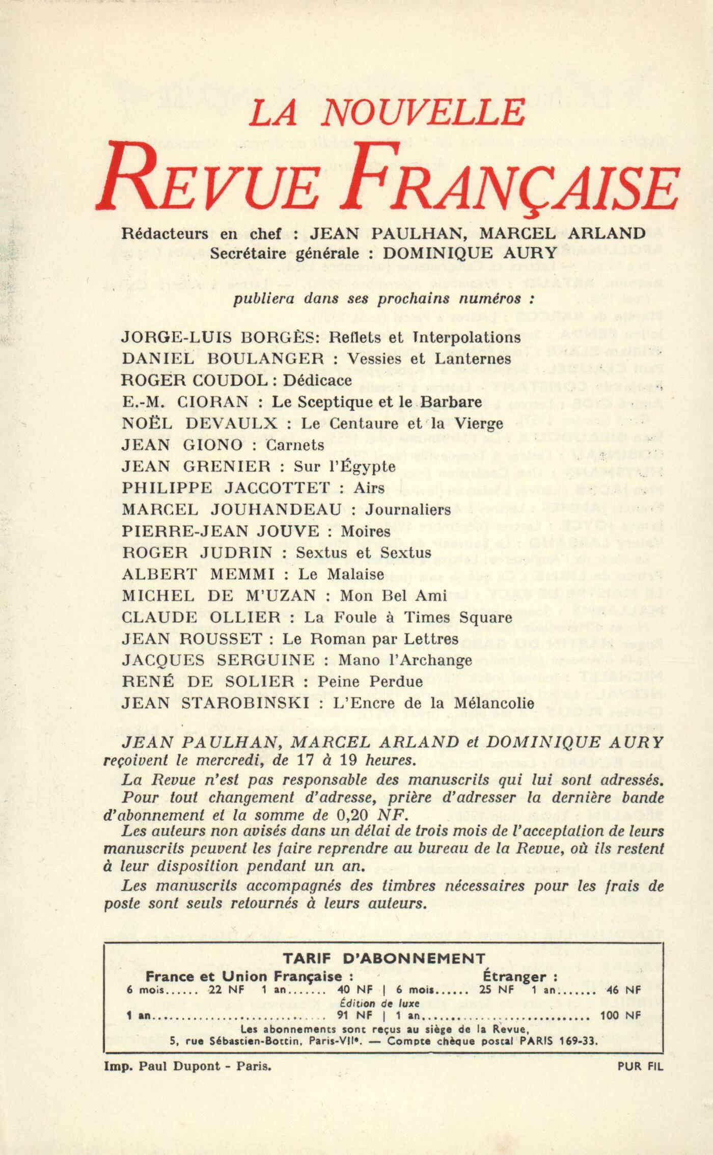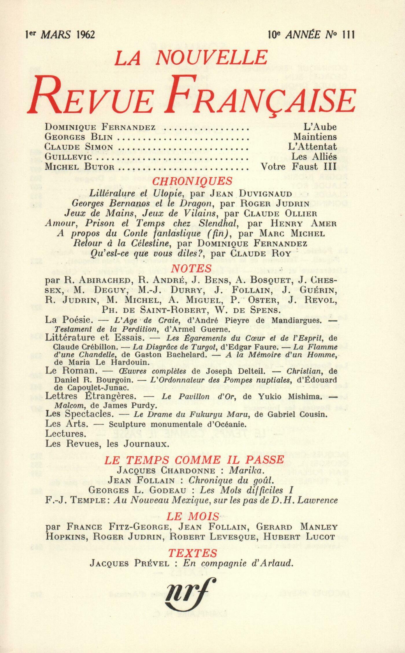 Dominique Fernandez, L'AubeGeorges Blin, MaintiensClaude Simon, L'AttentatEugčne Guillevic, Les AlliésMichel Butor - Henri Pousseur, Votre Faust (III)Chroniques : Henry Amer, Amour, prison et temps chez StendhalJean Duvignaud, Littérature et utopieMarc Michel, Ŕ propos du conte fantastique (Fin)Roger Judrin, Georges Bernanos et le DragonChroniques : le théâtre : Claude Roy, Qu'est-ce que vous dites?Chroniques : Claude Ollier, Jeux de mains, jeux de vilainsDominique Fernandez, Retour ŕ La CélestineNotes : la poésie : André Miguel, L'Âge de craie, par André Pieyre de Mandiargues (Gallimard)Alain Bosquet, Testament de la perdition, par Armel Guerne (Desclée de Brouwer)Notes : littérature et essais : Marie-Jeanne Durry, Les Égarements du Cur et de l'Esprit, par Claude Crébillon (Armand Colin)Philippe de Saint-Robert, La Disgrâce de Turgot, par Edgar Faure (Gallimard)Michel Deguy, La Flamme d'une chandelle, par Gaston Bachelard (P. U. F.) - Ŕ la mémoire d'un homme, par Maria Le Hardouin (Buchet-Chastel)Notes : le roman : Marc Michel, uvres complčtes, de Joseph Delteil (Grasset)Robert André, Christian, par Daniel R. Bourgoin (Gallimard)Jacques Chessex, L'Ordonnateur des pompes nuptiales, par Édouard de Capoulet-Junac (Gallimard)Notes : lettres étrangčres : Roger Judrin, Le Pavillon d'Or, par Yukio Mishima (Gallimard) - Malcom, par James Purdy (Gallimard)Notes : les spectacles : Robert Abirached, Le Drame du Fukuryu Maru, par Gabriel Cousin (Gallimard)Notes : les arts : Jean Revol, Sculpture monumentale d'Océanie (Galerie Jeanne Bucher)Notes : lectures : Pierre Oster, Le Cur définitif, par René Guy Cadou (Seghers)André Miguel, Odes courtes, par Jean Séaux (Éditions des Artistes)Jean Follain, Introduction ŕ la Liturgie, par Aimé-Georges Mortimort (Desclée de Brouwer)Jacques Bens, La Main paternelle, par Renée Massip (Gallimard)Willy de Spens, Un Monsieur de compagnie, par André Couteaux (Grasset)André Miguel, La quatričme personne du singulier, par Lawrence Ferlinghetti (Julliard)Les revues : André Thérive, Auguste Comte ŕ MoscouGabriel Bounoure, Pierre Reverdy dans sa crise religieuseJean Guérin, DiversLe temps, comme il passe : Jacques Chardonne, MarikaGeorges-L. Godeau, Les mots difficilesJean Follain, Chronique du goűtFrédéric-Jacques Temple, Au Nouveau-Mexique sur les pas de D.-H. LawrenceLe mois : Roger Judrin, Vies de JésusGerard Manley Hopkins, Henry PurcellJean Follain, Jeux et jouets d'autrefoisFrance Fitz-George, Mars en CapricorneHubert Lucot, L'humanité de GuillevicRobert Levesque, Une paresse méthodiqueTextes : Jacques Prevel, En compagnie d'Artaud (Fin)