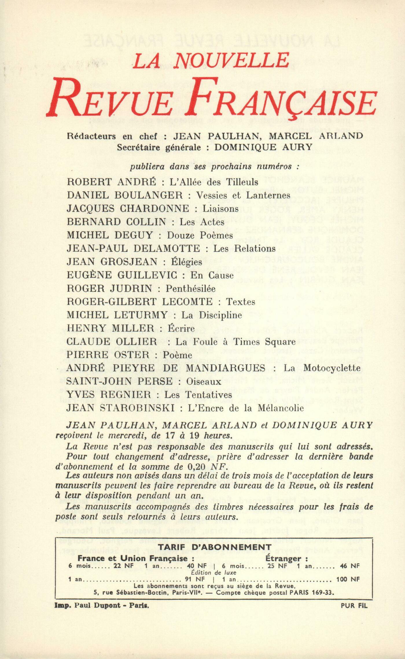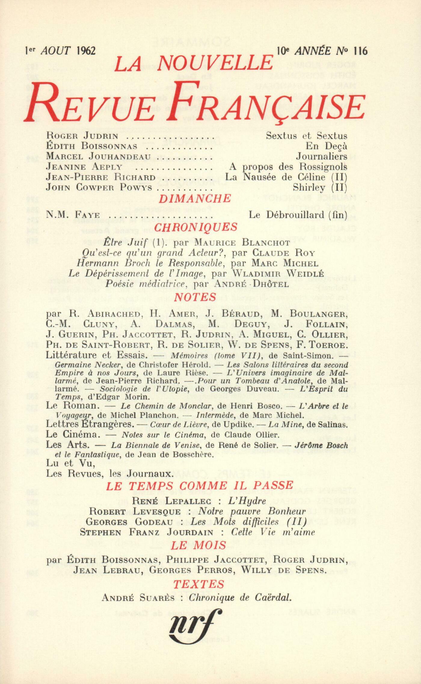 Roger Judrin, Sextus et SextusÉdith Boissonnas, En deçŕMarcel Jouhandeau, JournaliersJanine Aeply, Ŕ propos des rossignolsJean-Pierre Richard, La Nausée de Céline (Fin)John Cowper Powys, Shirley (II)Dimanche : N.-M. Faye, Le Débrouillard (Fin)Chroniques : Maurice Blanchot, Ętre Juif (I)André Dhôtel, Poésie médiatriceMarc Michel, Hermann Broch le responsableClaude Roy, Qu'est-ce qu'un grand acteur?Wladimir Weidlé, Le Dépérissement de l'imageNotes : Dominique Aury, William FaulknerNotes : littérature et essais : André Dalmas, Mémoires, VII, de Saint-Simon (Gallimard)Philippe de Saint-Robert, Germaine Necker de Staël, par J. Christopher Herold (Plon)Roger Judrin, Les Salons littéraires parisiens du Second Empire ŕ nos jours, par Laure Ričse (Privat)Henry Amer, L'Univers imaginaire de Mallarmé, par Jean-Pierre Richard (Le Seuil) - Pour un tombeau d'Anatole, par Stéphane Mallarmé (Le Seuil)Maurice-Jean Lefebve, Le Pluralisme dramatique de Georges Sorel, par Georges Goriély (Marcel Rivičre et Cie)Jean Follain, Sociologie de l'utopie, par Georges Duveau (Presses Universitaires de France)Michel Deguy, L'Esprit du Temps, par Edgar Morin (Grasset)Notes : le roman : Willy de Spens, Le Chemin de Monclar, par Henri Bosco (Gallimard)Michel Boulanger, L'Arbre et le Voyageur, par Michel Planchon (Gallimard)Willy de Spens, Intermčde, par Marc Michel (Gallimard)Notes : lettres étrangčres : François Toeroe, Cur de ličvre, par John Updike (Le Seuil)Michel Boulanger, La Mine, par Armando Lopez Salinas (Gallimard)Notes : le cinéma : Claude Ollier, Les Oliviers de la Justice, de James Blue - Le rendez-vous de minuit, de Roger LeenhardtNotes : les arts : René de Solier, Biennale de VeniseAndré Miguel, Jérôme Bosch et le Fantastique, par Jean de Bosschčre (Albin Michel)Lu et vu : Philippe Jaccottet, L'Espace est un miroir, par Jules Tordjman (Subervie) - La Langue des fumées, par Pierre Albert Jourdan (José Corti)Jean Guérin, Poésies, de Jean Vernay (Mercure de France)Jean Paulhan, Sauver la guerre, par Gaston Bouthoul (Grasset)Odile de Lalain, Le cas d'Albert Camus, par Anne Durand (Fischbacher)Robert Abirached, L'Aquarium, par Jacques Godbout (Le Seuil)Claude Michel Cluny, Guillaume Apollinaire (Théâtre Mercur)Janine Béraud, Jean Lombard (Galerie Synthčse)Michel Deguy, Gouaches, d'Alexandre Calder (La Hune) - Cycle, de Michel Butor (La Hune)Les revues : Jean Guérin, Ŕ propos de l'échec d'EddingtonPierre Teilhard de Chardin, Un hymne ŕ la MatičreOlivier de Magny, Sur Raymond RousselJean Guérin, DiversLe temps, comme il passe : S. Frantz-Jourdain, Cette vie m'aimeG.-L. Godeau, Les Mots difficiles (II)R. Levesque, Notre pauvre bonheurR. Lepallec, L'HydreLe mois : P. Jaccottet, En cheminÉ. Boissonnas, Dubuffet chez CordierW. de Spens, Six sičcles en six cents pagesJ. Lebrau, Brindilles R. Judrin, Vie et murs du lion G. Perros, Un texte athlétique Textes A. Suarčs, Chronique de Caërdal
