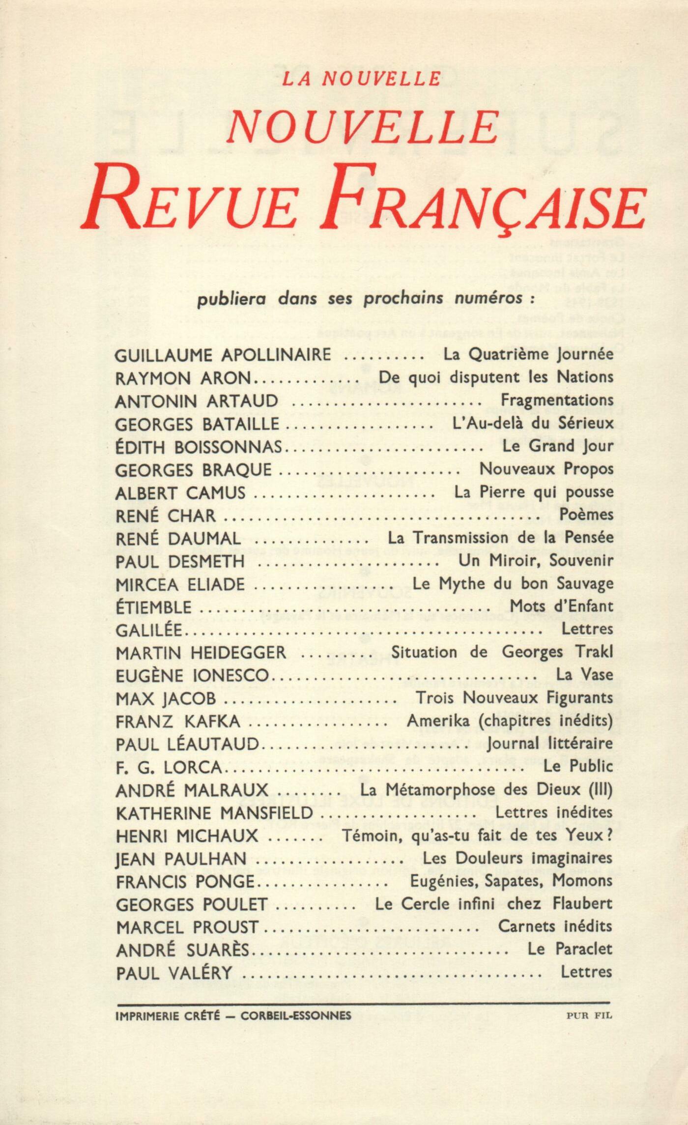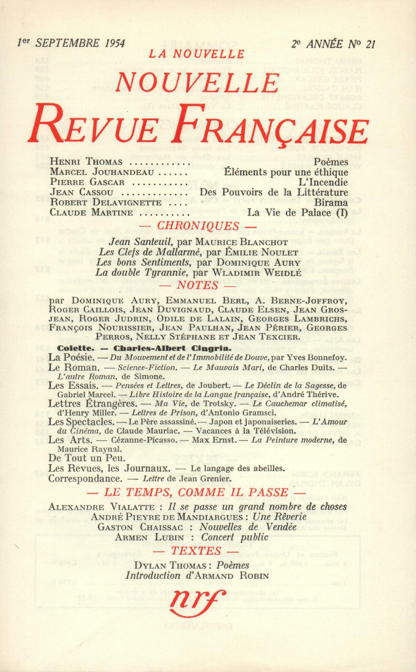Henri Thomas, PočmesMarcel Jouhandeau, Éléments pour une éthiquePierre Gascar, L'IncendieJean Cassou, Des pouvoirs de la littératureRobert Delavignette, BiramaClaude Martine, La Vie de Palace (I)Chroniques : recherches : Maurice Blanchot, Jean SanteuilChroniques : les romans : Dominique Aury, Les bons SentimentsChroniques : Émilie Noulet, Les Clefs de MallarméWladimir Weidlé, La double TyrannieNotes : Dominique Aury, ColetteJean Paulhan, Charles-Albert CingriaNotes : la poésie : Jean Grosjean, Du Mouvement et de l'Immobilité de Douve, par Yves Bonnefoy (Mercure de France)Notes : le roman : Claude Elsen, Science-fictionRoger Judrin, Le mauvais Mari, par Charles Duits (Éditions de Minuit)Odile de Lalain, L'autre Roman, par Simone (Plon)Notes : les essais : Georges Perros, Pensées et Lettres, de Joubert (Grasset)Roger Judrin, Le Déclin de la Sagesse, par Gabriel Marcel (Plon) - Libre histoire de la langue française, par André Thérive (Stock)Notes : lettres étrangčres : Jean Duvignaud, Ma vie, par Trotsky (Gallimard) - Le Cauchemar climatisé, par Henry Miller (Gallimard)Nelly Stéphane, Lettres de la prison, d'Antonio Gramsci (Les Éditions sociales)Notes : les spectacles : Jean Duvignaud, Le Pčre assassinéFrançois Nourissier, Japon et japonaiseries - L'amour du cinéma, par Claude Mauriac (Albin Michel)Emmanuel Berl, VacancesNotes : les arts : André Berne-Joffroy, Cézanne (Orangerie des Tuileries) - Picasso (Maison de la Pensée française)Georges Lambrichs, M. E. [Max Ernst] ou Les Fidčles Ruptures (Galerie Édouard Lb)Jean Guérin, La peinture moderne, par Maurice Raynal (Skira)De tout un peu : Odile de Lalain, Le Droit Chemin, par Silvia Monfort (Julliard) - Le Carnet de Vengeance, par André Beucler (Albin Michel) - L'Estuaire, par Anne Pollier (Gallimard)Jean Périer, Un Acte d'amour, par Alfred Hayes (Stock)Roger Caillois, Anthologie de la poésie brésilienne contemporaine, par A. D. Tavares-Bastos (Pierre Tisné)Jean Texcier, Une chanteuse populaireLes revues, les journaux : Jean Paulhan, Sur l'accent anglais de Jacques ChardonneFernand Auberjonois, La sarigue, la mouffette et le raton laveurÉmile Benveniste - M. B. J. S. Haldane - Karl von Frisch - Jean Guérin, La Querelle des AbeillesJean Grenier, Pričre [Nouvelle...]Jean Guérin, DiversCorrespondance : Jean Grenier, Une lettreLe temps, comme il passe : Armen Lubin, Concert publicAlexandre Vialatte, Il se passe un grand nombre de chosesAndré Pieyre de Mandiargues, Une ręverieGaston Chaissac, Nouvelles de VendéeTextes : Armand Robin, Chasseur de mots ŕ l'âge de la pierreDylan Thomas, Počmes