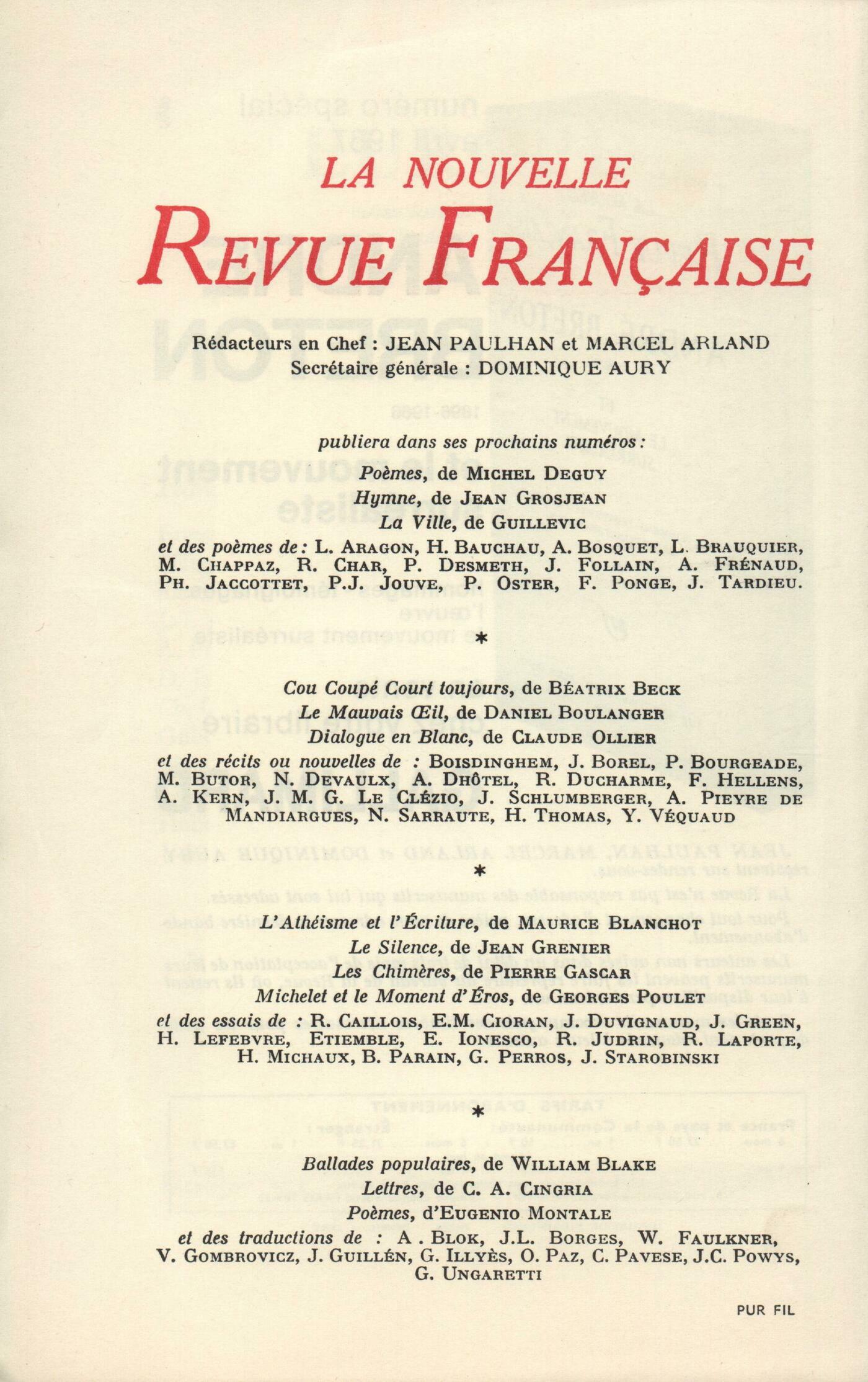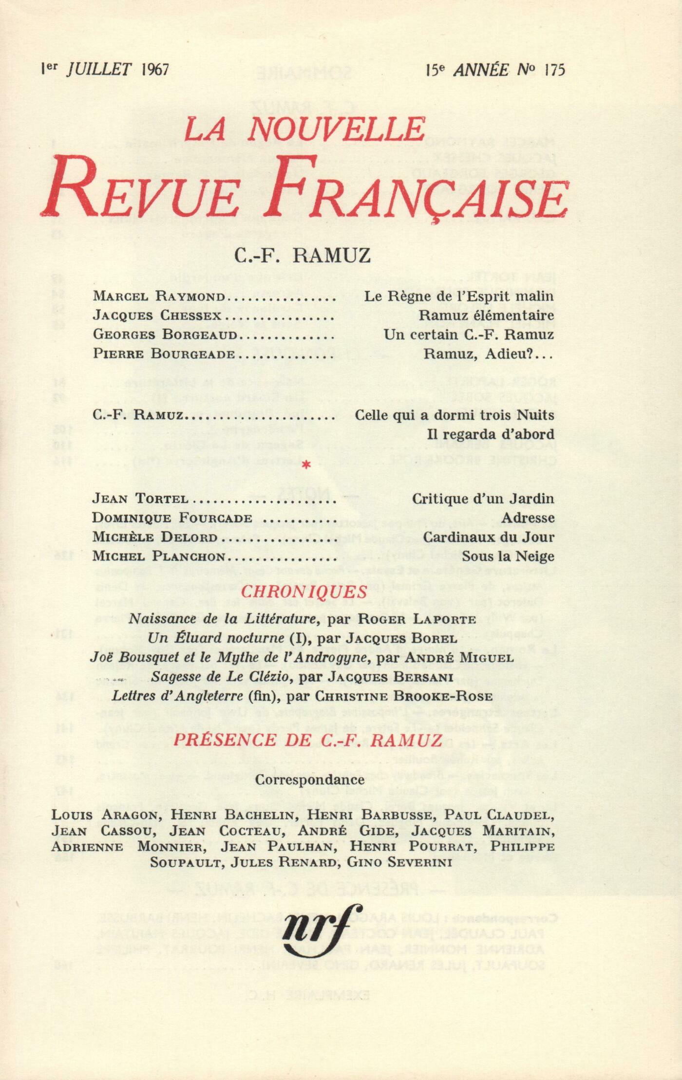C.-F. Ramuz : Marcel Raymond, Le Rčgne de l'Esprit malin et la recherche de la cohérenceJacques Chessex, Ramuz élémentaireGeorges Borgeaud, Un certain C.-F. RamuzPierre Bourgeade, Ramuz, adieu?...Charles-Ferdinand Ramuz, Celle qui a dormi trois nuits - Il regarda d'abord...Jean Tortel, Critique d'un jardinDominique Fourcade, AdresseMichčle Delord, Cardinaux du jourMichel Planchon, Sous la neigeChroniques : Roger Laporte, Naissance de la littératureJacques Borel, Un Éluard nocturneAndré Miguel, Joë Bousquet et le mythe de l'androgyneJacques Bersani, Sagesse de Le ClézioChristine Brooke-Rose, Lettres d'Angleterre (Fin)Notes : la poésie : Jacques Borel, Airs, par Philippe Jaccottet (Gallimard)Claude Michel Cluny, Les Hautes Erres, par Roger Kowalski (Seghers) - Počmes, de Gérard Engelbach (Mercure de France)Notes : littérature générale et essais : Brice Parain, Rome devant César. Mémoires de T. Pomponius Atticus, par Pierre Grimal (Larousse)Yvon Belaval, Correspondance, XIII, de Denis Diderot (Éditions de Minuit)Willy de Spens, Le secret est dans les îles, par Gabriel Marcel (Plon)Pierre Chappuis, La Gravitation poétique, par Jacques Garelli (Mercure de France)Notes : le roman : Guy Rohou, La Marge, par André Pieyre de Mandiargues (Gallimard) - Histoire, par Claude Simon (Éditions de Minuit)Marcel Schneider, Le Nez qui voque, par Réjean Ducharme (Gallimard)Guy Rohou, Navigation vers les îles, par Simonne Jacquemard (Le Seuil)Notes : lettres étrangčres : Jean-Claude Schneider, L'Impossible Biographie, par Uwe Johnson (Gallimard)Claude Michel Cluny, Le Satyre, par James Purdy (Gallimard)Notes : les arts : Renée Boullier, Les Duchamp - La donation Laurens au Grand PalaisNotes : les spectacles : Jean Duvignaud, Broadway chez FabriceClaude Michel Cluny, Jeu de massacre, d'Alain JessuaLu et vu : Claude Michel Cluny, Ŕ l'Est de Dieu, počmes de Pologne, par Guy de Bosschčre Yvon Belaval, Entretiens sur Le Neveu de Rameau, par Michčle Duchet et Michel Launay Dominique Noguez, Entretiens sur André Gide Denis Périer, Les rentrées d'octobre, par Pierre Hulin Jean Grosjean, Brouage, par Michel Bernard - La Fiancée posthume, par Jean-Noël Vuarnet - Armen, par Jean-Pierre Abraham Guy Rohou, Journal d'un vieux fou, par Junichiro Tanizaki Jean-Claude Schneider, Le Train était ŕ l'heure, par Heinrich Böll François Imhoff, Robert Wogensky Anonymes, Revue - MémentoPrésence de C.-F. Ramuz : J. Renard, Une lettre ŕ C.-F. RamuzH. Bachelin, Une lettre ŕ C.-F. RamuzJ. Rivičre, Deux lettres ŕ C.-F. RamuzP. Claudel, Une lettre ŕ C.-F. RamuzP. Soupault, Une lettre ŕ C.-F. RamuzJ. Maritain, Deux lettres ŕ C.-F. RamuzA. Monnier, Une lettre ŕ C.-F. RamuzH. Pourrat, Deux lettres ŕ C.-F. RamuzH. Barbusse, Une lettre ŕ C.-F. RamuzJ. Cassou, Une lettre ŕ C.-F. Ramuz J. Copeau, Deux lettres ŕ C.-F. Ramuz J. Paulhan, Six lettres ŕ C.-F. Ramuz J. Cocteau, Une lettre ŕ C.-F. Ramuz A. Gide, Une lettre ŕ C.-F. Ramuz L. Aragon, Une lettre ŕ C.-F. Ramuz G. Severini, Une lettre ŕ C.-F. Ramuz