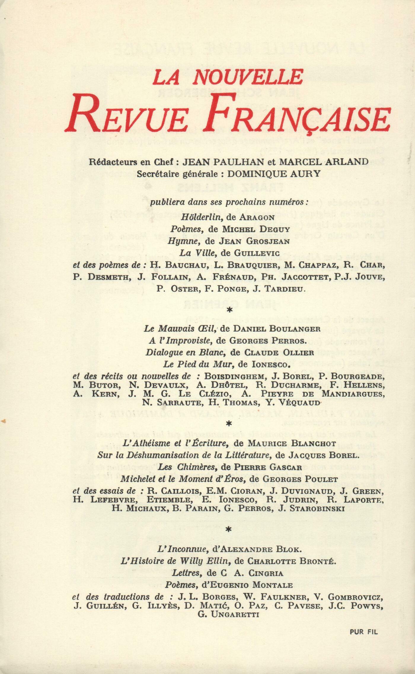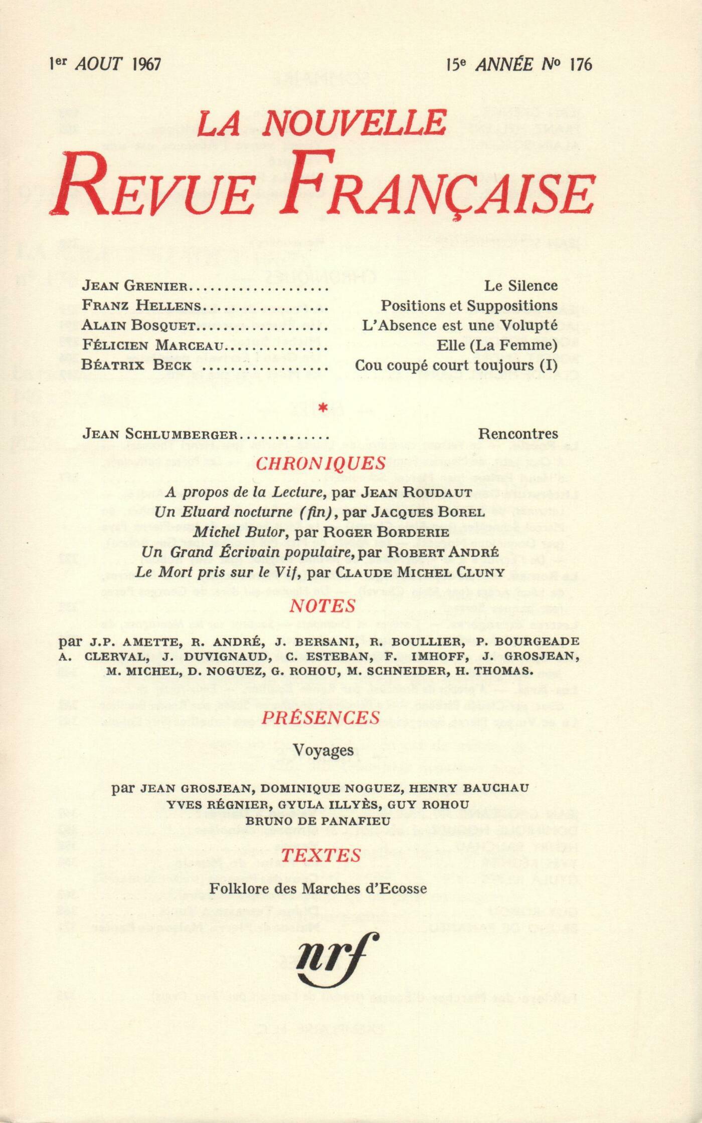 Jean Grenier, Le SilenceFranz Hellens, Positions et suppositionsAlain Bosquet, Venez venez l'absence est une voluptéFélicien Marceau, Elle (la femme)Béatrix Beck, Cou coupé court toujoursJean Schlumberger, RencontresChroniques : Jean Roudaut, Ŕ propos de la lectureJacques Borel, Un Éluard nocturne (Fin)Roger Borderie, Michel ButorRobert André, Un grand écrivain populaireClaude Michel Cluny, Le mort pris sur le vifNotes : la poésie : Henri Thomas, Le Versant contraire, par Louise Herlin (Gallimard)Guy Rohou, Ŕ Chat petit, par Maurice Fombeure (Gallimard)Marcel Schneider, Les Počtes hallucinés, par Henri Parisot (Flammarion)Notes : littérature générale et essais : Robert André, Contes, de Perrault (Garnier)Jacques Bersani, Lettrines, par Julien Gracq (José Corti)Alain Clerval, Entre deux vanités, par Marcel Schneider (Grasset)Dominique Noguez, Le Récit hunique, par Jean-Pierre Faye (Le Seuil)Guy Rohou, Les appels, par Max-Pol Fouchet (Mercure de France) - De l'écriture ŕ la typographie, par Jérôme Peignot (Gallimard)Notes : le roman : Marc Michel, Drôle de jeu, par Roger Vailland (Éditions Rencontre)Alain Clerval, Le Débarras, par Léon Aréga (Gallimard)Jacques Bersani, Un Homme qui dort, par Georges Perec (Denoël)Notes : lettres étrangčres : Jacques-Pierre Amette, Cendres et diamants, par Jerzy Andrzejewsi (Gallimard) - Sautant sur les montagnes, par Jerzy Andrzejewski (Gallimard)Notes : les spectacles : Jean Duvignaud, Monsieur Fugue ou Le mal de terre, de Liliane Atlan (Le Seuil)Notes : les arts : Renée Boullier, Ŕ propos de BrancusiClaude Esteban, Eaux-fortes de Raoul Ubac (Galerie Adrien Maeght)Renée Boullier, La peinture française en SučdeLu et vu : Pierre Bourgeade, Ardente, par Lydie Chantrell (Rougerie)Jean Grosjean, Hannibal, par Gilbert Charles-Picard (Hachette)Guy Rohou, L'évanouissement, par Jorge Semprun (Gallimard) - L'Étang-cur, par Jacques-Gérard Linze (Gallimard)François Imhoff, Chefs-d'uvre des collections suisses - Pastels et dessins, de Borčs (Galerie Villand et Galanis)Pierre Bourgeade, Naves (Galerie Stadler)Présences. Voyages : Jean Grosjean, Va-t-on ŕ Damas?Dominique Noguez, Ombres chinoisesHenry Bauchau, VeniseYves Régnier, La plaine de MurcieGyula Illyčs, Ceux des pusztasGuy Rohou, D'un terrasse ŕ TunisBruno de Panafieu, Maison de pierre maison de papierTextes : Anonymes, Folklore des marches d'Écosse (XVe - XVIe sičcles)
