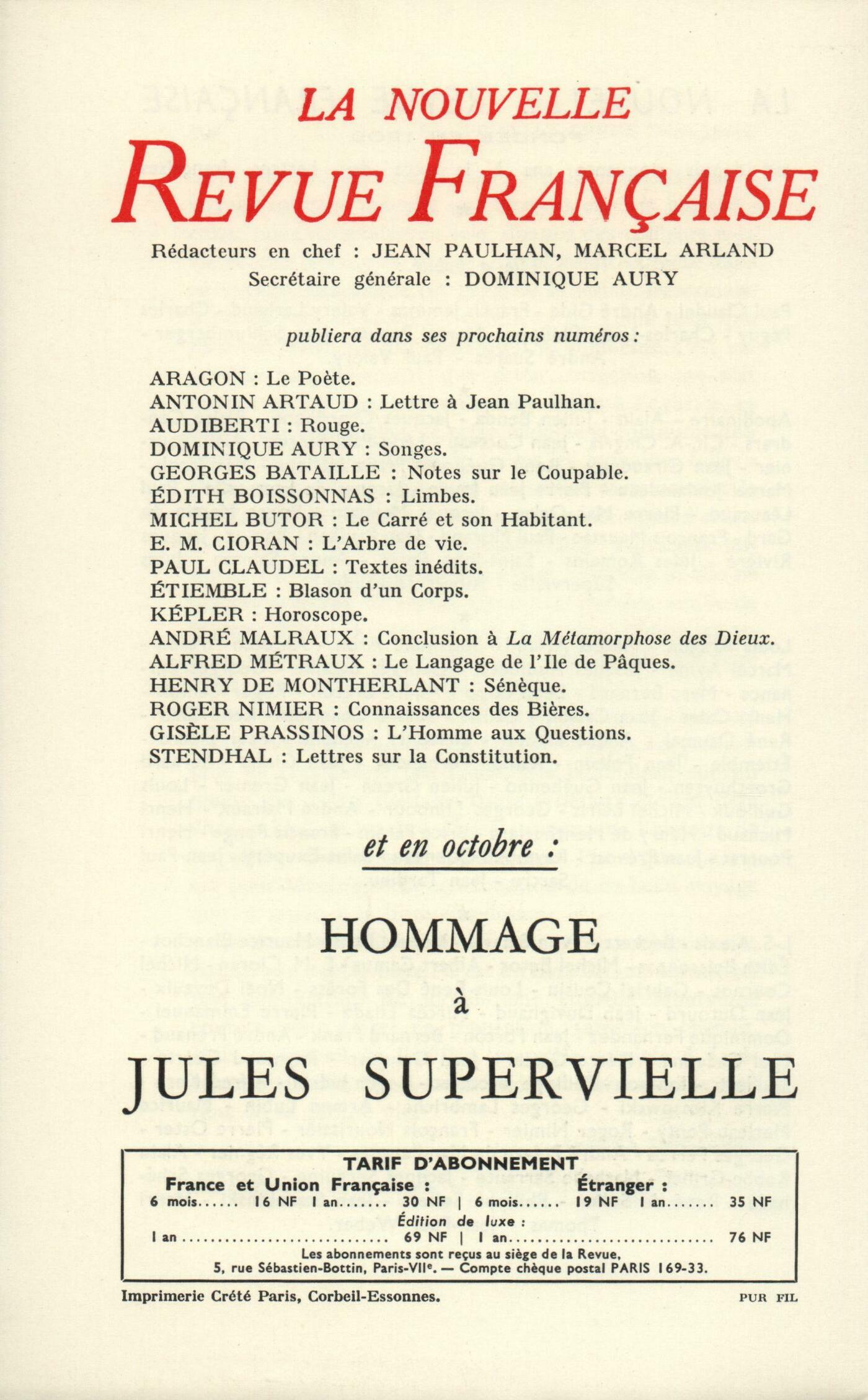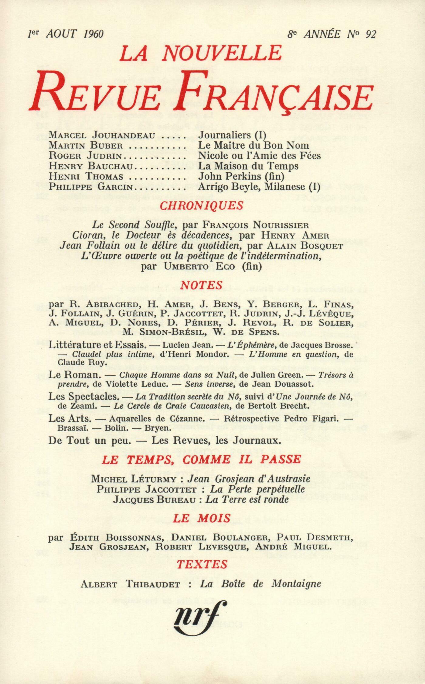 Marcel Jouhandeau, Journaliers (I)Martin Buber, Le Maître du Bon NomRoger Judrin, Nicole ou L'amie des féesHenry Bauchau, La Maison du TempsHenri Thomas, John Perkins (Fin)Philippe Garcin, ŤArrigo Beyle, Milaneseť (I)Chroniques : Henry Amer, Cioran, le docteur čs décadencesAlain Bosquet, Jean Follain ou Le délire du quotidienUmberto Eco, L'uvre ouverte et la Poétique de l'indétermination (Fin)François Nourissier, Le second souffleNotes : la littérature : Yves Berger, Parmi les hommes, par Lucien Jean (Éditions Rencontre)Roger Judrin, L'Éphémčre, par Jacques Brosse (Plon)Notes : les essais : Roger Judrin, Claudel plus intime, par Henri Mondor (Gallimard)Willy de Spens, L'Homme en question, par Claude Roy (Gallimard)Notes : le roman : Philippe Jaccottet, Chaque homme dans sa nuit, par Julien Green (Plon)Robert Abirached, Trésors ŕ prendre, par Violette Leduc (Gallimard)Willy de Spens, Sens inverse, par Jean Douassot (Julliard)Notes : les spectacles : Lucette Finas, La Tradition secrčte du Nô, par Zeami (Gallimard)Dominique Nores, Le Cercle de craie caucasien, de Bertolt Brecht (Comédie de Saint-Étienne)Notes : les arts : Jean Revol, Aquarelles de Cézanne (Galerie Bernheim jeune)Michel Simon-Brésil, Rétrospective Pedro Figari (Musée d'Art moderne)René de Solier, Brassaď (Galerie du Pont-Royal) - Bolin (Galerie Coard)Jean-Jacques Lévęque, Bruyen (Galerie Raymond Cazenave)De tout un peu : Jean Follain, Le Pré spirituel, par Jean Moschus (Éditions Club du Livre Chrétien)Henry Amer, Mémoires, procčs et correspondance, de Rossel (J.-J. Pauvert)Jacques Bens, Sapotille et le serin d'argile, par Michčle Lacrosil (Gallimard) - La Voie romaine, par Roger Grenier (Gallimard) - La Route bleue, par Hélčne Bessette (Gallimard)André Miguel, Paul et Isabelle, par Raymonde Temkine (Robert Laffont) - Le Passager de la nuit, par Maurice Pons (Julliard) - Les Charcutnos, par Olivier Cottiou (Stock)Denis Périer, Hommage ŕ Rouault (Galerie Creuzevault)Les revues, les journaux : Jean Guérin, Trois morts Étiemble, D'une saison ŕ MoscouJean Guérin, Curiosités - DiversLe temps, comme il passe : Jacques Bureau, La Terre est rondeMichel Léturmy, Jean Grosjean d'AustrasieLe mois : Philippe Jaccottet, La Perte perpétuellePaul Desmeth, Promenade ŕ ParisÉdith Boissonnas, Des arbresDaniel Boulanger, RetouchesJean Grosjean, Lettre d'avantAndré Miguel, Alpilles (II)Robert Levesque, Antigone ŕ VolubilisTextes : Albert Thibaudet, La Boîte de Montaigne
