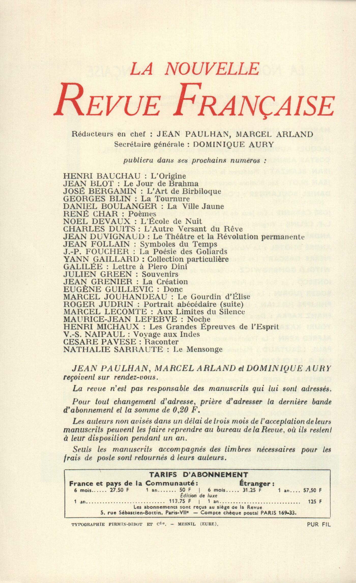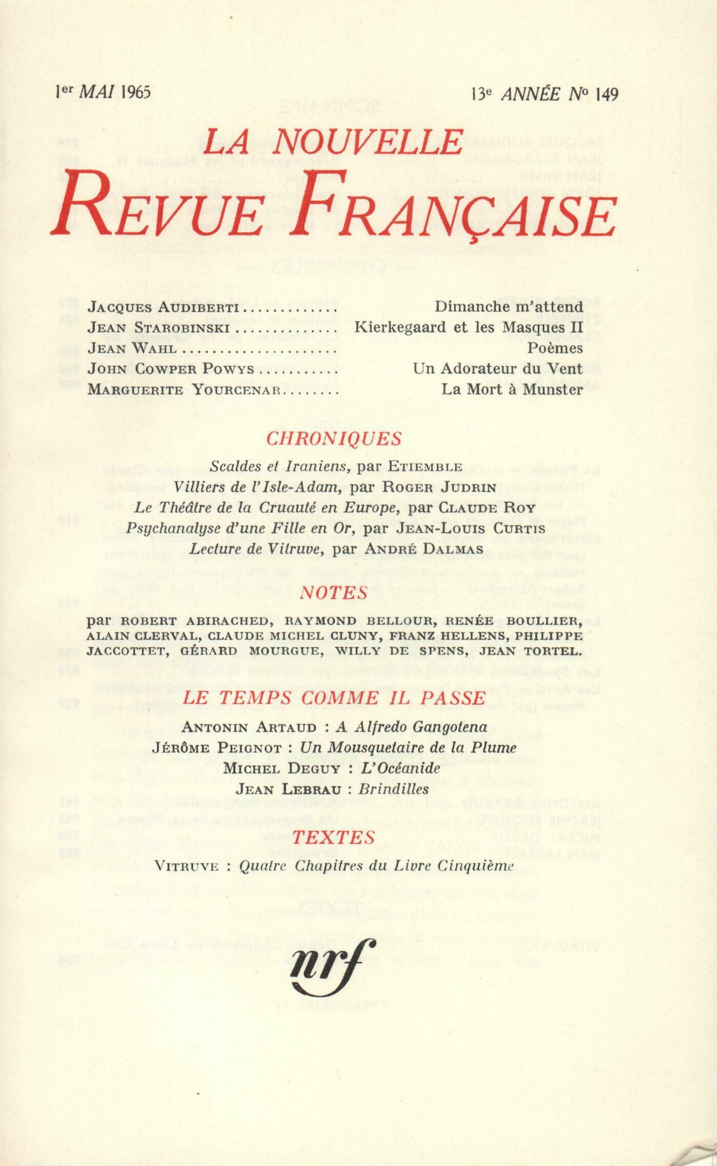 Jacques Audiberti, Dimanche m'attendJean Starobinski, Kierkegaard et les Masques (Fin)Jean Wahl, PočmesJohn Cowper Powys, Un Adorateur du VentMarguerite Yourcenar, La Mort ŕ MunsterChroniques : Roger Judrin, Villiers de L'Isle-Adam Étiemble, Počtes ou faiseurs? [Scaldes et Iraniens]Claude Roy, Le Théâtre de la Cruauté en EuropeJean-Louis Curtis, Psychanalyse d'une fille en orAndré Dalmas, Lecture de VitruveNotes : la poésie : Claude Michel Cluny, Le Chien ŕ la mandoline, par Raymond Queneau (Gallimard)Philippe Jaccottet, Pierre écrite, par Yves Bonnefoy (Mercure de France)Claude Michel Cluny, Les Villes ouvertes, par Jean Tortel (Gallimard)Jean Tortel, Les Plages de Thulé, par Jean Laude (Le Seuil)Notes : littérature et essais : Willy de Spens, Les Libertins au XVIIe sičcle (Buchet-Chastel)Franz Hellens, Contes immoraux, du prince de Ligne (Nouvel Office d'Édition)Robert Abirached, Guillaume Apollinaire, Alcools, par Marie-Jeanne Durry (Société d'édition d'enseignement supérieur)Willy de Spens, Journées de lectures, par Roger Nimier (Gallimard)Notes : lettres étrangčres : Claude Michel Cluny, La Lune et les Feux, par Cesare Pavese (Gallimard)Alain Clerval, Conclusion, par Henry Green (Gallimard)Claude Michel Cluny, Monsieur G. A. ŕ X, par Tibor Déry (Éditions du Seuil)Notes : les spectacles : Raymond Bellour, Le regard de MunkNotes : les arts : Gérard Mourgue, Poésie de dessins chez CocteauRenée Boullier, André Masson - ŤComparaisons 65ťLe temps comme il passe : Antonin Artaud, Ŕ Alfredo GangotenaJérôme Peignot, Un mousquetaire de la plumeMichel Deguy, L'OcéanideJean Lebrau, BrindillesTextes : Vitruve, Quatre chapitres du Livre Cinquičme