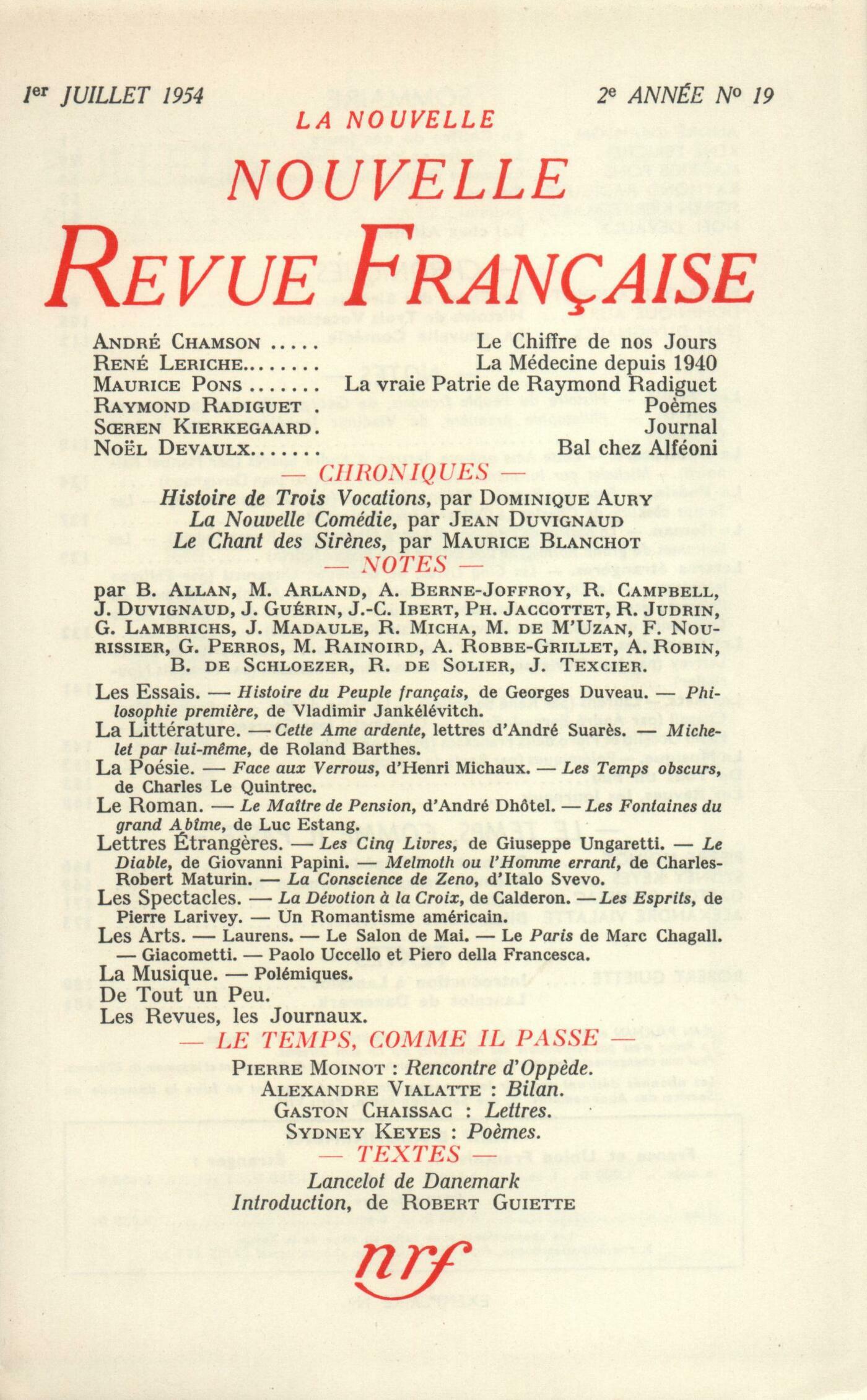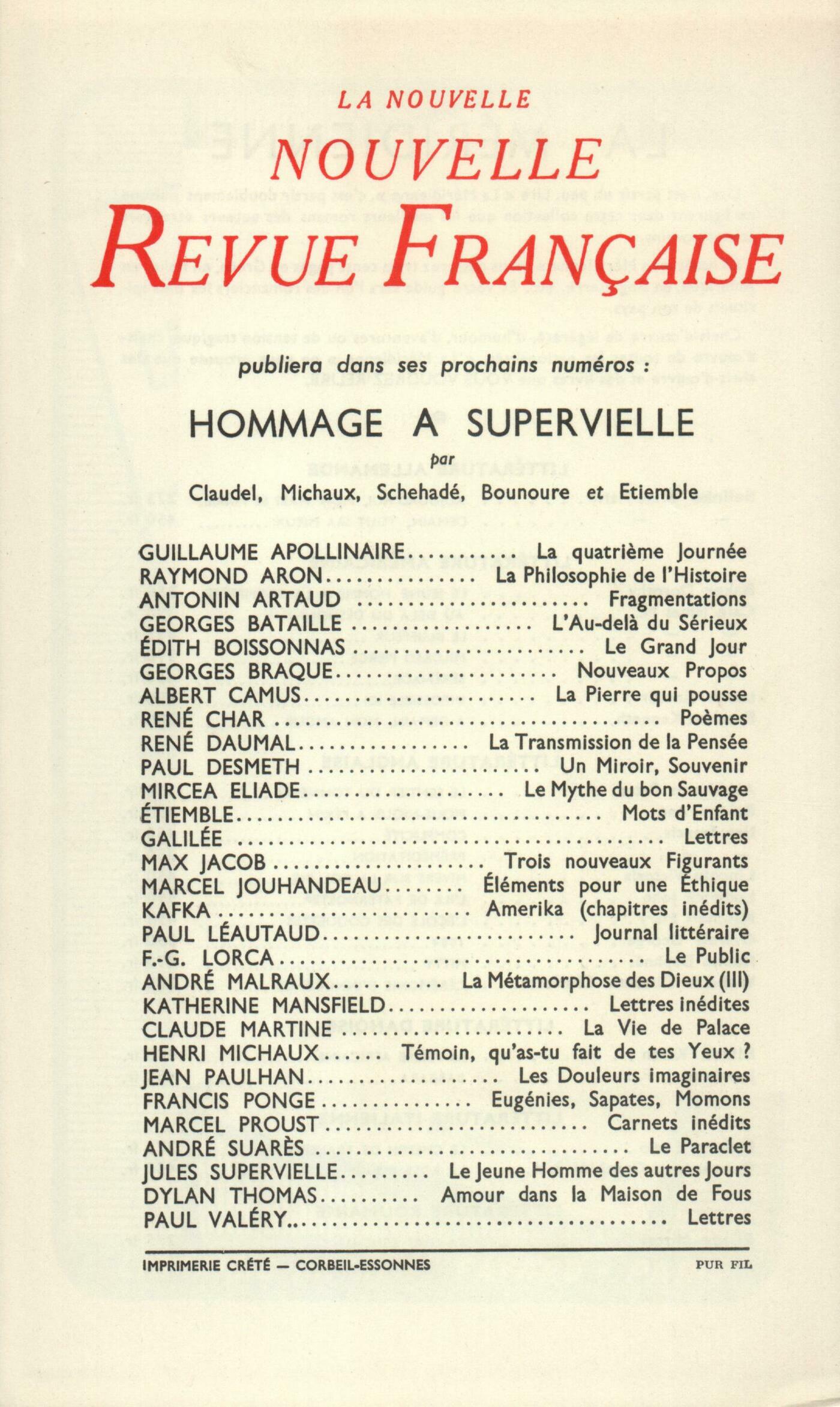 A. Chamson, Le Chiffre de nos JoursR. Leriche, La Médecine depuis 1940M. Pons, La vraie patrie de Raymond RadiguetR. Radiguet, PočmesS. Kierkegaard, Journal (1846-1849) [extraits]N. Devaulx, Bal chez AlféoniChroniques : recherches : M. Blanchot, Le Chant des SirčnesChroniques : les romans : D. Aury, Histoire de trois vocationsChroniques : le théâtre : J. Duvignaud, La Nouvelle ComédieNotes : les essais : J. Madaule, Histoire du peuple français, par G. Duveau R. Campbell, Philosophie premičre, par V. Jankélévitch Notes : la littérature : M. Rainoird, Cette Âme Ardente, choix de lettres d'A. Suarčs ŕ R. Rolland J. Duvignaud, Michelet par lui-męme, par R. Barthes Notes : la poésie : G. Perros, Face aux verrous, par H. Michaux A. Robin, Les Temps obscurs, par C. Le Quintrec Notes : le roman : R. Judrin, Le maître de pension, par A. Dhôtel - Les Fontaines du grand abîme, par L. Estang Notes : lettres étrangčres : P. Jaccottet, Les Cinq Livres, par G. Ungaretti B. Allan, Le Diable, par G. Papini M. de M'Uzan, Melmoth ou L'homme errant, par C.-R. Maturin A. Robbe-Grillet, La Conscience de Zeno, par I. Svevo Notes : les spectacles : J. Duvignaud, La Dévotion ŕ la Croix, de Calderón - Les Esprits, de LariveyF. Nourissier, Un romantisme américainNotes : les arts : R. de Solier, LaurensA. Berne-Joffroy, Le Salon de Mai (Musée d'Art Moderne) - Le Paris de M. Chagall (Galerie Maeght)G. Lambrichs, Peintures, d'A. Giacometti (Maeght)R. Micha, Paolo Uccello et Piero Della Francesca (Palais Strozzi)Notes : la musique : B. de Schlzer, PolémiquesDe tout un peu : J.-C. Ibert, L'ouvrier de la onzičme heure, par P. Emmanuel G. Perros, Une histoire de la littérature française, par K. Haedens F. Nourissier, Le Petit Canard, par J. Laurent G. Perros, Le Naďf sous les drapeaux, par P. Guth J. Guérin, La mariée est trop belle, par O. Joyeux J. Duvignaud, Fondements pour la Transformation intégrale du Théâtre, par I. Isou F. Nourissier, I Vitelloni, de F. Fellini - Pane, Amore e Fantasia, de L. Comencini - Les Femmes s'en balancent, de B. BorderieJ. Texcier, Édith PiafJ. Guérin, Les arts et leurs relations mutuelles, par T. Munro M. Arland, 40 000 ans d'art moderne, par J.-A. Mauduit - La collection Girardin (Petit Palais)Les revues, les journaux : B. de Jouvenel - J. Guérin, La bombe atomique considérée comme une forme de pacifismeD. Saurat - J. Guérin, Le bon soldat se connaît dans la défaite J. Guérin - G. Truc, Le zen et les chrétiens J. Grenier - J. Guérin, Pričre J. Guérin, Divers Anonymes, Notes Le temps comme il passe P. Moinot, Rencontre d'Oppčde A. Robin, ŤLe počte anglais Sidney Keyes est mort ŕ l'âge de vingt ans, le 29 avril 1943...ť S. Keyes, Počmes G. Chaissac, Lettre A. Vialatte, Bilan R. Guiette, ŤLe jeu de Lancelot de Danemark est extrait d'un précieux manuscrit...ť Anonymes, La Belle Histoire de Lancelot de Danemark et de la belle Sandrine