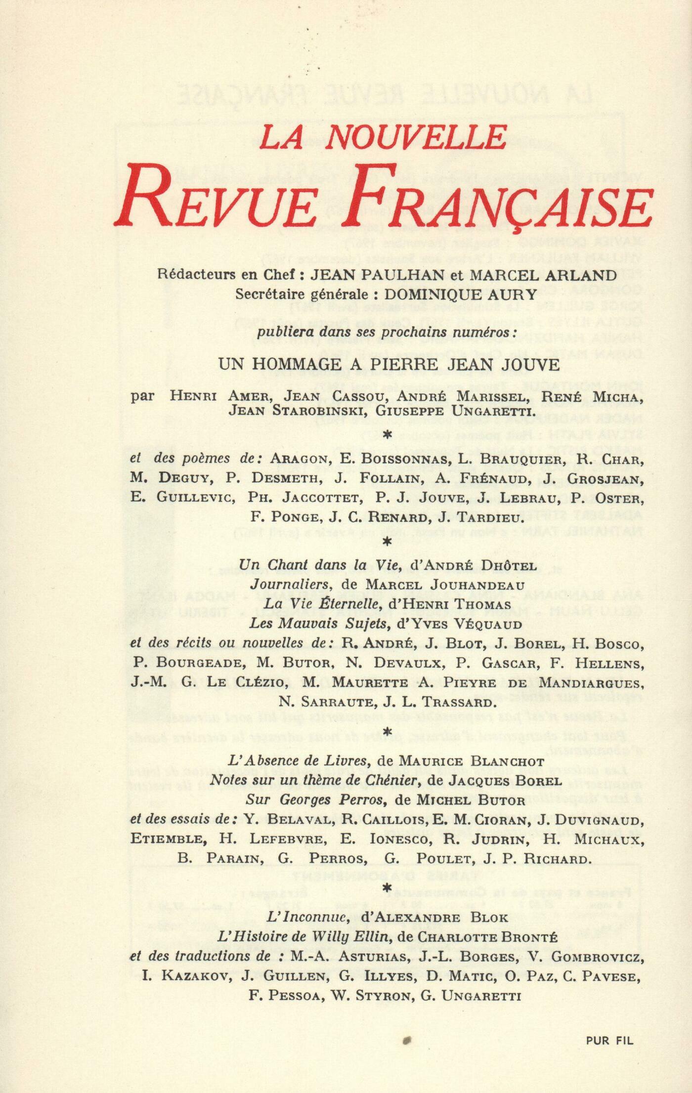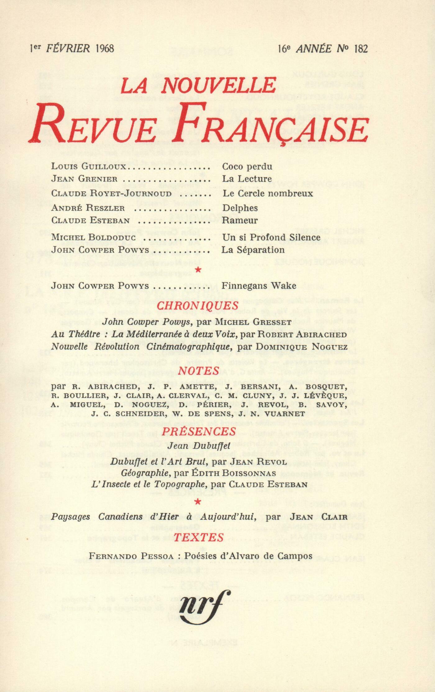 Louis Guilloux, Coco perduJean Grenier, La lectureClaude Royet-Journoud, Le Cercle nombreuxAndré Reszler, DelphesClaude Esteban, RameurMichel Boldoduc, Un si profond silenceJohn Cowper Powys, La Séparation - Finnegans WakeChroniques : Michel Gresset, John Cowper PowysRobert Abirached, Au théâtre : la Méditerranée, ŕ deux voixDominique Noguez, Une nouvelle révolution cinématographiqueNotes : le roman : Guy Rohou, Mon compagnon de songes, par Henri Bosco (Gallimard)Willy de Spens, Les sources de la vie, par Robert Poulet (Plon)Jean-Noël Vuarnet, Compact, par Maurice Roche (Le Seuil)Guy Rohou, Les enfants d'Attila, par Georges Walter (Grasset)Bernard Savoy, Renata n'importe quoi, par Catherine Guérard (Gallimard)Alain Clerval, Monarque, par Yves Véquaud (Gallimard) - La Naissance, par Roger Borderie (Gallimard)Notes : lettres étrangčres : Dominique Noguez, La Violette du Prater, par Christopher Isherwood (Julliard)Jacques-Pierre Amette, Anita G. et autres nouvelles, par Alexander Kluge (Gallimard)Jean-Claude Schneider, Voyage nocturne, par Wolfgang Hildesheimer (Gallimard)Guy Rohou, Voss, par Patrick White (Gallimard)Notes : les arts : Jean Clair, Pierre Bonnard, par Antoine Terrasse (Gallimard)Renée Boullier, Ŕ propos de l'art russeNotes : les spectacles : Jacques-Pierre Amette, J'ai męme rencontré des tziganes heureux, d'Alexandre PetrovicDominique Noguez, Les Feux de la vie, de Jan TroellClaude Michel Cluny, O salto, de Christian de ChalongeLu et vu : Alain Bosquet, Libre espace, par Jean-Louis Bédouin (Seghers) - Les Doigts verts, par Anne-Marie Kegels (André de Rache)André Miguel, La Lumičre du jour, par Gaston Puel (La Fenętre ardente)Claude Michel Cluny, Ifrikya ma pensée, par Ridha Zili (Pierre-Jean Oswald) - Kamikaze Galapagos, par Dominique Tron (Seghers)Robert Abirached, L'Anniversaire, d'Harold Pinter (Théâtre Antoine) - Monsieur Fugue, de Liliane Atlan (T.N.P.)Jacques Bersani, Les Guerres Picrocholines, de Rabelais (Théâtre du Vieux-Colombier)Jean-Jacques Lévęque, Tapies (Galerie Maeght)Jean Revol, Daniel Abel (Galerie Connaître)Denis Périer, [Carnet de lectures]Revue : Marcel Arland, Ŕ l'île Maurice Anonymes, Lettres d'Albertine Sarrazin - MémentoPrésences : Jean Revol, Dubuffet et l'Art brutÉdith Boissonnas, GéographieClaude Esteban, L'insecte et le topographeJean Clair, Paysages canadiens d'hier ŕ aujourd'huiTextes : Fernando Pessoa, Poésies d'Alvaro de Campos