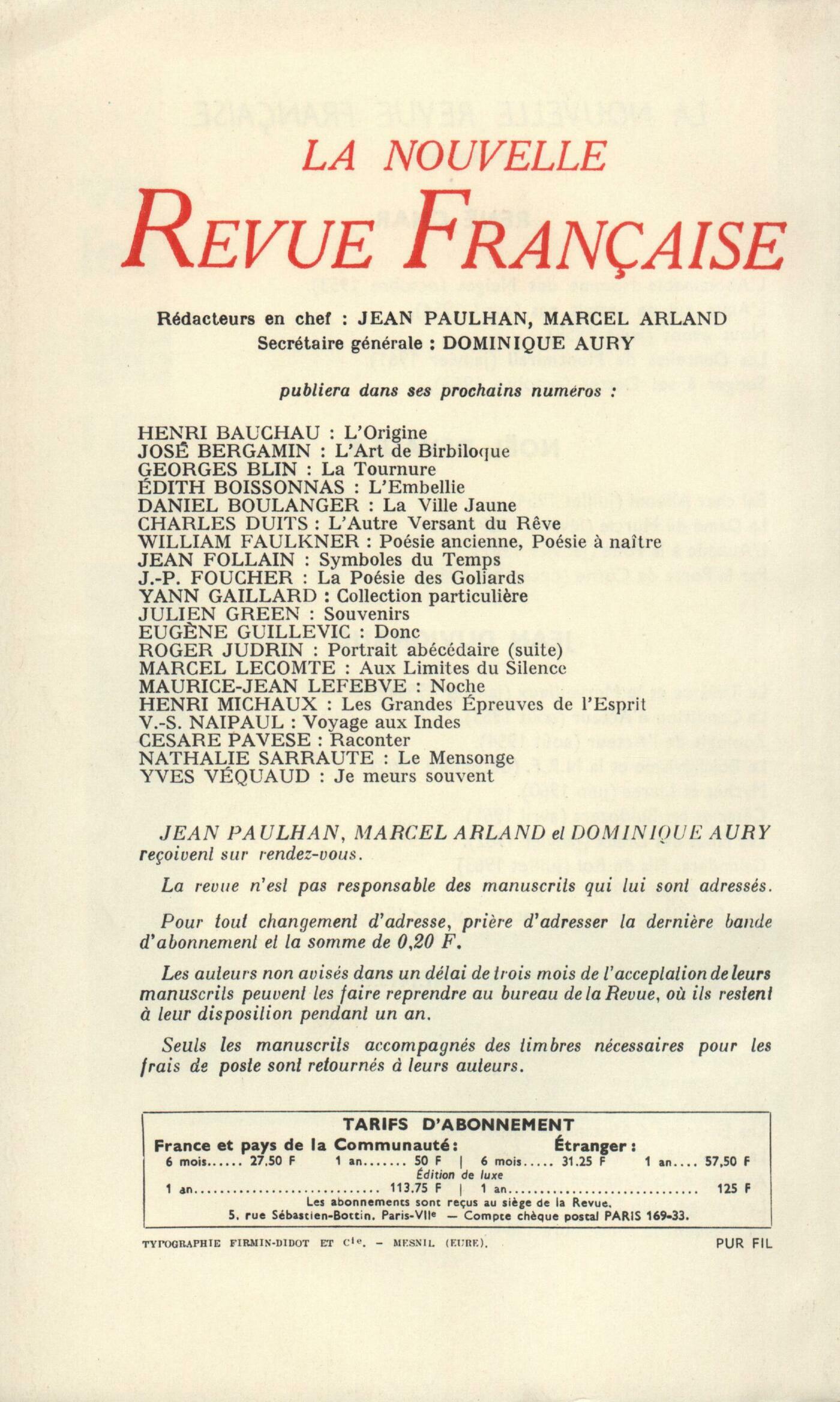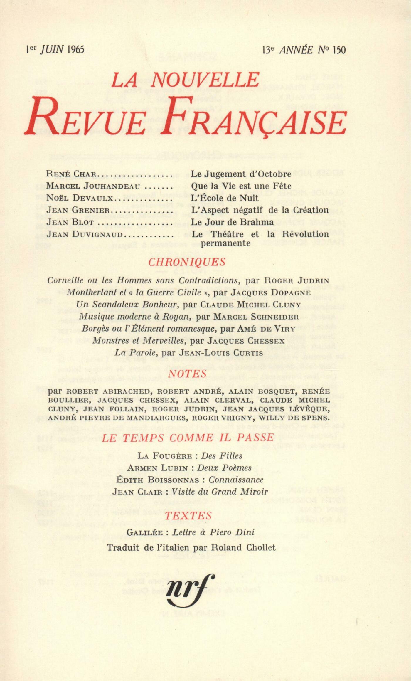 René Char, PočmesMarcel Jouhandeau, Que la vie est une fęteNoël Devaulx, L'école de nuitJean Grenier, L'aspect négatif de la créationJean Blot, Le jour de BrahmaJean Duvignaud, Le théâtre et la révolution permanenteChroniques : Roger Judrin, Corneille ou Les hommes sans contradictionsClaude Michel Cluny, Un scandaleux bonheurJacques Chessex, Monstres et merveillesAmé de Viry, Borges ou L'élément romanesqueJacques Dopagne, Mors et fricum ou Montherlant et La Guerre civileJean-Louis Curtis, La ParoleMarcel Schneider, Musique moderne ŕ RoyanNotes : la poésie : Alain Bosquet, Le mois poétiqueJacques Chessex, Désordres, par Claude Michel Cluny (Gallimard)Notes : littérature et essais : Robert André, Lyrisme de Dante, par Georges Mounin (Presses Universitaires)Robert Abirached, Mémoires, d'Alexandre de Tilly (Mercure de France)Roger Judrin, Correspondance, II, de Stéphane MallarméJean Follain, 1848, par Georges Duveau (Gallimard)Robert Abirached, Mčre Méditerranée, par Dominique Fernandez (Grasset)Notes : le roman : Alain Clerval, La maison, la foręt, par Dominique Rolin (Denoël) - Le demi-solde, par Jean Dutourd (Gallimard)Jean Duvignaud, Drame, par Philippe Sollers (Le Seuil)Roger Vrigny, Trois jeunes tambours, par Jacques Brenner (Julliard) - Journal de la vie littéraire, de Jacques Brenner (Julliard)Notes : lettres étrangčres : Claude Michel Cluny, Les noms et visages de héros, par Reynolds Price (Gallimard) - Le crépuscule des Aztčques, par Miguel Leon-Portilla (Casterman)Notes : les arts : Renée Boullier, Chefs-d'uvre du Musée de l'HommeJean-Jacques Lévęque, Ghika (Galerie Iolas)André Pieyre de Mandiargues, Lee Bontecou (Galerie Ileana Sonnabend)Lectures : Willy de Spens, Le meurtre d'un enfant, par Jean Cau (Gallimard) - La Milličme Année, par Pierre Frédérix (Gallimard) - Le rendez-vous de Moscou, par Pierre Fisson (Grasset) - L'Opium et le Bâton, par Mouloud Mammeri (Plon) - Guido, par Maud Frčre (Gallimard) - Le Défi, par Gabriel Matzneff (La Table Ronde)Le temps comme il passe : Armen Lubin, Deux počmesÉdith Boissonnas, ConnaissanceJean Clair, Visite du Grand Miroir Anonymes, Avant-propos ŕ Des filles de La Fougčre La Fougčre, Des fillesTextes : Galilee, Lettre ŕ Piero Dini