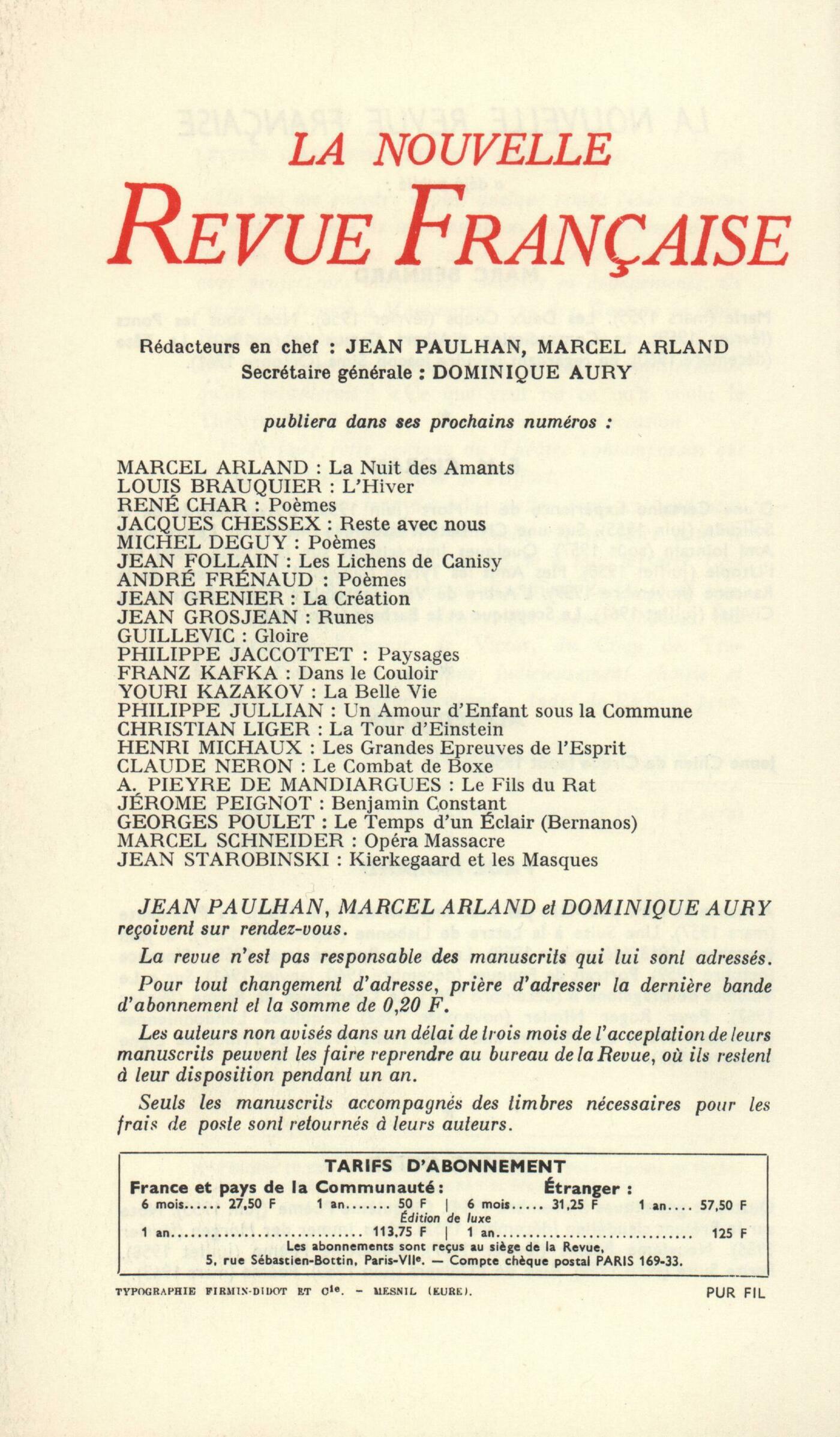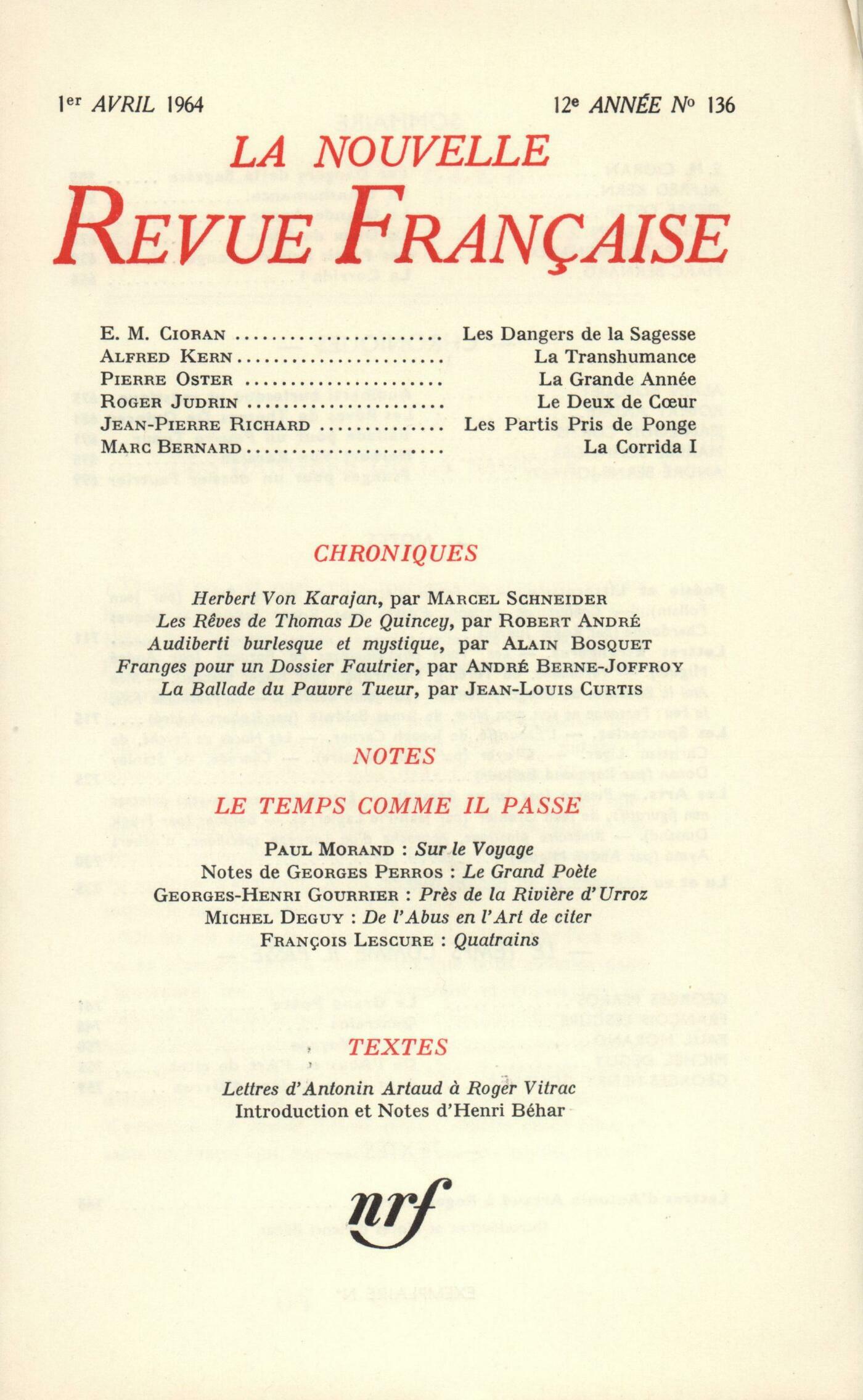 Cioran, Les dangers de la SagesseAlfred Kern, La TranshumancePierre Oster, La Grande Année (Fragments)Roger Judrin, Le deux de curJean-Pierre Richard, Les partis pris de PongeMarc Bernard, La CorridaChroniques : Alain Bosquet, Audiberti, burlesque et mystiqueRobert André, Les ręves de Thomas de QuinceyJean-Louis Curtis, La ballade du pauvre tueurMarcel Schneider, Herbert von KarajanAndré Berne-Joffroy, Franges pour un dossier FautrierNotes : poésie et littérature : Jean Follain, Le Festin d'attente, par Marcel Thiry (André de Rache)Roger Judrin, Cahiers de Lorient, par Alain (Gallimard) - Jacques ChardonneNotes : lettres étrangčres : André Miguel, Les voies physiologiques de RozanovRoger Blanzat, Vartananc, par Ténénig Démirdjian (Stock)Jean Lebrau, Mon ami le blizzard, par Gregory Marton (Stock)Robert André, La prochaine fois, le feu, par James Baldwin (Gallimard) - Personne ne sait mon nom, par James Baldwin (Gallimard)Notes : les spectacles : Willy de Spens, L'Ébouriffé, par Josep Carner (Gallimard) - Les Noces de Psyché, par Christian Liger (Gallimard)Jean Bastaire, DreyerRaymond Bellour, Charade, de Stanley DonanNotes : les arts : Janine Béraud, Picasso (Galerie Louise Leiris)Jean Pie Lapierre, Entretiens avec dix-sept peintres non figuratifs, par Jean Grenier (Calmann-Lévy)Frank Dunand, Bellmer (Galerie Daniel Cordier)André Miguel, Itinéraire plastique, approche d'un langage spécifique, d'Albert AymeLu et vu : Philippe Jaccottet, Soleil taciturne, par Théo Léger (Mercure de France)Gilbert Vincent, Sabine, par André Pieyre de Mandiargues (Mercure de France) - Le temps d'un soupir, par Anne Philipe (Julliard) - De A ŕ Z, par Agnčs Nanquette (Gallimard) - Aucune trace, par Léon Arega (Gallimard)André Miguel, Via Poussičre, par Jean Luissel (La Fenętre Ardente)Claude Michel Cluny, La Nasse, par Paul Schallück (Casterman)Willy de Spens, Les enfants de Dieu, par Petar Segedin (Calmann-Lévy)Gilbert Vincent, Bernard Buffet (Galerie David et Garnier)Frank Dunand, Couleurs en mouvement, d'Andrée Dantu (Galerie de Beaune)Roland Recht, 19e Salon des réalités nouvelles (Musée d'Art moderne)André Berne-Joffroy, Repentir ŕ propos de la Grande Sinopia de Simone MartiniLe temps comme il passe. Notes : Georges Perros, Le grand počteLe temps comme il passe : François Lescure, QuatrainsPaul Morand, Sur le voyageMichel Deguy, De l'abus en l'art de citerGeorges-Henry Gourrier, Prčs de la rivičre d'UrrozTextes : Henri Béhar, Sur la derničre manifestation du Théâtre Alfred JarryAntonin Artaud, Lettres ŕ Roger Vitrac