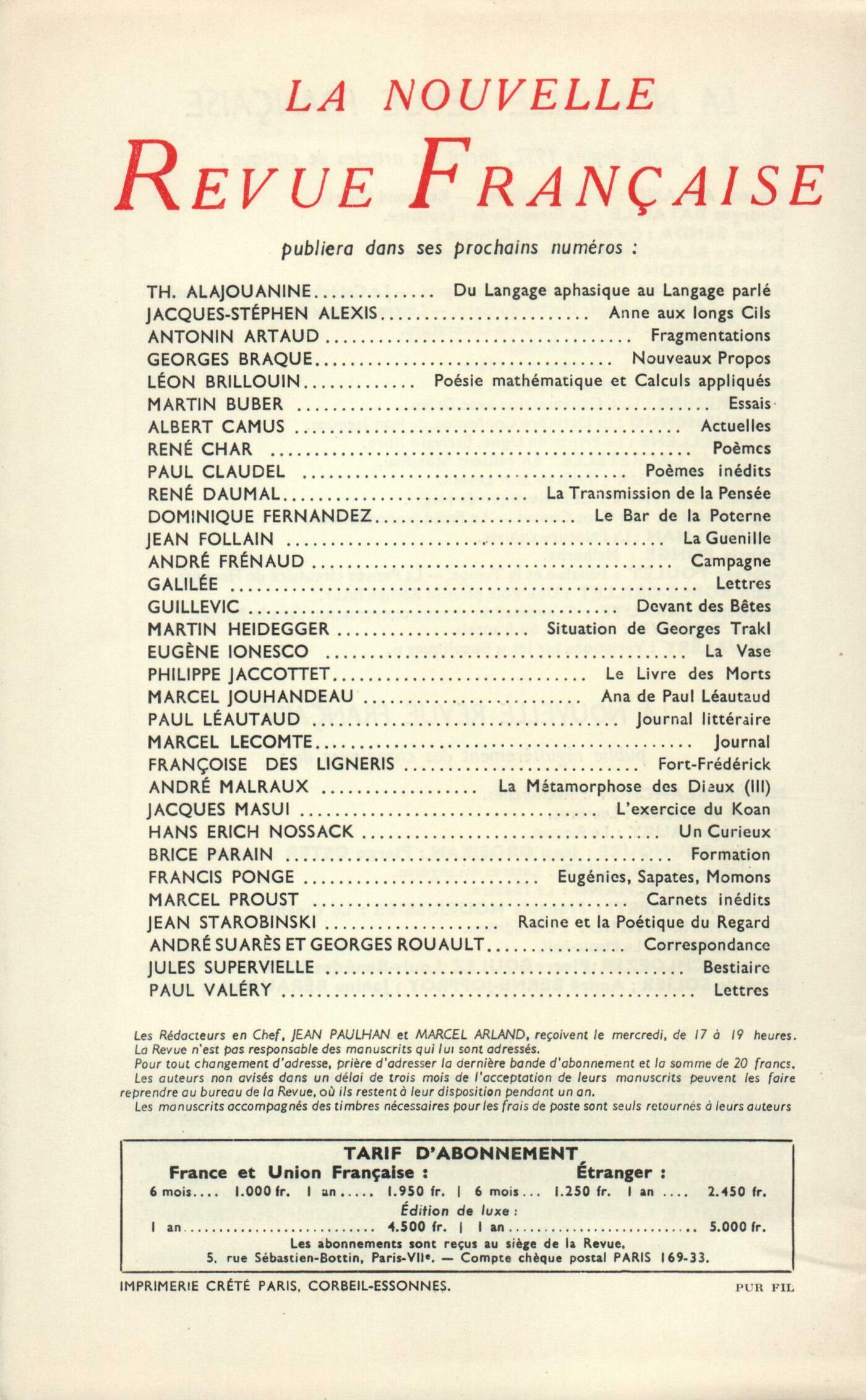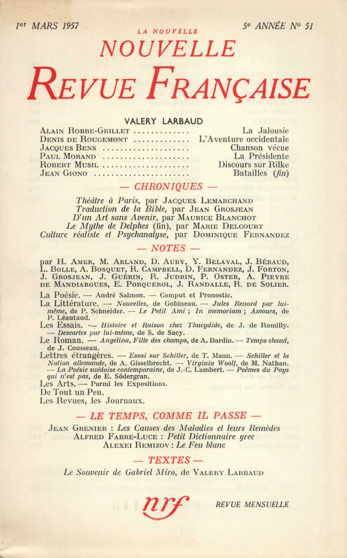 Marcel Arland, Valery LarbaudAlain Robbe-Grillet, La JalousieDenis de Rougemont, La Découverte du Temps ou L'Aventure occidentaleJacques Bens, Chanson vécuePaul Morand, La PrésidenteRobert Musil, Discours sur RilkeJean Giono, Batailles (Fin)Chroniques : recherches : Maurice Blanchot, D'Art sans avenirChroniques : Marie Delcourt, Le Mythe de Delphes (Fin)Jean Grosjean, Traduction de la BibleDominique Fernandez, Culture réaliste et psychanalyseJacques Lemarchand, Théâtre ŕ ParisNotes : la poésie : Alain Bosquet, André Salmon ou L'ardeur vient du jeuJean Grosjean, Comput et pronosticNotes : la littérature : Roger Judrin, Nouvelles, de Gobineau (Jean-Jacques Pauvert) - Jules Renard par lui-męme, par Pierre Schneider (Le Seuil)Henry Amer, Le Petit Ami In Memoriam Amours, par Paul Léautaud (Mercure de France)Notes : les essais : Robert Campbell, Histoire et Raison chez Thucydide, par Jacqueline de Romilly (Les Belles-Lettres)Yvon Belaval, Descartes par lui-męme, par Samuel S. de Sacy (Le Seuil)Notes : le roman : Élisabeth Porquerol, Angelina, une fille des champs, par Angelina Bardin (André Bonne)Marcel Arland, Temps chaud, par Jacques Cousseau (Corręa)Notes : lettres étrangčres : Dominique Fernandez, Essai sur Schiller, par Thomas Mann (Presses Universitaires de France) - Schiller et la Nation allemande, par A. Gisselbrecht (Éditions Sociales)Dominique Aury, Virginia Woolf, par Monique Nathan (Le Seuil)André Pieyre de Mandiargues, La Poésie suédoise contemporaine, par Jean-Clarence Lambert (Falaize) - Počmes du Pays qui n'est pas, par Edith Södergran (René Debresse)Notes : les arts. Parmi les expositions : René de Solier, Pevsner (Musée d'Art moderne) - Chastel (Galerie Galanis) - Bertholle (Galerie Jeanne Bucher et Galerie Roque)Janine Béraud, Singier (Galerie de France) - Pâtes blanches, de Picasso (La Hune) - Dora Maar (Galerie Berggruen)De tout un peu : Pierre Oster, Počmes, de Gottfried Benn (Librairie Les Lettres)Jacques Randalle, Éloge du cardinal de Bernis, par Roger Vailland (Fasquelle)Louis Bolle, Le Pain noir, par G.-E. Clancier (Robert Laffont)Jacques Randalle, La Boiteuse du lac Vättern, par Ferny Besson (Albin Michel) - Il ne faut jamais dire Fontaine..., par Jeannine Worms (Fasquelle)Jean Forton, La Sensitive, par Michčle Perrein (Julliard)Jean Guérin, Un Diable au Paradis, par Henry Miller (Corręa) - Journal d'Hiroshima, par Michihiko Hachiya (Albin Michel)Jacques Randalle, Le Mariage de Figaro, de Beaumarchais (T. N. P.)Les revues, les journaux : Jean Guérin, Ŕ la mémoire d'Emmanuel Lochac - Les albums de Freinet - La Bible de Marc Chagall - Sottisier Anonymes, DiversLe temps, comme il passe : Alfred Fabre-Luce, Petit Dictionnaire grecJean Grenier, Les Causes des maladies et leurs remčdesAlexeď Remizov, Le Feu blancTextes : Valery Larbaud, Souvenir de Gabriel Miro