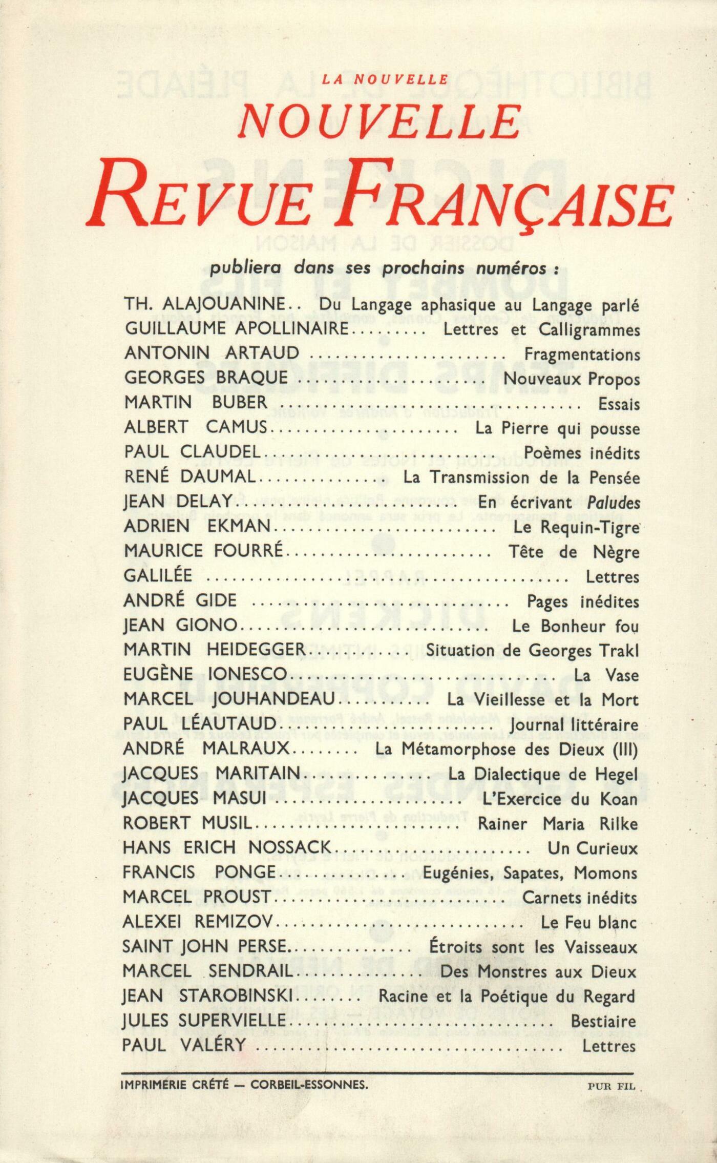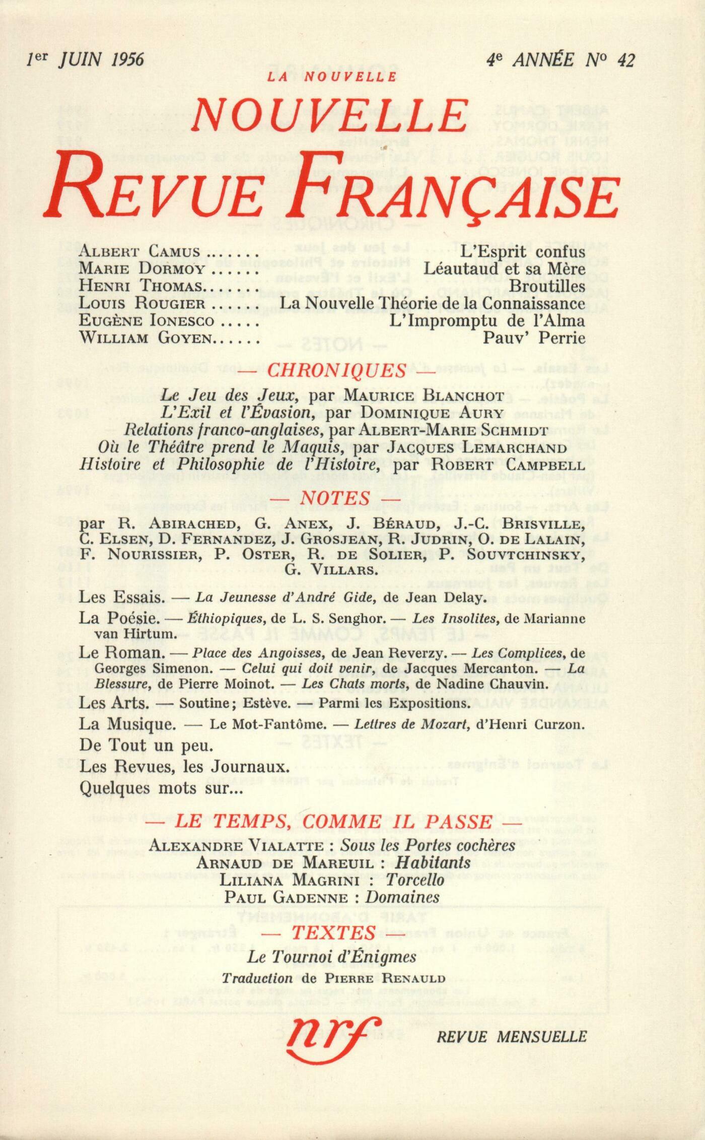 Albert Camus, L'Esprit confusMarie Dormoy, Paul Léautaud et sa mčreHenri Thomas, BroutillesLouis Rougier, La Nouvelle Théorie de la ConnaissanceEugčne Ionesco, L'Impromptu de l'AlmaWilliam Goyen, Pauv' PerrieChroniques : recherches : Maurice Blanchot, Le Jeu des JeuxChroniques : Robert Campbell, Histoire et Philosophie de l'HistoireChroniques : les romans : Dominique Aury, L'Exil et l'ÉvasionChroniques : le théâtre : Jacques Lemarchand, Oů le Théâtre prend le maquisChroniques : l'érudition : Albert-Marie Schmidt, Relations franco-anglaisesNotes : les essais : Dominique Fernandez, La Jeunesse d'André Gide, par Jean Delay (Gallimard)Notes : la poésie : Jean Grosjean, Éthiopiques, par L. S. Senghor (Le Seuil)Pierre Oster, Les Insolites, par Marianne van Hirtum (Gallimard)Notes : le roman : Robert Abirached, Place des Angoisses, par Jean Reverzy (Julliard)Claude Elsen, Les Complices, par Georges Simenon (Presses de la Cité)Georges Anex, Celui qui doit venir, par Jacques Mercanton (Guilde du Livre)Jean-Claude Brisville, La Blessure, par Pierre Moinot (Gallimard)Georges Villars, Les Chats morts, par Nadine Chauvin (Pierre Horay)Notes : les arts. Parmi les expositions : Janine Béraud, Soutine (La Maison de la Pensée) - Aquarelles et dessins, d'Estčve (Galerie Galanis)René de Solier, Charchoune (galerie Creuze) - Marcelle Loubchansky (Galerie Kléber) - Louis Fernandez (Galerie Cahiers d'Art) - Zao Wou-Ki (Galerie La Hune) - Germain (Galerie Michel Warren) - Man Ray (Galerie L'Étoile Scellée) - Roberto Crippa (Galerie du Dragon) - Eugčne Dodeigne (Galerie Creuze) - Delahaye (Galerie Stadler) - Giorgio de Giorgi (Galerie Craven) - Jean-Pierre Duprey (Galerie Furstenberg) - Gilles Ehrmann (Galerie La Hune) - Pierre M. Comte (Galerie La Roue)Notes : la musique : Pierre Souvtchinsky, Le Mot-FantômeRoger Judrin, Lettres de Mozart, par Henri de Curzon (Plon)De tout un peu : Pierre Oster, Éoliennes, par Charles Tricou (Delfica)Georges Villars, Les Enfants de l'Absurde, par Paul van den Bosch (La Table Ronde) - Le Pain et l'Eau, par France Arudy (Le Seuil) - Les Enfants lucides, par Simone Avray (Julliard) - Paris, un jour d'avril, par Maurice Toesca (Albin Michel)François Nourissier, Ce soir, on joue Guignol, par Jean-Claude Darnal (La Table Ronde)Odile de Lalain, Les Balesta, par Henri Bosco (Gallimard) - Le Grand Espoir, par Ilse Aichinger (Gallimard) - Le Thé de Mrs. Goodman, par Philip Toynbee (Denoël)Dominique Fernandez, Haute-Pierre, par Ugo Betti (Le Seuil)Les revues, les journaux : Paul Gadenne - Pierre Louet - Alain Robbe-Grillet, Ŕ la recherche du romanPierre Louet, Berlin, cité radieuseEugčne Canseliet - Pierre Louet, Nicolas FlamelPierre Gabriel - Pierre Louet, Un počte, un fragment - Divers Anonymes, Quelques mots sur...Le temps, comme il passe :Paul Gadenne, DomainesArnaud de Mareuil, Habitant au visage beige et triste Habitant ensommeilléLiliana Magrini, TorcelloAlexandre Vialatte, Sous les portes cochčresTextes : Anonymes, Le Tournoi d'énigmes