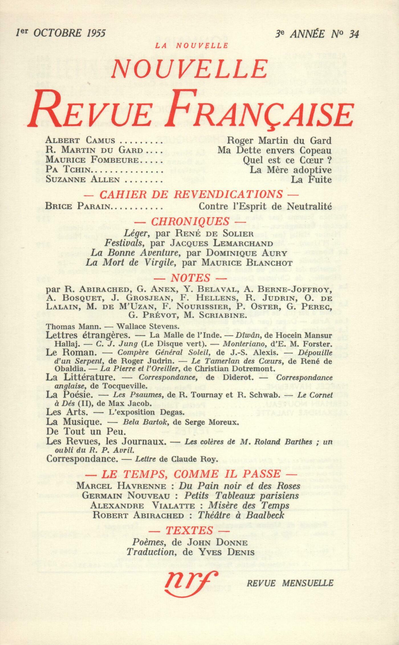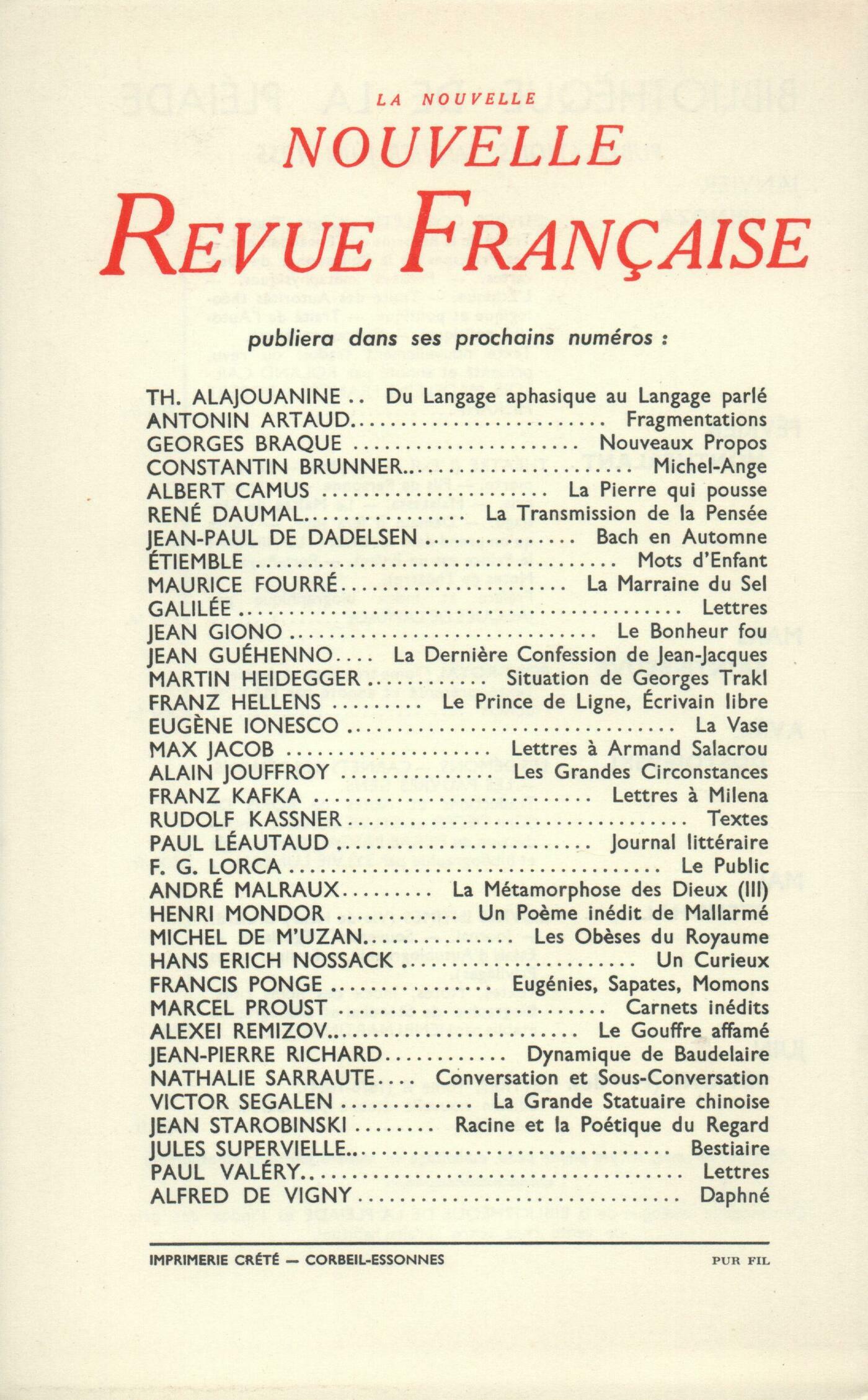 Albert Camus, Roger Martin du GardRoger Martin du Gard, Ma dette envers Copeau Pa Tchin, La Mčre adoptiveMaurice Fombeure, Quel est ce Cur?Suzanne Allen, La FuiteCahier de revendications : Brice Parain, Contre l'esprit de neutralitéChroniques : recherches : Maurice Blanchot, La Mort de VirgileChroniques : les romans : Dominique Aury, La Bonne AventureChroniques : le théâtre : Jacques Lemarchand, FestivalsChroniques : René de Solier, LégerNotes : Franz Hellens, Thomas MannAlain Bosquet, Wallace StevensNotes : lettres étrangčres : Roger Judrin, La Malle de l'IndeJean Grosjean, Dîwân, par Hocein Mansur Hallaj (Cahiers du Sud)Michel de M'Uzan, C.-G. Jung (le Disque vert)Odile de Lalain, Monteriano, par E. M. Forester (Plon)Notes : le roman : François Nourissier, Compčre Général Soleil, par Jacques Stephen Alexis (Gallimard)Robert Abirached, Dépouille d'un serpent, par Roger Judrin (Éditions de Minuit)Georges Perec, Tamerlan des Curs, par René de Obaldia (Plon)Gérard Prévot, La Pierre et l'Oreiller, par Christian Dotremont (Gallimard)Notes : la littérature : Yvon Belaval, Correspondance, I, de Denis Diderot (Éditions de Minuit)Roger Judrin, Correspondance anglaise, de Tocqueville (Gallimard)Notes : la poésie : Jean Grosjean, Les Psaumes, de R. Tournay et R. Schwab (Éditions du Cerf)Georges Anex, Le Cornet ŕ Dés, II, par Max Jacob (Gallimard)André Berne-Joffroy, Degas (Galerie Beaux-Arts)Notes : les arts : Marina Scriabine, Béla Bartok, par Serge Moreux (Richard Masse)Notes : la musique : Pierre Oster, Pour tous les Temps, par Jean Cayrol (Le Seuil)De tout un peu : Pierre Oster, La Corne du Grand Pardon, par Claude Vigée (Seghers) - Pčre, voici que l'Homme, par Jean-Claude Renard (Le Seuil)François Nourissier, La Grande Prairie, de Walt Disney - La Colline 24 ne répond plus, de Thorold Dickinson - La Patrouille perdue, de Piero NelliLes revues, les journaux : Roland Barthes - Jean Guérin, M. Barthes se met en colčreCharles-Ferdinand Ramuz - Jean Guérin, Quelle est votre doctrine? - Étrange oubli d'un pčre dominicain - D'une grossičre illusion - DiversCorrespondance : Claude Roy, Réponse ŕ ÉtiembleLe temps, comme il passe : Marcel Havrenne, Du Pain noir et des RosesRobert Abirached, Théâtre ŕ BaalbeckGermain Nouveau, Petits Tableaux parisiensAlexandre Vialatte, Misčre des TempsTextes : John Donne, Počmes