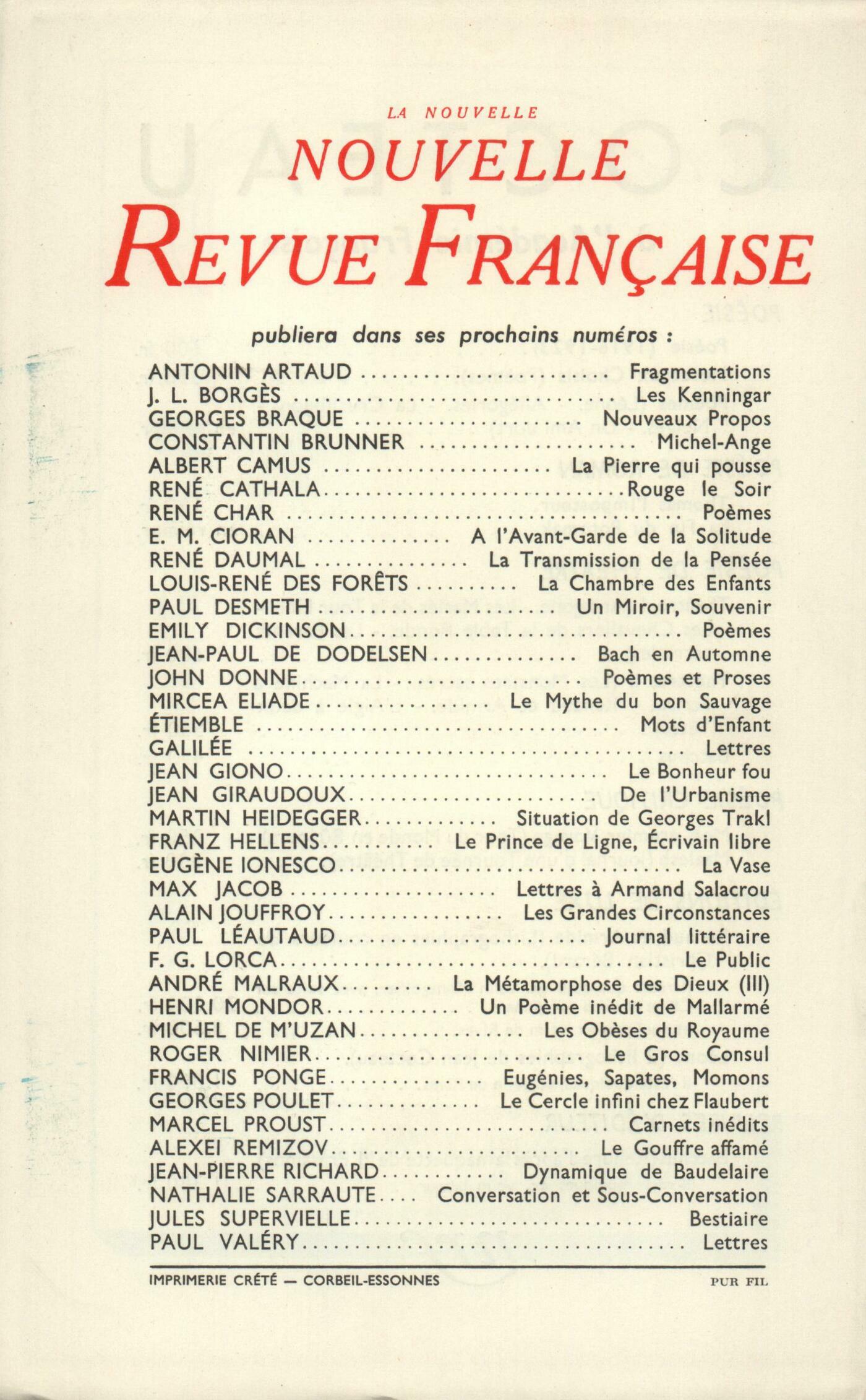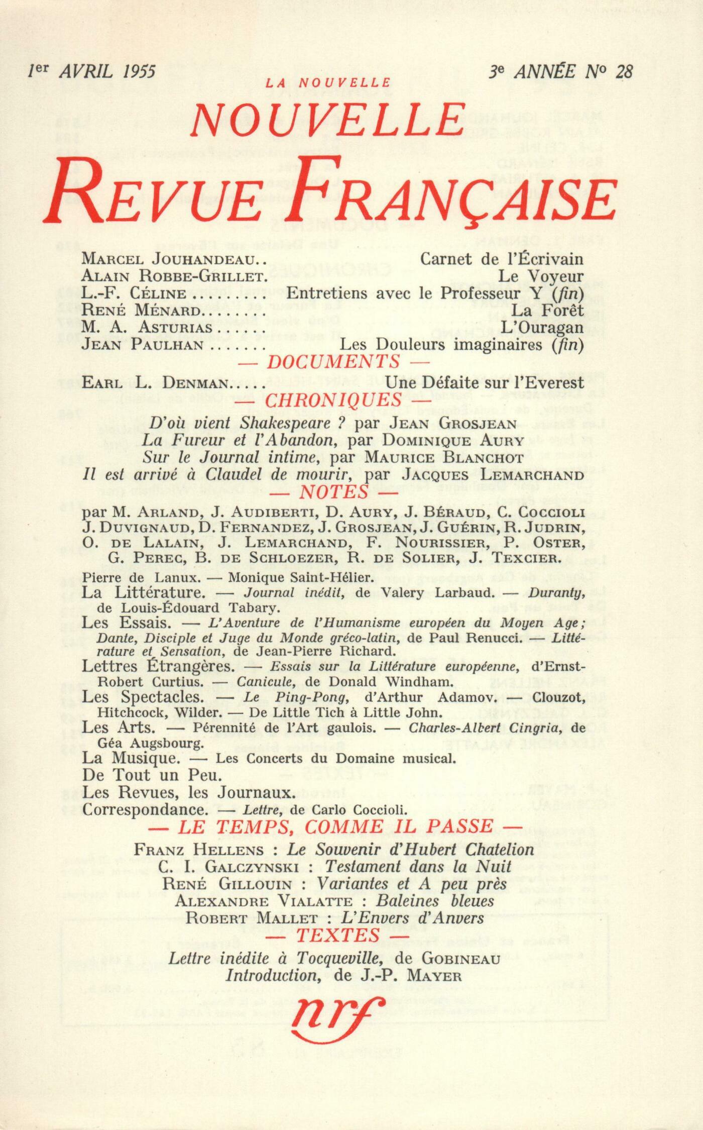Marcel Jouhandeau, Carnet de l'ÉcrivainAlain Robbe-Grillet, Le VoyeurLouis-Ferdinand Céline, Entretiens avec le Professeur Y (Fin)René Ménard, La ForętMiguel Angel Asturias, L'OuraganJean Paulhan, Les Douleurs imaginaires (Fin)Documents : Earl L. Denman, Une Défaite sur l'EverestChroniques : recherches : Maurice Blanchot, Sur le Journal intimeChroniques : le roman : Dominique Aury, La Fureur et l'AbandonChroniques : la poésie : Jean Grosjean, D'oů vient Shakespeare?Chroniques : le théâtre : Jacques Lemarchand, Il est arrivé ŕ Claudel de mourirNotes : Anonymes, Pierre de LanuxDominique Aury, Monique Saint-HélierNotes : la littérature : Odile de Lalain, Journal inédit, de Valery Larbaud (Gallimard)Roger Judrin, Duranty, par Louis-Édouard Tabary (Les Belles-Lettres)Notes : les essais : Jean Duvignaud, L'aventure de l'Humanisme européen au Moyen Âge, par Paul Renucci (Les Belles-Lettres)Georges Perec, Littérature et sensation, par Jean-Pierre Richard (Éditions du Seuil)Notes : lettres étrangčres : Dominique Fernandez, Essais sur la Littérature européenne, par Ernst-Robert Curtius (Grasset)Georges Perec, Canicule, par Donald Windham (Gallimard)Notes : les spectacles : Jacques Lemarchand, Le Ping-Pong, d'Arthur Adamov (Théâtre des Noctambules)François Nourissier, Clouzot, Hitchcock, WilderJean Texcier, De Little Tich ŕ Little JohnNotes : les arts : René de Solier, Pérennité de l'art gaulois (Musée Pédagogique)Jacques Audiberti, Charles-Albert Cingria, par Géa Augsbourg (Cailler)Notes : la musique : Boris de Schlzer, Les concerts du Domaine MusicalDe tout un peu : Jean Grosjean, Versets et versPierre Oster, Počmes, par Jean Sénac (Gallimard)Jean Guérin, La Djingine du Théophélčs, par André Martel (L'Air du Temps)Odile de Lalain, Des accomodements avec le ciel, par Beatrix Beck (Gallimard)Dominique Fernandez, Nos Semblables, par P.-A. Quarantotti-Gambini (Gallimard)Marcel Arland, Un Cas intéressant, de Dino Buzzati (Théâtre La Bruyčre)François Nourissier, La Strada - La Reine Christine - Au cur de la nuit - L'Équipée SauvageJanine Béraud, Palazuelo (Galerie Maeght) - Sarthou (Galerie Marcel Guiot)Les revues, les journaux : Jean Guérin - Georges Balette, AtomiquesPaul Claudel, Quelques propos... - ... Et ses derničres pagesMichel Cournot, Ŕ l'éloge du dessinJean Guérin, DiversCorrespondance : Carlo Coccioli, Lettre ŕ Dominique FernandezLe temps, comme il passe : Franz Hellens, Le souvenir d'Hubert ChatelionRené Gillouin, Variantes et ŕ peu prčsConstantin Ildefonse Galczynski, Testament dans la nuitRobert Mallet, L'envers d'AnversAlexandre Vialatte, Baleines bleuesTextes : Arthur de Gobineau, Lettre ŕ Tocqueville