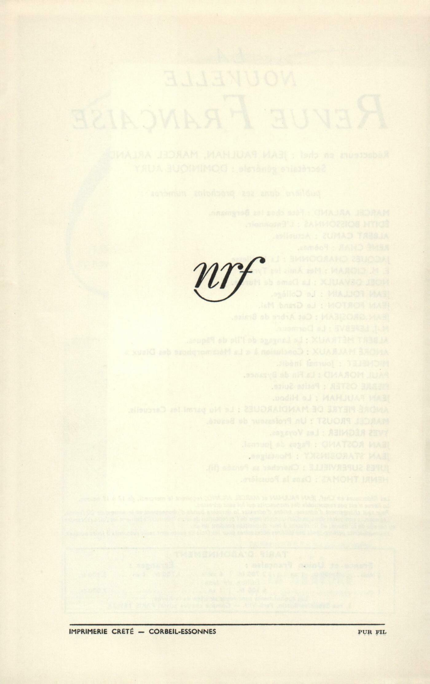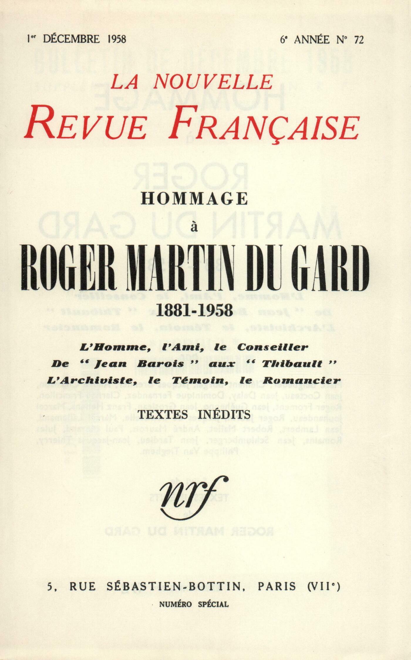 Roger Froment, Sa mortL'homme, l'ami : Jacques de Lacretelle, Roger Martin du GardJean Delay, Commencements d'une amitiéJules Romains, Le camaradeJean Tardieu, L'ami de toujoursRencontres : Jean Cocteau, Devenir ou L'âme exquise de Roger Martin du GardAndré Chamson, ŤJe vous parle de l'autre riveťJean Lambert, ŤNe parlons que voyages...ťLe conseiller : Marcel Jouhandeau, Une figure exemplaireClarisse Francillon, Une correspondanceJean-Jacques Thierry, Cette gloire paresseuseMarcel Lallemand, Bonheur d'une amitiéAspects et caractčres : André Maurois, L'univers de Martin du GardJean Guéhenno, Le sens d'un certain honneurMarc Beigbeder, Un mystčre de simplicitéRobert Mallet, Un archiviste monumentalJacques Brenner, L'été 1939Autour de Jean Barois : Paul Morand, Jean Barois, 1913...Philippe Van Tieghem, Jean Barois et nousArt et style : Jean Schlumberger, ŤVieille Franceť et l'artRoger Judrin, Roger Martin du Gard et le style du romanLe romancier des ŤThibaultť : Dominique Fernandez, Proust ou Martin du Gard?Clément Borgal, Ŕ la recherche du tempsFranz Hellens, D'un certain ordre fantastique chez Roger Martin du GardJean Grosjean, Un grand hagiographeTextes inédits : Roger Martin du Gard, Lettres ŕ Pierre Margaritis (Une consultation littéraire) - Lettres ŕ un ami [Marcel Lallemand] : Sur ŤLes Thibaultť - Lettres ŕ un ami [Marcel Lallemand] : sur des questions de politique - Lettres ŕ un ami [Marcel Lallemand] : Sur la souffrance et la solitude - La salle d'attente...