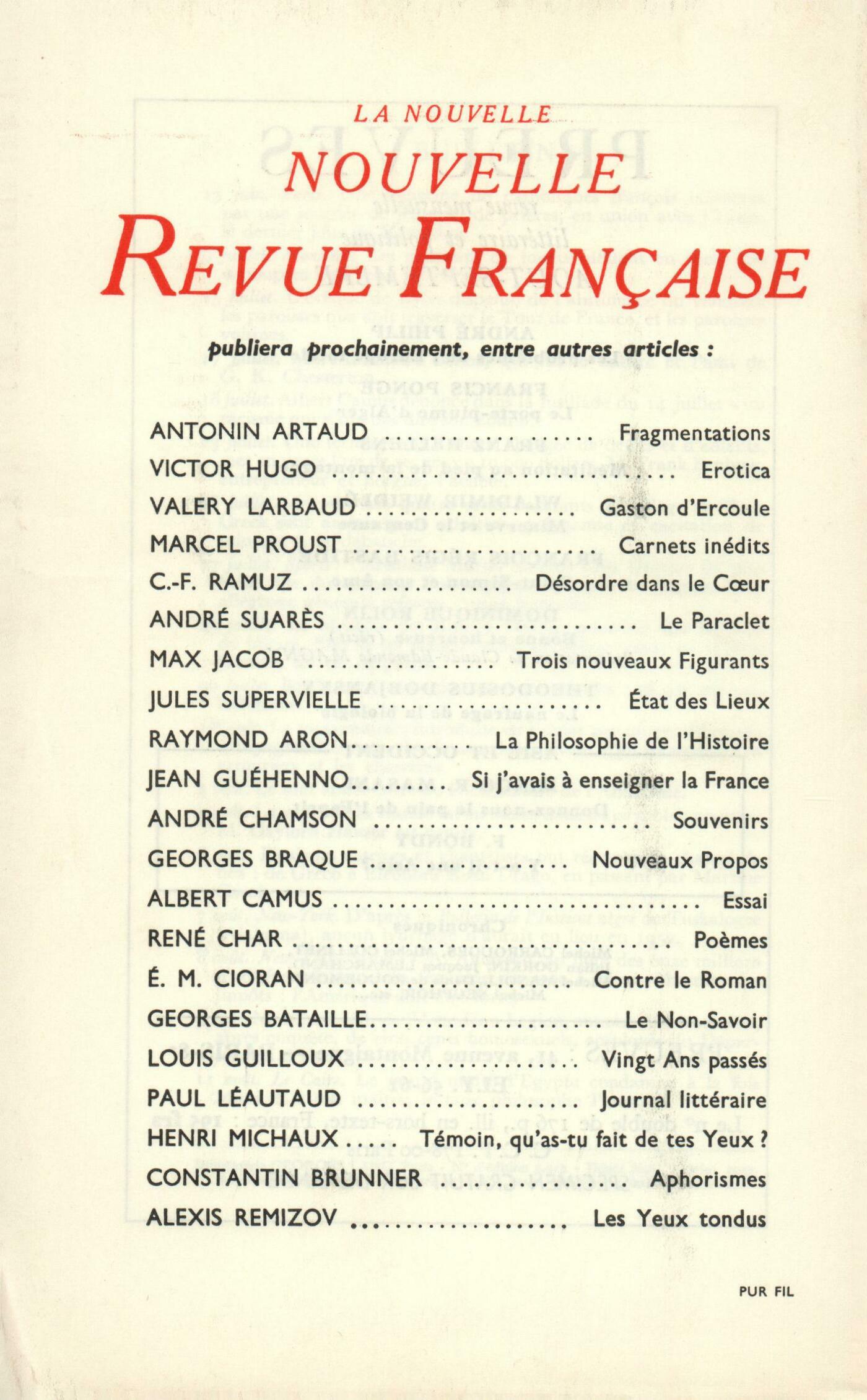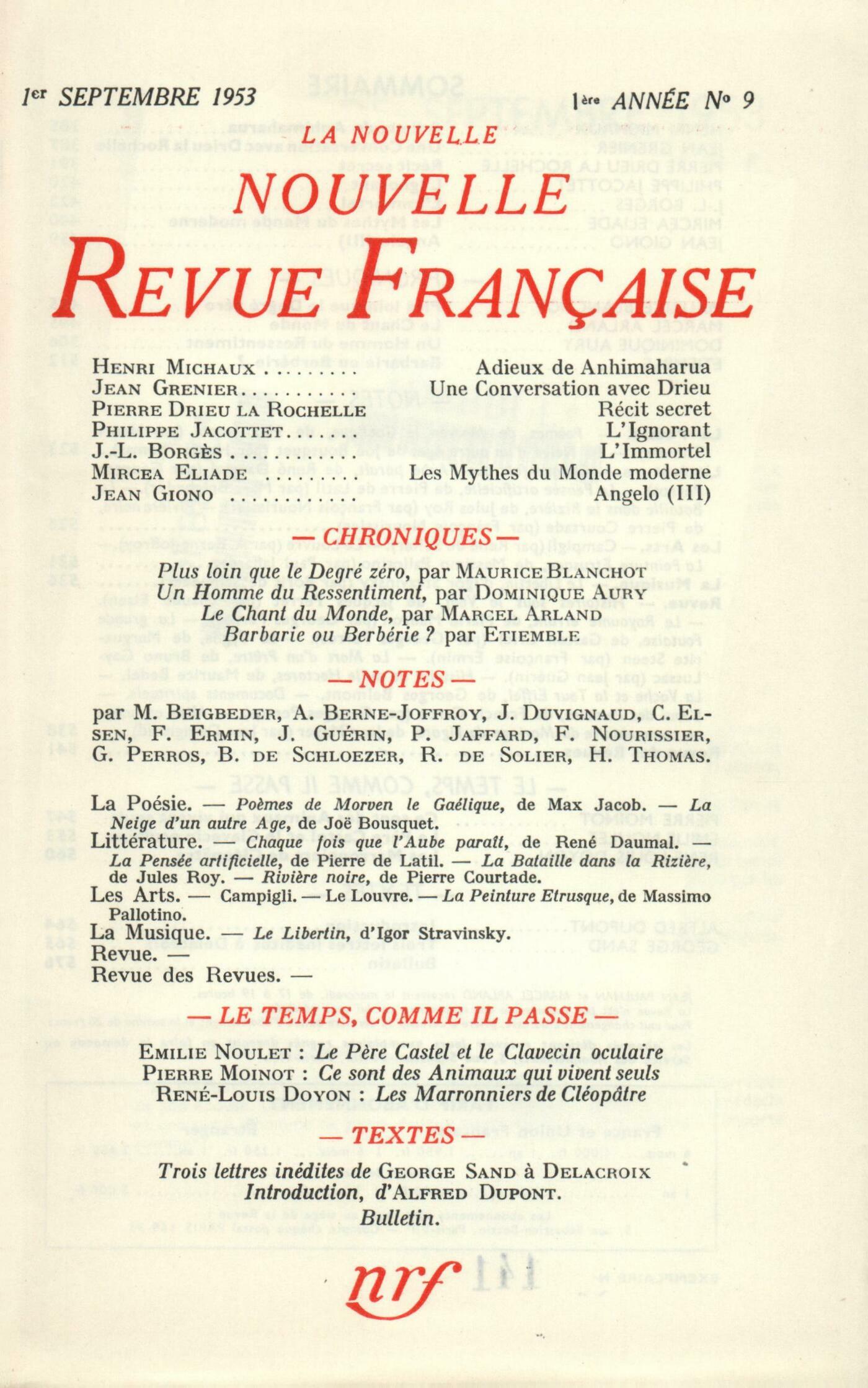 Henri Michaux, Adieux de AnhimaharuaJean Grenier, Une conversation avec Drieu la RochellePierre Drieu la Rochelle, Récit secretPhilippe Jaccottet, Trois počmes : L'Ignorant La voix L'hiverJorge Luis Borges, L'ImmortelMircea Eliade, Les Mythes du Monde moderneJean Giono, Angelo (III)Chroniques : recherches : Maurice Blanchot, Plus loin que le degré zéroChroniques : la littérature : Marcel Arland, Le Chant du MondeChroniques : les romans : Dominique Aury, Un homme du ressentimentChroniques : Étiemble, Barbarie ou Berbérie?Notes : la poésie : Henri Thomas, Les Počmes de Morven le Gaélique, par Max Jacob (Gallimard) - La Neige d'un autre Âge, par Joë Bousquet (Le Cercle du Livre)Notes : la littérature : Georges Perros, Chaque fois que l'aube paraît, par René Daumal (Gallimard)Marc Beigbeder, La Pensée artificielle, par Pierre de Latil (Gallimard)François Nourissier, La Bataille dans la rizičre, par Jules Roy (Gallimard) - Rivičre noire, par Pierre Courtade (Éditeurs Français Réunis)Notes : les arts : René de Solier, Campigli (Galerie de France)André Berne-Joffroy, Le LouvrePaul Jaffard, La Peinture étrusque, par Massimo Pallotino (Skira)Notes : la musique : Boris de Schlzer, Le Libertin, d'Igor Stravinsky (Opéra-Comique)Revue : Claude Elsen, Histoires sous le vent, par Jacques Perret (Gallimard)Georges Perros, Le Royaume errant, par Marie Mauron (Amiot-Dumont) - La grande Foutaise, par Gaston Criel (Fasquelle)Françoise Ermin, Le Cygne, par Marguerite Steen (Albin Michel)Jean Guérin, La Mort d'un prętre, par Bruno Gay-Lussac (Julliard)Georges Perros, Histoire de mille hectares, par Maurice Bedel (Grasset) - La vache et la Tour Eiffel, par Georges Belmont (Laffont) - Petite philocalie de la pričre du cur (Cahiers du Sud) - L'ami des peintres, par Francis Carco (Gallimard)Jean Duvignaud, Mariage de Figaro, mise en scčne de Jean Mayer (Le Seuil)Revue des revues : Anonymes, Les Temps Modernes et la littérature de la cruautéMircea Eliade, La Nostalgie du ParadisJean Guérin, DiversLe temps, comme il passe : Pierre Moinot, Ce sont des animaux qui vivent seulsÉmilie Noulet, Le Pčre Castel et le ŤClavecin oculaireťRené-Louis Doyon, Les Marronniers de CléopâtreTextes : George Sand, Trois lettres inédites ŕ Eugčne Delacroix Anonymes, Bulletin