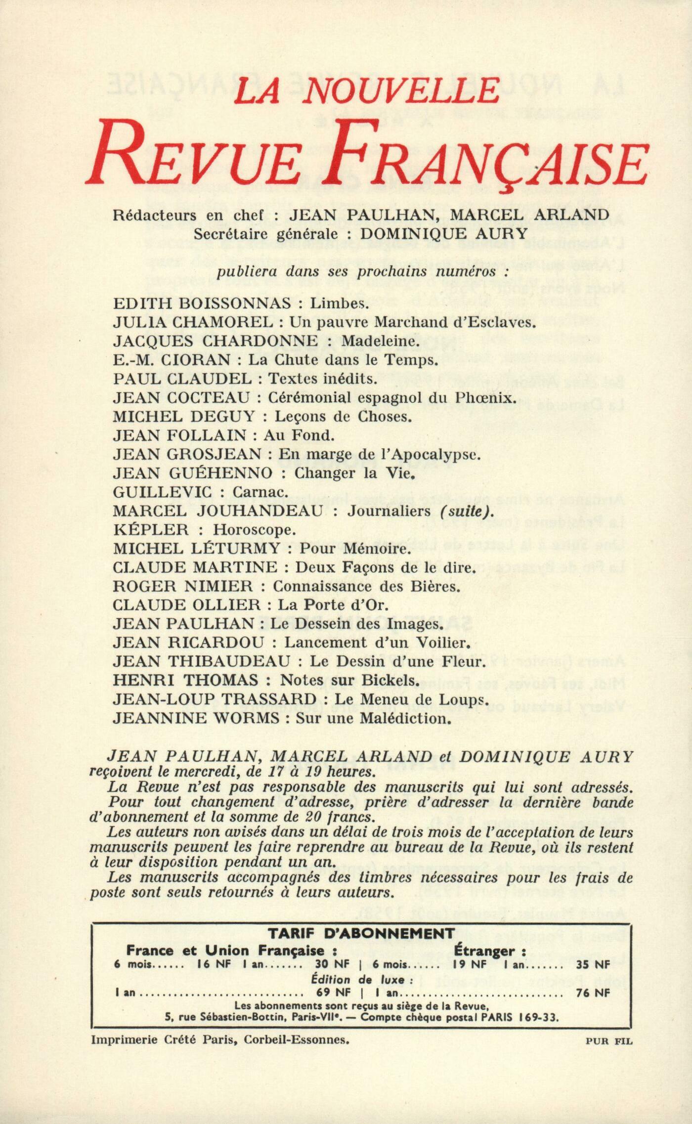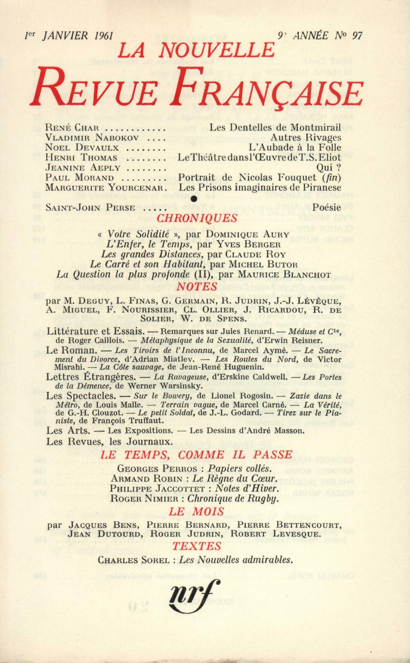 René Char, Les Dentelles de MontmirailVladimir Nabokov, Autres RivagesNoël Devaulx, L'Aubade ŕ la FolleHenri Thomas, Le théâtre dans l'uvre de T. S. EliotJanine Aeply, QuiPaul Morand, Portrait de Nicolas Fouquet (Fin)Marguerite Yourcenar, Les Prisons imaginaires de Pirančse Saint-John Perse, PoésieChroniques : Maurice Blanchot, La question la plus profonde (II)Dominique Aury, ŤVotre soliditéťYves Berger, L'Enfer, le TempsClaude Roy, Les grandes distancesMichel Butor, Le carré et son habitant (I)Notes : littérature et essais : Roger Judrin, Remarques sur Jules RenardMichel Deguy, Méduse et Cie, par Roger Caillois (Gallimard)Gabriel Germain, Métaphysique de la sexualité, par Erwin Reisner (Plon)Notes : le roman : Willy de Spens, Les Tiroirs de l'inconnu, par Marcel Aymé (Gallimard)André Miguel, Le Sacrement du divorce, par Adrian Miatlev (Gallimard)Willy de Spens, Les Routes du Nord, par Victor Misrahi (Gallimard)Lucette Finas, La Côte sauvage, par Jean-René Hughenin (Le Seuil)Notes : lettres étrangčres : André Miguel, La Ravageuse, par Erskine Caldwell (Gallimard)Jean Ricardou, Les Portes de la démence, par Werner Warsinsky (Gallimard)Notes : les spectacles : Claude Ollier, Sur le Bowery, de Lionel RogosinFrançois Nourissier, Zazie dans le métro, de Louis Malle - Terrain vague, de Marcel Carné - La Vérité, d'Henry-Georges Clouzot - Le Petit Soldat, de Jean-Luc Godard - Tirez sur le pianiste, de François TruffautNotes : les arts : René de Solier, James Ensor (Au Bateau Lavoir) - Joseph Sima (Galerie Paul Fachetti) - Lapique (Galerie Galanis) - Tal-Coat (Galerie Maeght) - Guyard (Galerie Saint-Honoré) - Messagier (Galerie André Schoeller) - Sarthou (Galerie Marcel Guiot) - Chauvin (Galerie de l'Élysée)Jean-Jacques Lévęque, Les dessins d'André Masson (Galerie Louise Leiris)Les revues, les journaux : Georges Limbour, Ŕ l'éloge de la critique d'artAndré Breton, Le MaréchalHenri Michaux, SimaMichel Butor, MasurovskyHenri Massis, Guillemin, Péguy, MassisJean Guérin, DiversLe temps, comme il passe : Georges Perros, Papiers collésArmand Robin, Le rčgne du curPhilippe Jaccottet, Notes d'hiverRoger Nimier, Chronique de rugbyLe mois : Roger Judrin, La rose de NoëlPierre Bettencourt, La soifJean Dutourd, L'inspirationPierre Bernard, Le souvenir de Mélot du DyJacques Bens, La part du diableRobert Levesque, Retour ŕ AthčnesTextes : Charles Sorel, Les Nouvelles Admirables