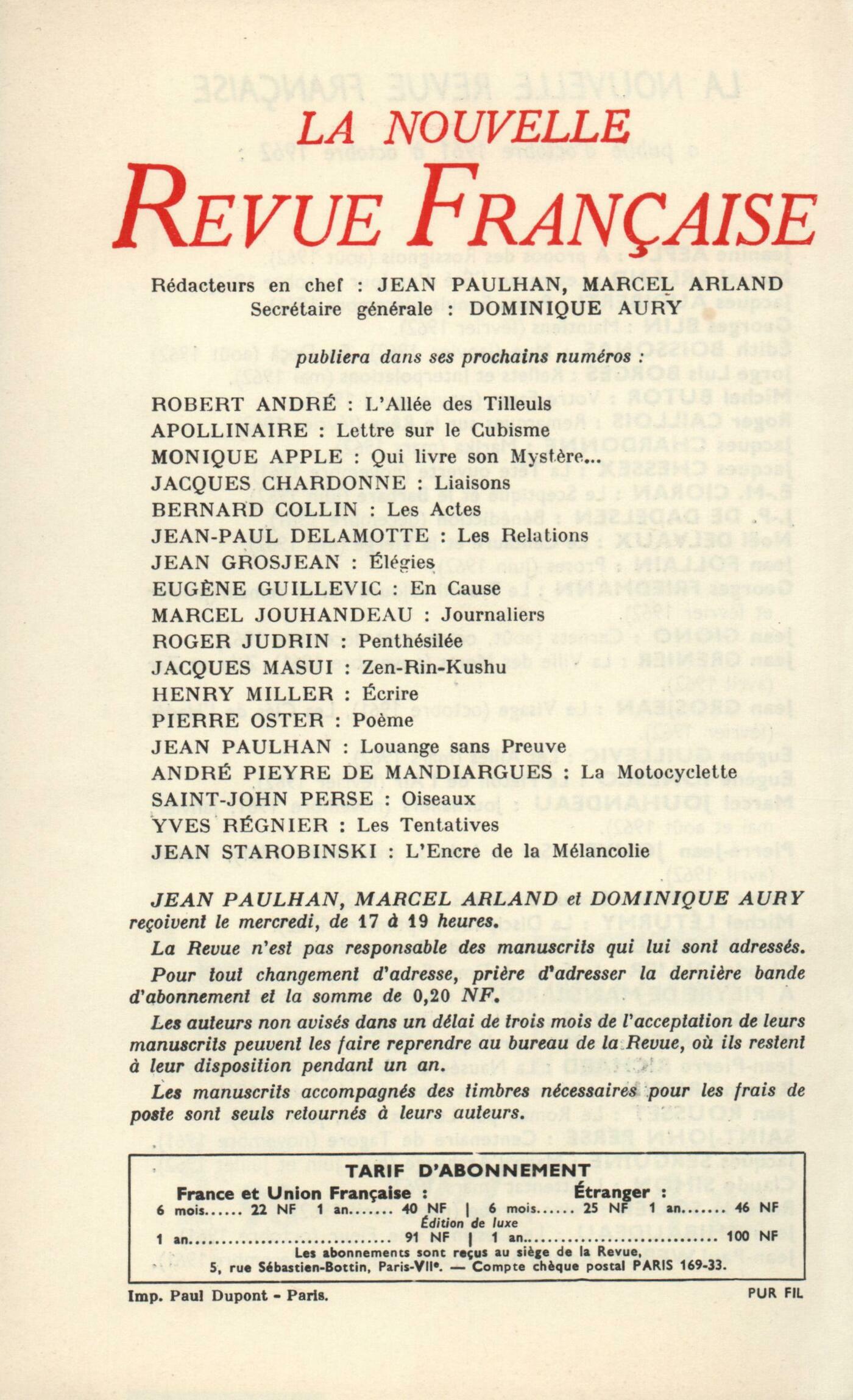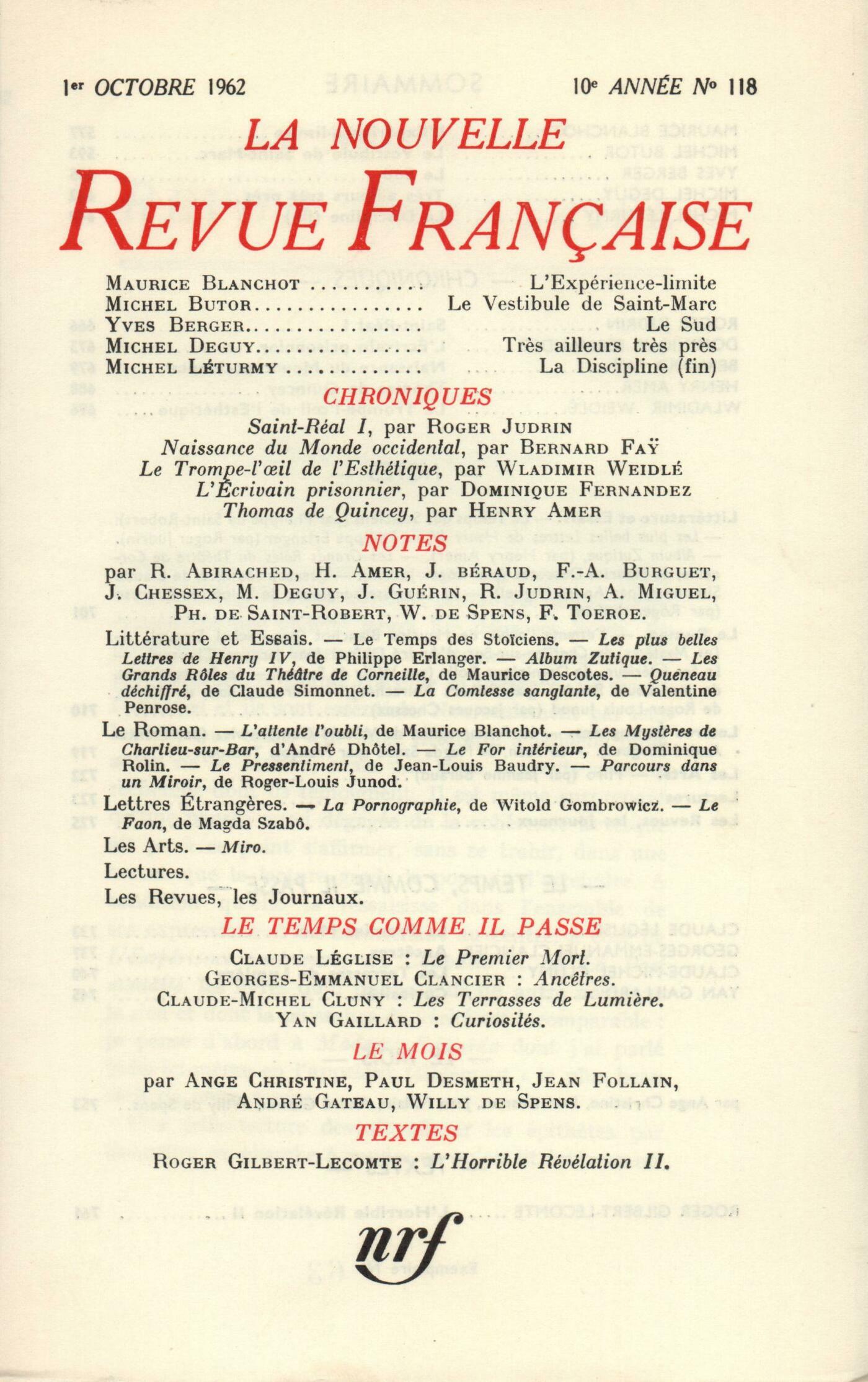 Maurice Blanchot, L'Expérience-LimiteMichel Butor, Le Vestibule de Saint-MarcYves Berger, Le SudMichel Deguy, Trčs ailleurs trčs prčsMichel Léturmy, La Discipline (Fin)Chroniques : Roger Judrin, Saint-RéalDominique Fernandez, L'écrivain prisonnierBernard Fa˙, Naissance du monde occidentalHenry Amer, Les Confessions de Thomas de QuinceyWladimir Weidlé, Le Trompe-l'il de l'esthétiqueNotes : littérature et essais : Philippe de Saint-Robert, Le temps des StoďciensRoger Judrin, Les plus belles lettres de Henri IV, par Philippe Erlanger (Calmann-Lévy)Henry Amer, Album Zutique (Cercle du Livre Précieux)Roger Judrin, Les Grands Rôles du théâtre de Corneille, par Maurice Descotes (Presses Universitaires de France)André Miguel, Queneau déchiffré, par Claude Simonnet (Julliard)Roger Judrin, La Comtesse sanglante, par Valentine Penrose (Mercure de France)Notes : le roman : Michel Deguy, L'attente l'oubli, par Maurice Blanchot (Gallimard)Jacques Chessex, Les Mystčres de Charlieu-sur-Bar, par André Dhôtel (Gallimard)Willy de Spens, Le For intérieur, par Dominique Rolin (Denoël)Robert Abirached, Le Pressentiment, par Jean-Louis Baudry (Le Seuil)Jacques Chessex, Parcours dans un miroir, par Roger-Louis Junod (Gallimard)Notes : lettres étrangčres : Frantz André Burguet, La Pornographie, par Witold Gombrowicz (Julliard)François Toeroe, Le Faon, par Magda Szabô (le Seuil)Notes : les arts : Janine Béraud, Miro (Musée d'Art moderne)Notes : lectures : André Miguel, Soleils en biais, par Serge Brindeau (Chambelland)Jean Guérin, Eux et lui, par Daniel Guérin (Éditions du Rocher)Willy de Spens, Rue d'Aboukir, par Monique Lange (Gallimard) - Les Plumes du Corbeau, par Jehanne Jean-Charles (Jean-Jacques Pauvert)Les revues : Jean Guérin, Jadis et nagučreJean Follain, Portrait d'Armen LubinArmand Guibert, Le souvenir de Jean AmroucheJean Guérin, DiversLe temps, comme il passe : Claude Léglise, Le premier mortGeorges-Emmanuel Clancier, AncętresClaude Michel Cluny, Les terrasses de lumičreYann Gaillard, CuriositésLe mois : Paul Desmeth, Une fęte burlesqueAndré Gateau, Au Point du JourJean Follain, Chronique du goűtWilly de Spens, Variations sur un fait diversAnge Christine, PRO 19-62Textes : Roger Gilbert-Lecomte, L'Horrible Révélation... la seule