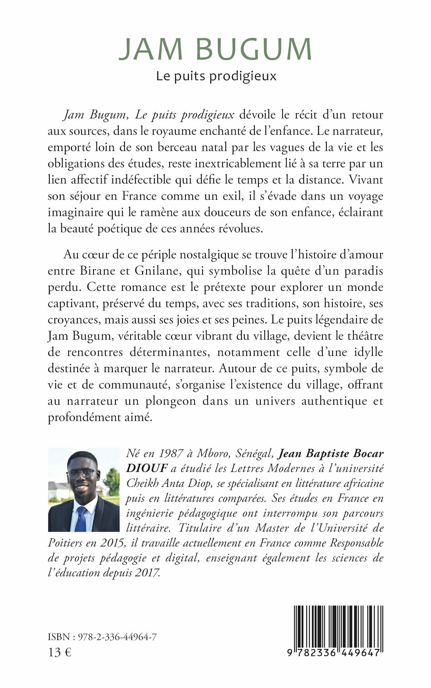 Au cœur de ce périple nostalgique se trouve l’histoire d’amour entre Birane et Gnilane, qui symbolise la quête d’un paradis perdu. Cette romance est le prétexte pour explorer un monde captivant, préservé du temps, avec ses traditions, son histoire, ses croyances, mais aussi ses joies et ses peines. Le puits légendaire de Jam Bugum, véritable cœur vibrant du village, devient le théâtre de rencontres déterminantes, notamment celle d’une idylle destinée à marquer le narrateur. Autour de ce puits, symbole de vie et de communauté, s’organise l’existence du village, offrant au narrateur un plongeon dans un univers authentique et profondément aimé.