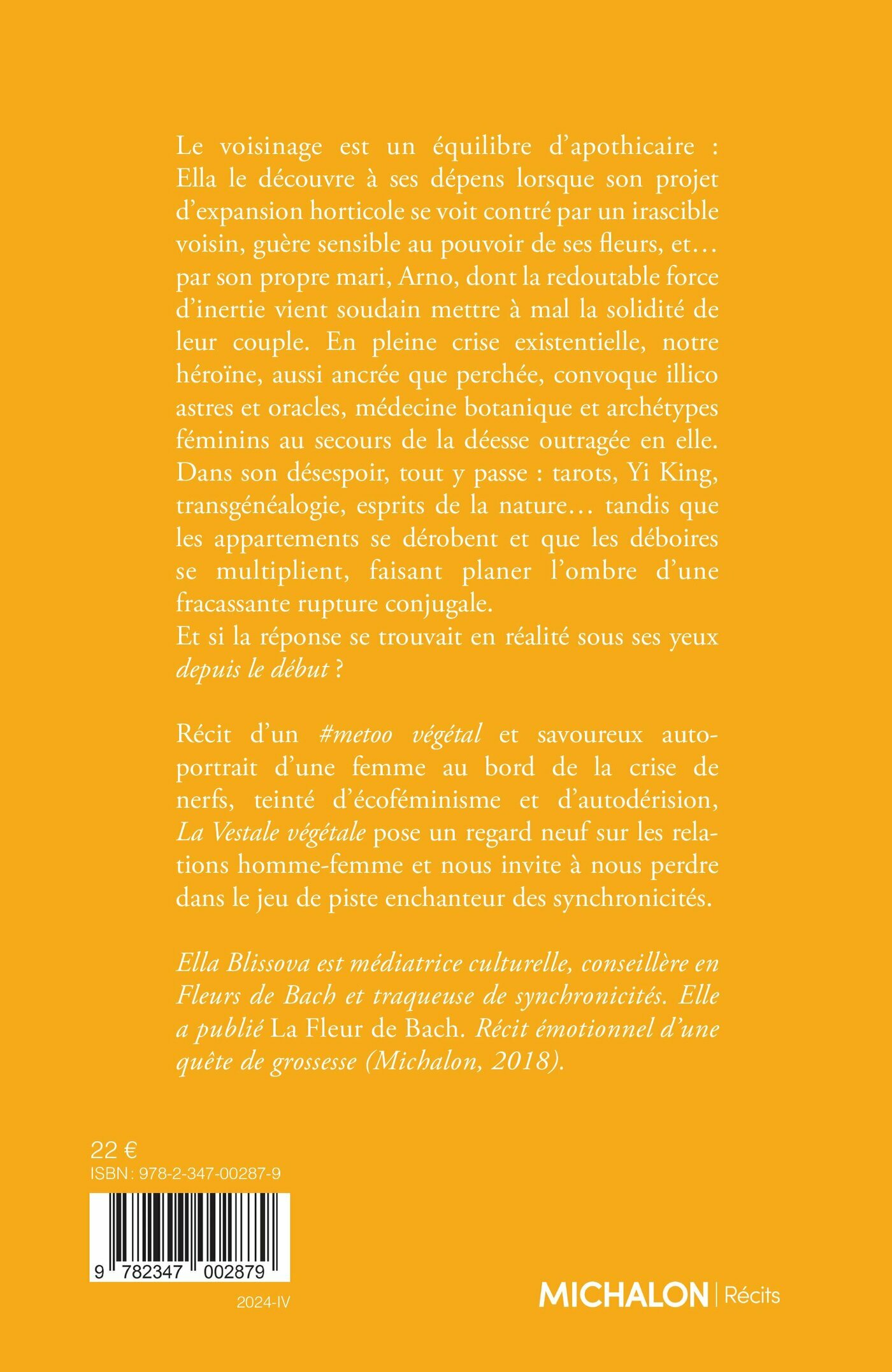 Le voisinage est un équilibre d’apothicaire : Ella le découvre à ses dépens lorsque son projet d’expansion horticole se voit contré par un irascible voisin, guère sensible au pouvoir de ses fleurs, et… par son propre mari, Arno, dont la redoutable force d’inertie vient soudain mettre à mal la solidité de leur couple. En pleine crise existentielle, notre héroïne, aussi ancrée que perchée, convoque illico astres et oracles, médecine botanique et archétypes féminins au secours de la déesse outragée en elle. Dans son désespoir, tout y passe : tarots, Yi King, transgénéalogie, esprits de la nature… tandis que les appartements se dérobent et que les déboires se multiplient, faisant planer l’ombre d’une fracassante rupture conjugale.