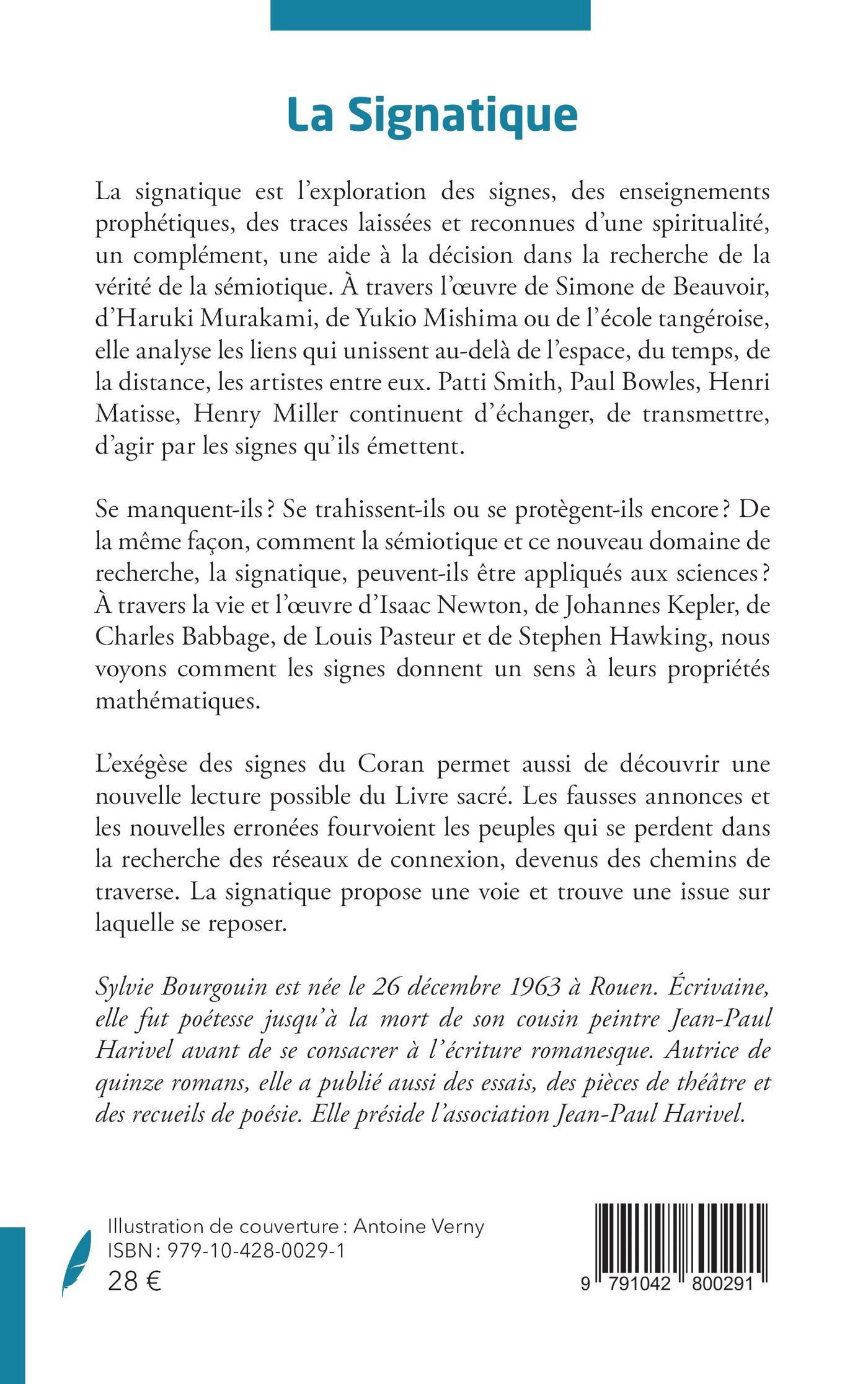 La signatique est l’exploration des signes, des enseignements prophétiques, des traces laissées et reconnues d’une spiritualité, un complément, une aide à la décision dans la recherche de la vérité de la sémiotique. À travers l’œuvre de Simone de Beauvoir, d’Haruki Murakami, de Yukio Mishima ou de l’école tangéroise, elle analyse les liens qui unissent au-delà de l’espace, du temps, de la distance, les artistes entre eux. Patti Smith, Paul Bowles, Henri Matisse, Henry Miller continuent d’échanger, de transmettre, d’agir par les signes qu’ils émettent.