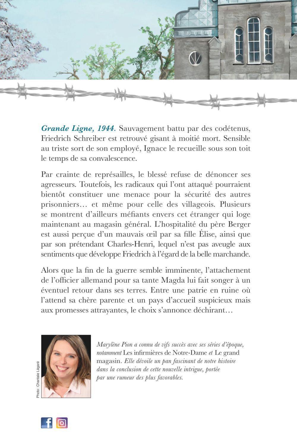 Grande Ligne, 1944. Sauvagement battu par des codétenus, Friedrich Schreiber est retrouvé gisant à moitié mort. Sensible au triste sort de son employé, Ignace le recueille sous son toit le temps de sa convalescence.Par crainte de représailles, le blessé refuse de dénoncer ses agresseurs. Toutefois, les radicaux qui l’ont attaqué pourraient bientôt constituer une menace pour la sécurité des autres prisonniers… et même pour celle des villageois. Plusieurs se montrent d’ailleurs méfiants envers cet étranger qui loge maintenant au magasin général. L’hospitalité du père Berger est aussi perçue d’un mauvais œil par sa fille Élise, ainsi que par son prétendant Charles-Henri, lequel n’est pas aveugle aux sentiments que développe Friedrich à l’égard de la belle marchande.Alors que la fin de la guerre semble imminente, l’attachement de l’officier allemand pour sa tante Magda lui fait songer à un éventuel retour dans ses terres. Entre une patrie en ruine où l’attend sa chère parente et un pays d’accueil suspicieux mais aux promesses attrayantes, le choix s’annonce déchirant…Marylène Pion a connu de vifs succès avec ses séries d’époque, notamment Les infirmières de Notre-Dame et Le grand magasin. Elle dévoile un pan fascinant de notre histoire dans la conclusion de cette nouvelle intrigue, portée par une rumeur des plus favorables.