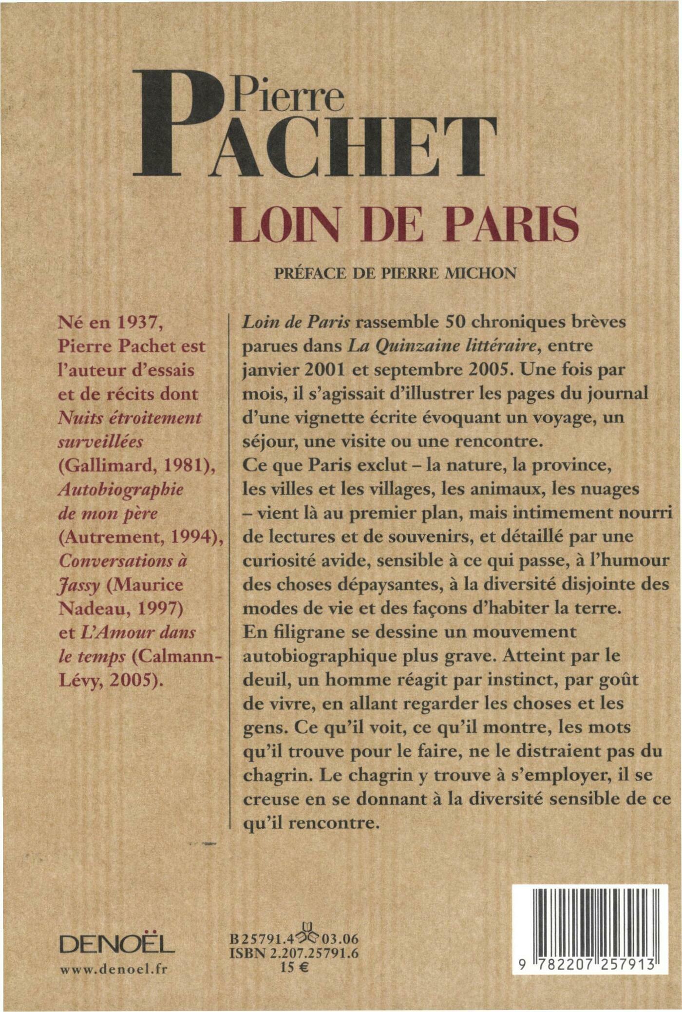 Loin de Paris rassemble 50 chroniques brèves parues dans La Quinzaine littéraire, entre janvier 2001 et septembre 2005. Une fois par mois, il s'agissait d'illustrer les pages du journal d'une vignette écrite évoquant un voyage, un séjour, une visite ou une rencontre. Ce que Paris exclut – la nature, la province, les villes et les villages, les animaux, les nuages – vient là au premier plan, mais intimement nourri de lectures et de souvenirs, et détaillé par une curiosité avide, sensible à ce qui se passe, à l'humour des choses dépaysantes, à la diversité disjointe des modes de vie et des façons d'habiter la terre. En filigrane se dessine un mouvement autobiographique plus grave. Atteint par le deuil, un homme réagit par instinct, par goût de vivre, en allant regarder les choses et les gens. Ce qu'il voit, ce qu'il montre, les mots qu'il trouve pour le faire, ne le distraient pas du chagrin. Le chagrin y trouve à s'employer, il se creuse en se donnant à la diversité sensible de ce qu'il rencontre.