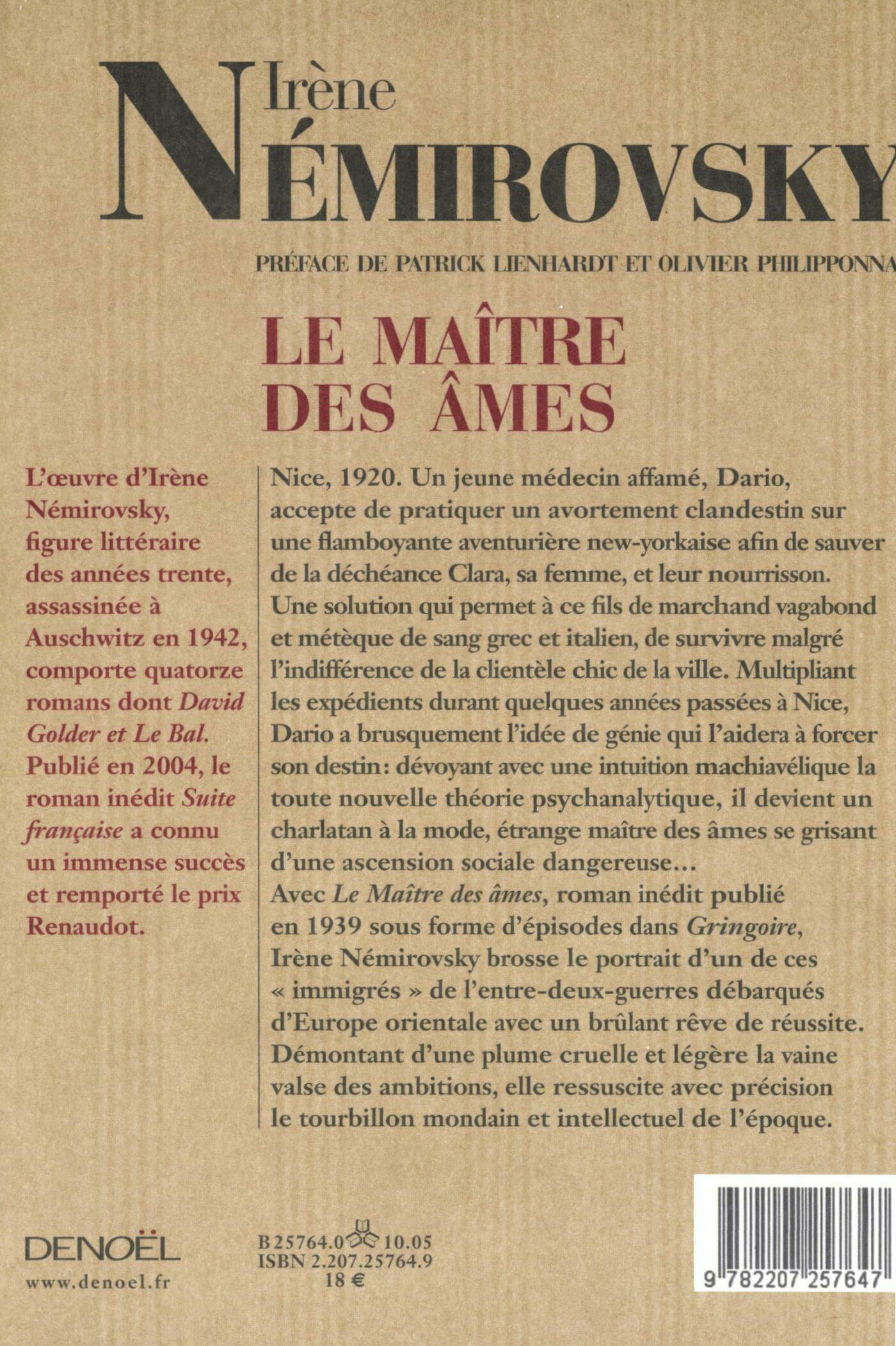 Nice, 1920. Un jeune médecin affamé, Dario, accepte de pratiquer un avortement clandestin sur une flamboyante aventurière new-yorkaise afin de sauver de la déchéance Clara, sa femme et leur nourrisson. Une solution qui permet à ce fils de marchand vagabond et métèque de sang grec et italien, de survivre malgré l'indifférence de la clientèle chic de la ville. Multipliant les expédients durant quelques années passées à Nice, Dario a brusquement l'idée de génie qui l'aidera à forcer son destin : dévoyant avec une intuition machiavélique la toute nouvelle théorie psychanalytique, il devient un charlatan à la mode, étrange maître des âmes se grisant d'une ascension sociale dangereuse... Avec Le Maître des âmes, roman inédit publié en 1939 sous forme d'épisodes dans Gringoire, Irène Némirovsky brosse le portrait d'un de ces "immigrés" de l'entre-deux-guerres débarqués d'Europe orientale avec un brûlant rêve de réussite. Démontant d'une plume cruelle et légère la vaine valse des ambitions, elle ressuscite avec précision le tourbillon mondain et intellectuel de l'époque.