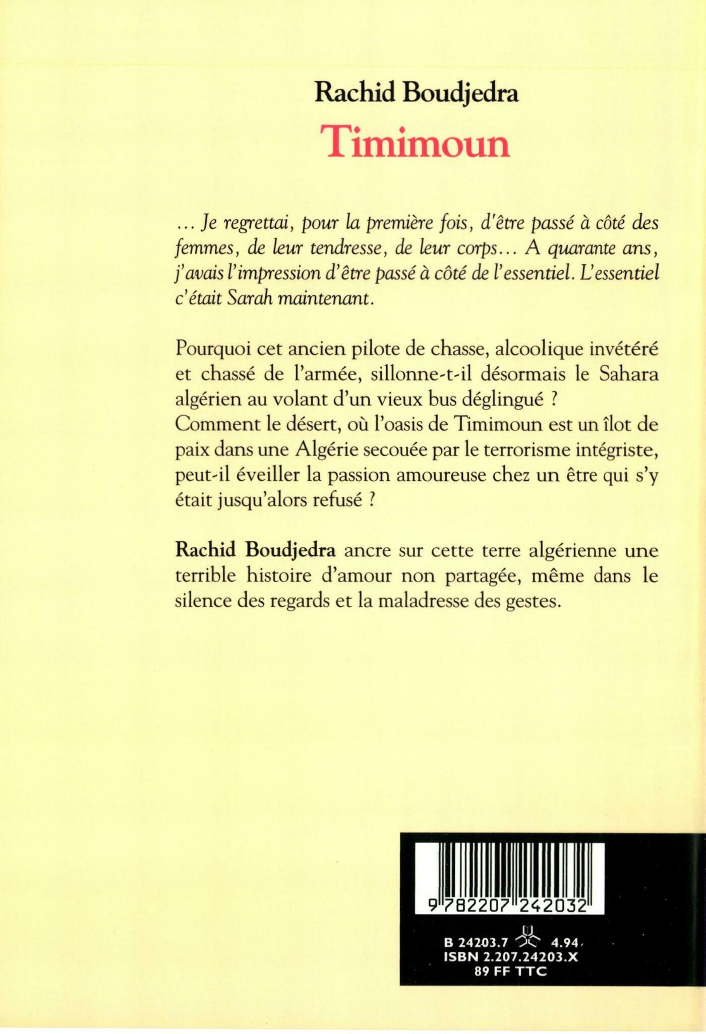 Je regrettai, pour la première fois, d'être passé à côté des femmes, de leur tendresse, de leur corps. . . À quarante ans, j'avais l'impression d'être passé à côté de l'essentiel. L'essentiel c'était Sarah maintenant. Pourquoi cet ancien pilote de chasse, alcoolique invétéré et chassé de l'armée, sillonne-t-il désormais le Sahara algérien au volant d'un vieux bus déglingué ? Comment le désert, où l'oasis de Timimoun est un îlot de paix dans une Algérie secouée par le terrorisme intégriste, peut-il éveiller la passion amoureuse chez un être qui s'y était jusqu'alors refusé ? Rachid Boudjedra ancre sur cette terre algérienne une terrible histoire d'amour non partagée, même dans le silence des regards et la maladresse des gestes.