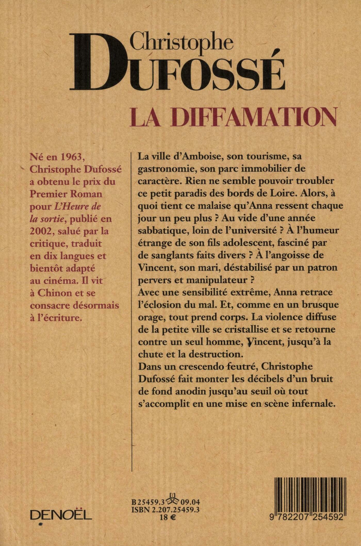 La ville d'Amboise, son tourisme, sa gastronomie, son parc immobilier de caractère. Rien ne semble pouvoir troubler ce petit paradis des bords de Loire. Alors, à quoi tient ce malaise qu'Anna ressent chaque jour un peu plus ? Au vide d'une année sabbatique, loin de l'université ? À l'humeur étrange de son fils adolescent, fasciné par de sanglants faits divers ? À l'angoisse de Vincent, son mari, déstabilisé par un patron pervers et manipulateur ?Avec une sensibilité extrême, Anna retrace l'éclosion du mal. Et, comme en un brusque orage, tout prend corps. La violence diffuse de la petite ville se cristallise et se retourne contre un seul homme, Vincent, jusqu'à la chute et la destruction.Dans un crescendo feutré, Christophe Dufossé fait monter les décibels d'un bruit de fond anodin jusqu'au seuil où tout s'accomplit en une mise en scène infernale.