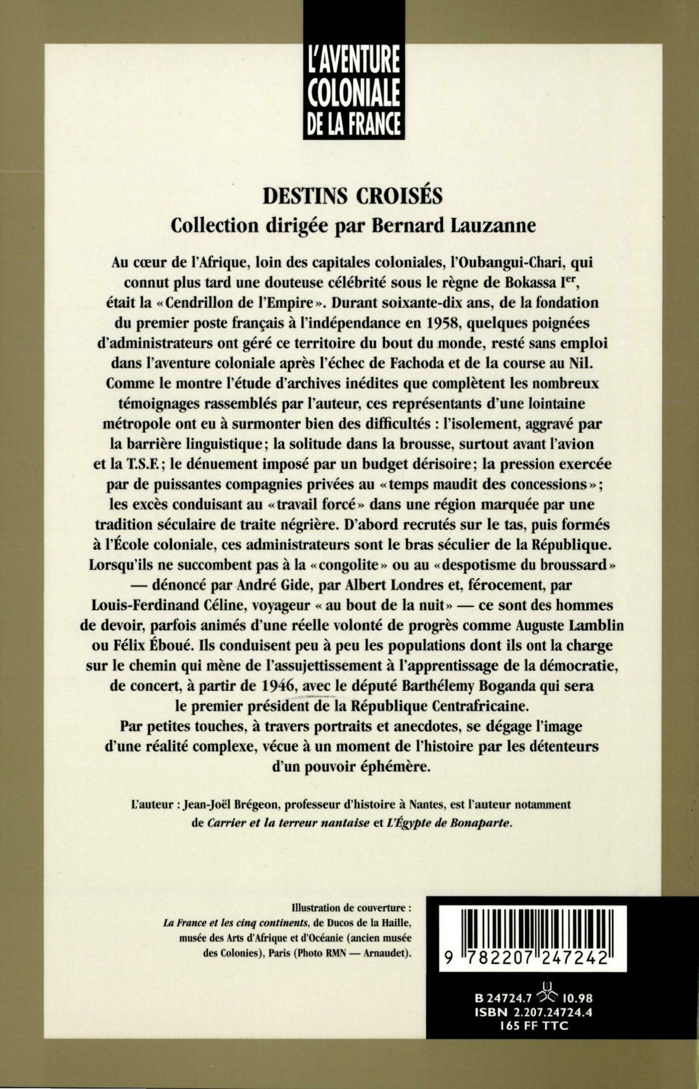 Au coeur de l'Afrique, loin des capitales coloniales, l'Oubangui-Chari, qui connut plus tard une douteuse célébrité sous le règne de Bokassa Ier, était la "Cendrillon de l'Empire". Durant soixante-dix ans, de la fondation du premier poste français à l'indépendance en 1958, quelques poignées d'administrateurs ont géré ce territoire du bout du monde, resté sans emploi dans l'aventure coloniale après l'échec de Fachoda et de la course au Nil. Comme le montre l'étude d'archives inédites que complètent les nombreux témoignages rassemblés par l'auteur, ces représentants d'une lointaine métropole ont eu à surmonter bien des difficultés : l'isolement, aggravé par la barrière linguistique; la solitude dans la brousse, surtout avant l'avion et la T.S.F.; le dénuement imposé par un budget dérisoire; la pression exercée par de puissantes compagnies privées au "temps maudit des concessions"; les excès conduisant au "travail forcé" dans une région marquée par une tradition séculaire de traite négrière. D'abord recrutés sur le tas, puis formés à l'Ecole coloniale, ces administrateurs sont le bras séculier de la République. Lorsqu'ils ne succombent pas à la "congolite" ou au "despotisme du broussard"- dénoncé par André Gide, par Albert Londres et, férocement, par Louis-Ferdinand Céline, voyageur "au bout de la nuit" - ce sont des hommes de devoir, parfois animés d'une réelle volonté de progrès comme Auguste Lamblin ou Félix Eboué. Ils conduisent peu à peu les populations dont ils ont la charge sur le chemin qui mène de l'assujettissement à l'apprentissage de la démocratie, de concert, à partir de 1946, avec le député Barthélemy Boganda qui sera le premier président de la République Centrafricaine. Par petites touches, à travers portraits et anecdotes, se dégage l'image d'une réalité complexe, vécue à un moment de l'histoire par les détenteurs d'un pouvoir éphémère.