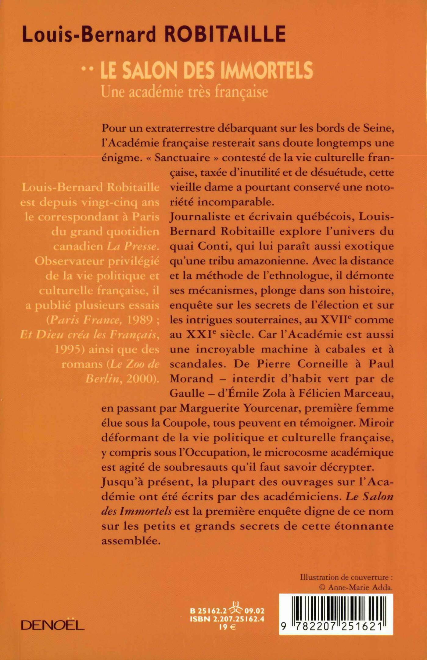 Pour un extraterrestre débarquant sur les bords de Seine, l'Académie française resterait sans doute longtemps une énigme. «Sanctuaire» contesté de la vie culturelle française, taxée d'inutilité et de désuétude, cette vieille dame a pourtant conservé une notoriété incomparable.Journaliste et écrivain québécois, Louis-Bernard Robitaille explore l'univers du quai Conti, qui lui paraît aussi exotique qu'une tribu amazonienne. Avec la distance et la méthode de l'ethnologue, il démonte ses mécanismes, plonge dans son histoire, enquête sur les secrets de l'élection et sur les intrigues souterraines, au XVIIe comme au XXIe siècle. Car l'Académie est aussi une incroyable machine à cabales et à scandales. De Pierre Corneille à Paul Morand - interdit d'habit vert par de Gaulle -, d'Émile Zola à Félicien Marceau, en passant par Marguerite Yourcenar, première femme élue sous la Coupole, tous peuvent en témoigner. Miroir déformant de la vie politique et culturelle française, y compris sous l'Occupation, le microcosme académique est agité de soubresauts qu'il faut savoir décrypter.Jusqu'à présent, la plupart des ouvrages sur l'Académie ont été écrits par des académiciens. Le Salon des Immortels est la première enquête digne de ce nom sur les petits et grands secrets de cette étonnante assemblée.