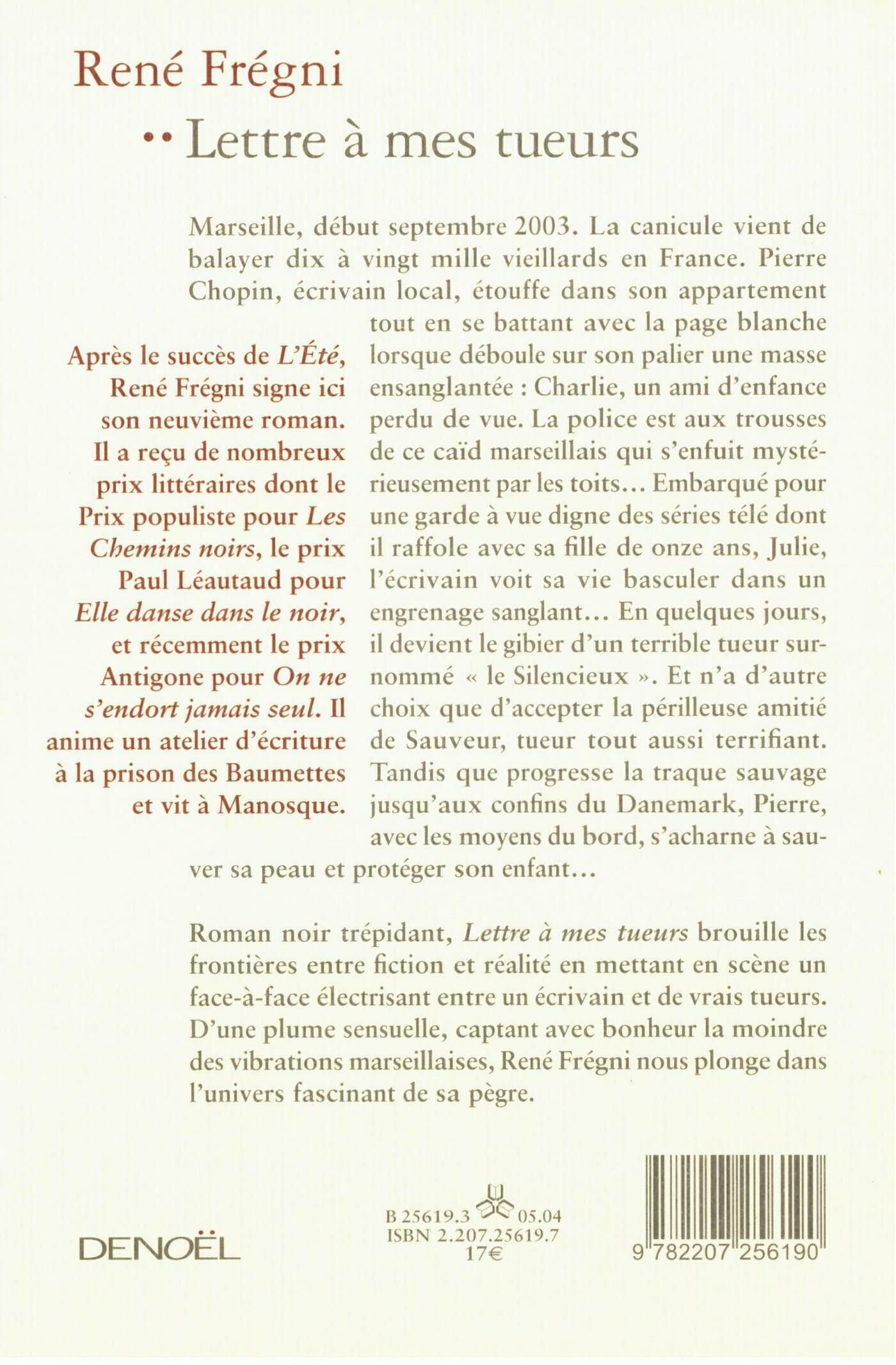 Marseille, début septembre 2003. La canicule vient de balayer dix à vingt mille vieillards en France. Pierre Chopin, écrivain local, étouffe dans son appartement tout en se battant avec la page blanche lorsque déboule sur son palier une masse ensanglantée : Charlie, un amie d'enfance perdu de vue. La police est aux trousses de ce caïd marseillais qui s'enfuit mystérieusement par les toits... Embarqué pour une garde à vue digne des séries télé dont il raffole avec sa fille de onze ans, Julie, l'écrivain voit sa vie basculer dans un engrenage sanglant... En quelques jours, il devient le gibier d'un terrible tueur surnommé 'le Silencieux'. Et n'a d'autre choix que d'accepter la périlleuse amitié de Sauveur, tueur tout aussi terrifiant. Tandis que progresse la traque sauvage jusqu'aux confins du Danemark, Pierre, avec les moyens du bord, s'acharne à sauver sa peau et protéger son enfant... Roman noir trépidant, Lettre à mes tueurs brouille les frontières entre fiction et réalité en mettant en scène un face-à-face électrisant entre un écrivain et de vrais tueurs. D'une plume sensuelle, captant avec bonheur la moindre des vibrations marseillaises, René Frégni nous plonge dans l'univers fascinant de la pègre.