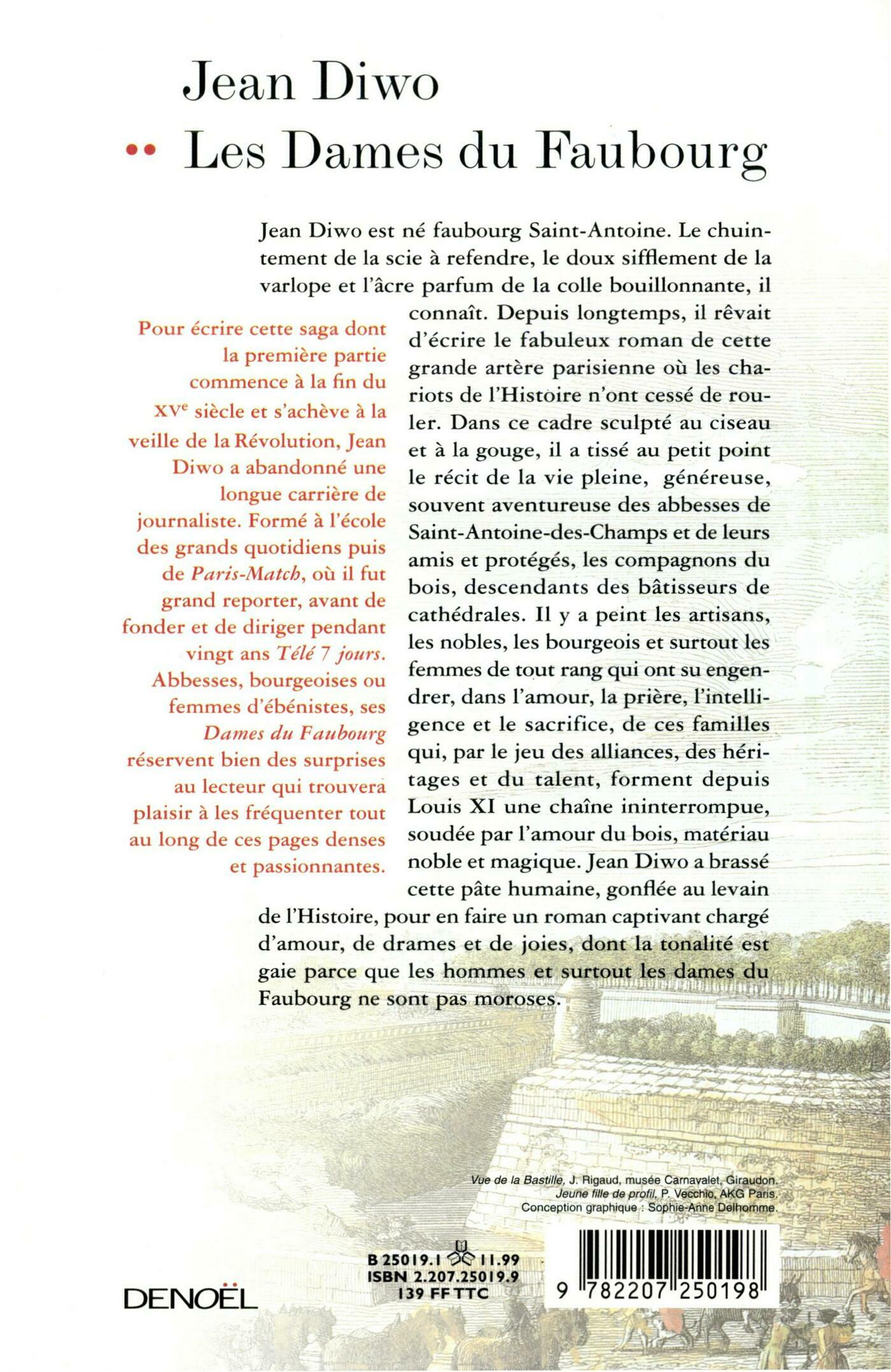 Jean Diwo est né faubourg Saint-Antoine. Le chuintement de la scie à refendre, le doux sifflement de la varlope et l'âcre parfum de la colle bouillonnante, il connaît. Depuis longtemps, il rêvait d'écrire le fabuleux roman de cette grande artère parisienne où les chariots de l'Histoire n'ont cessé de rouler. Dans ce cadre sculpté au ciseau et à la gouge, il a tissé au petit point le récit de la vie pleine, généreuse, souvent aventureuse des abbesses de Saint-Antoine-des-Champs et de leurs amis et protégés, les compagnons du bois, descendants des bâtisseurs de cathédrales. Il y a peint les artisans, les nobles, les bourgeois et surtout les femmes de tout rang qui ont su engendrer, dans l'amour, la prière, l'intelligence et le sacrifice, de ces familles qui, par le jeu des alliances, des héritages et du talent, forment depuis Louis XI une chaîne ininterrompue, soudée par l'amour du bois, matériau noble et magique. Jean Diwo a brassé cette pâte humaine, gonflée au levain de l'Histoire, pour en faire un roman captivant chargé d'amour, de drames et de joies, dont la tonalité est gaie parce que les hommes et surtout les dames du Faubourg ne sont pas moroses.