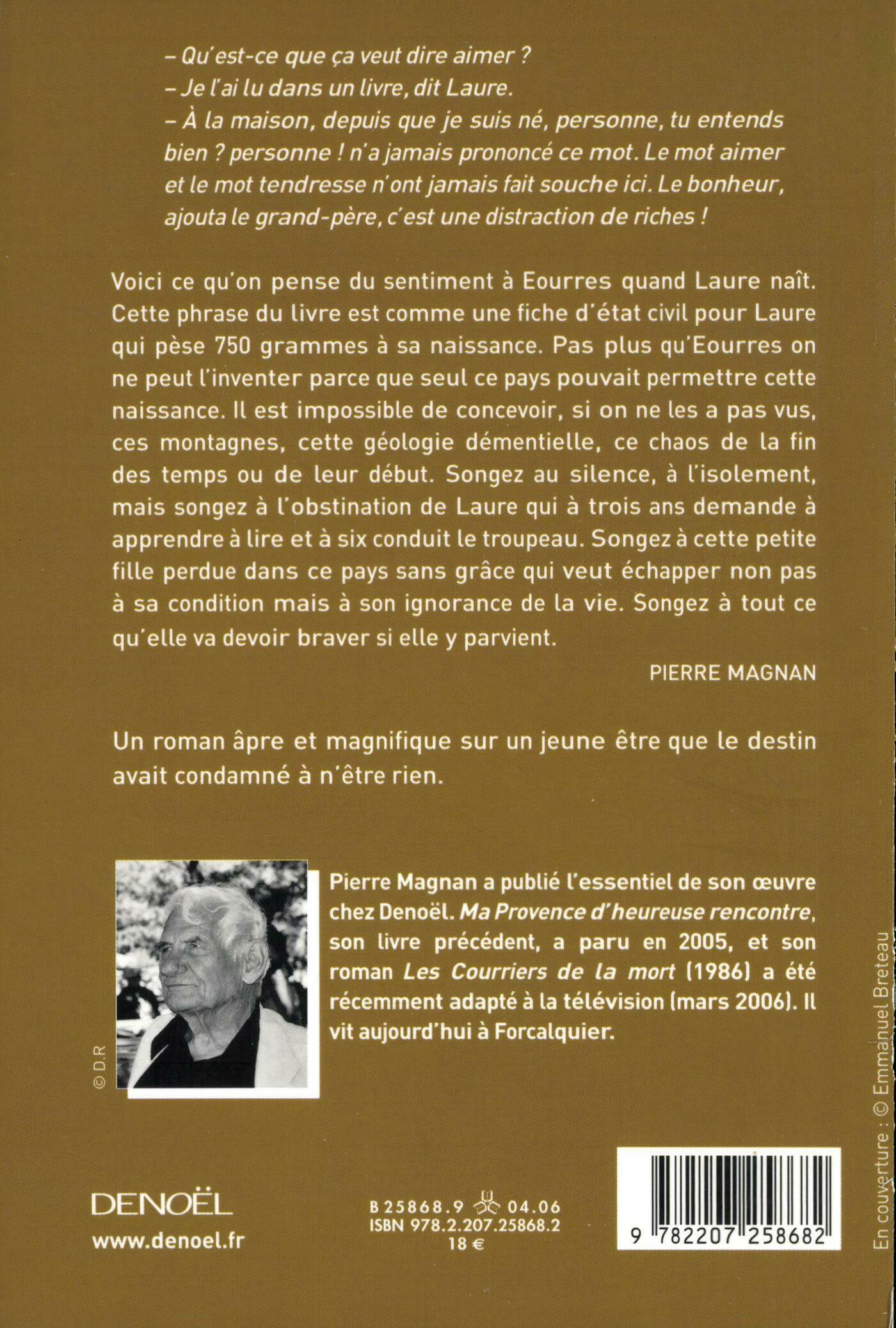 "– Qu'est-ce que ça veut dire aimer ? – Je l'ai lu dans un livre, dit Laure. – À la maison, depuis que je suis né, personne, tu entends bien ? personne ! n'a jamais prononcé ce mot. Le mot aimer et le mot tendresse n'ont jamais fait souche ici. Le bonheur, ajouta le grand-père, c'est une distraction de riches ! Voici ce qu'on pense du sentiment à Eourres quand Laure naît. Cette phrase du livre est comme une fiche d'état civil pour Laure qui pèse 750 grammes à sa naissance. Pas plus qu'Eourres on ne peut l'inventer parce que seul ce pays pouvait permettre cette naissance. Il est impossible de concevoir, si on ne les a pas vus, ces montagnes, cette géologie démentielle, ce chaos de la fin des temps ou de leur début. Songez au silence, à l'isolement, mais songez à l'obstination de Laure qui à trois ans demande à apprendre à lire et à six conduit le troupeau. Songez à cette petite fille perdue dans ce pays sans grâce qui veut échapper non pas à sa condition mais à son ignorance de la vie. Songez à tout ce qu'elle va devoir braver si elle y parvient." Pierre Magnan