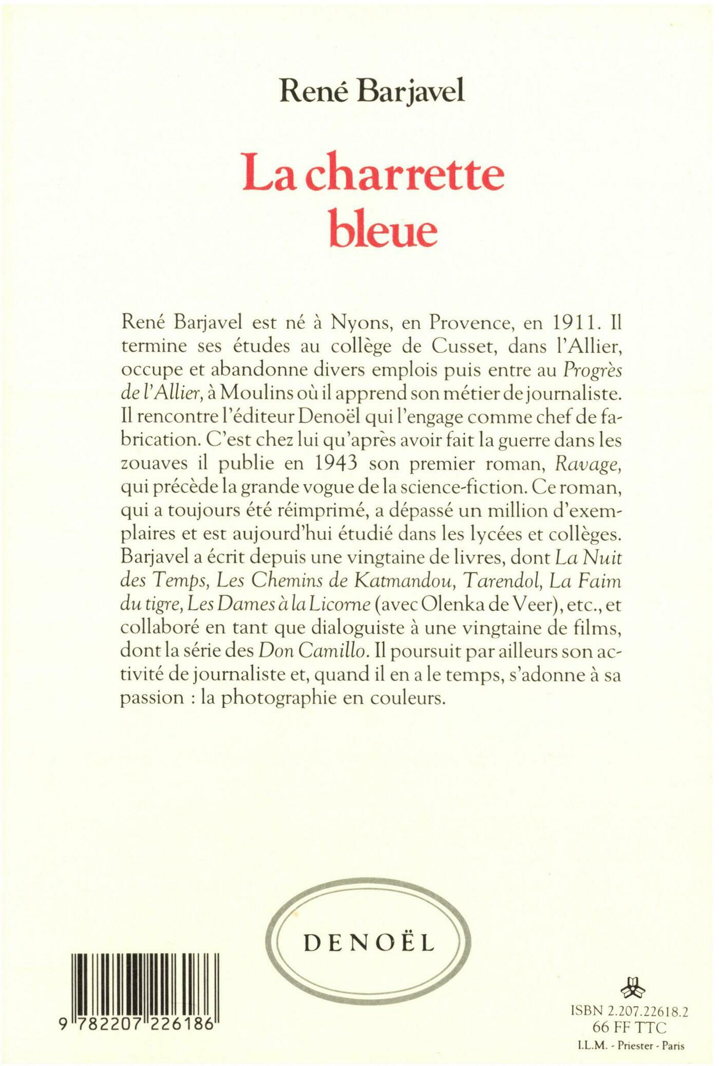 René Barjavel raconte son enfance dans la boulangerie provençale de ses parents. Au fil des pages et des souvenirs, parfois précis, parfois flous comme des couleurs dans la brume, nous voyons vivre un petit garçon naïf et ébloui, qui découvre les merveilles familières du monde. Autour de lui, c'est un bourg de Provence qui surgit, au temps de la Grande Guerre de 1914. Et si les hommes qui sont loin, au front, s'entre-tuent avec des moyens très modernes, à Nyons c'est encore la civilisation paysanne et artisanale qui subsiste, la civilisation de la main et de l'outil. Et les enfants regardent le charron fabriquer pièce par pièce un chef-d'œuvre : la grande charrette bleue qu'un paysan lui a commandée et qui va porter dans cette histoire le signe du destin. Mais déjà le premier aéroplane, aux ailes de toile, se pose dans un champ...