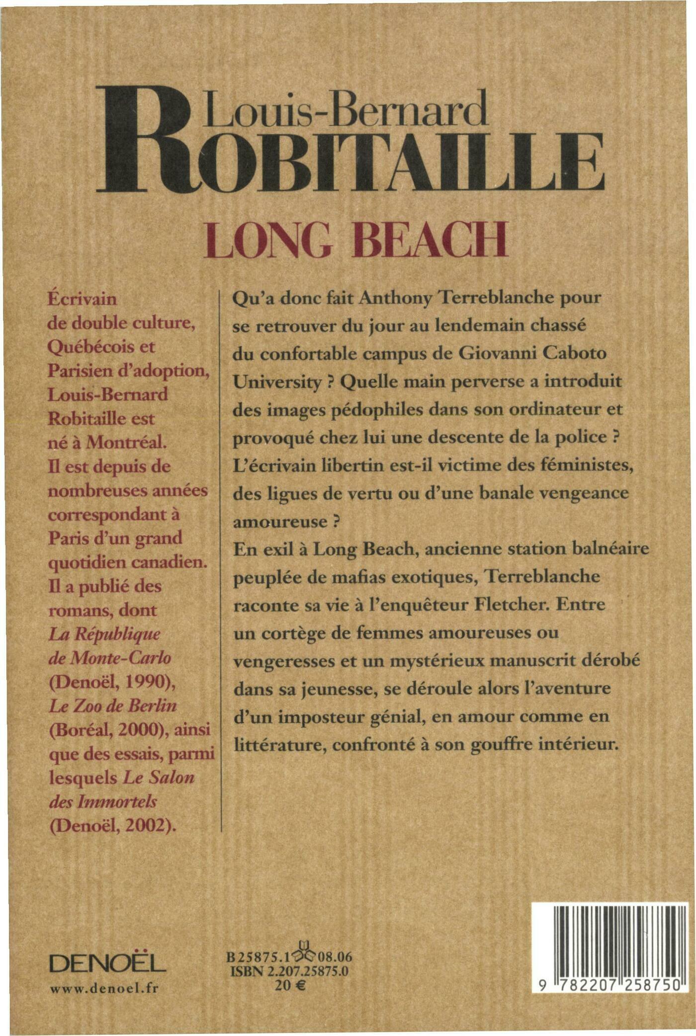 Qu'a donc fait Anthony Terreblanche pour se retrouver du jour au lendemain chassé du confortable campus de Giovanni Caboto University ? Quelle main perverse a introduit des images pédophiles dans son ordinateur et provoqué chez lui une descente de police ? L'écrivain libertin est-il victime des féministes, des ligues de vertu ou d'une banale vengeance amoureuse ? En exil à Long Beach, ancienne station balnéaire peuplée de mafias exotiques, Terreblanche raconte sa vie à l'enquêteur Fletcher. Entre un cortège de femmes amoureuses ou vengeresses et un mystérieux manuscrit dérobé dans sa jeunesse, se déroule alors l'aventure d'un imposteur génial, en amour comme en littérature, confronté à son gouffre intérieur.