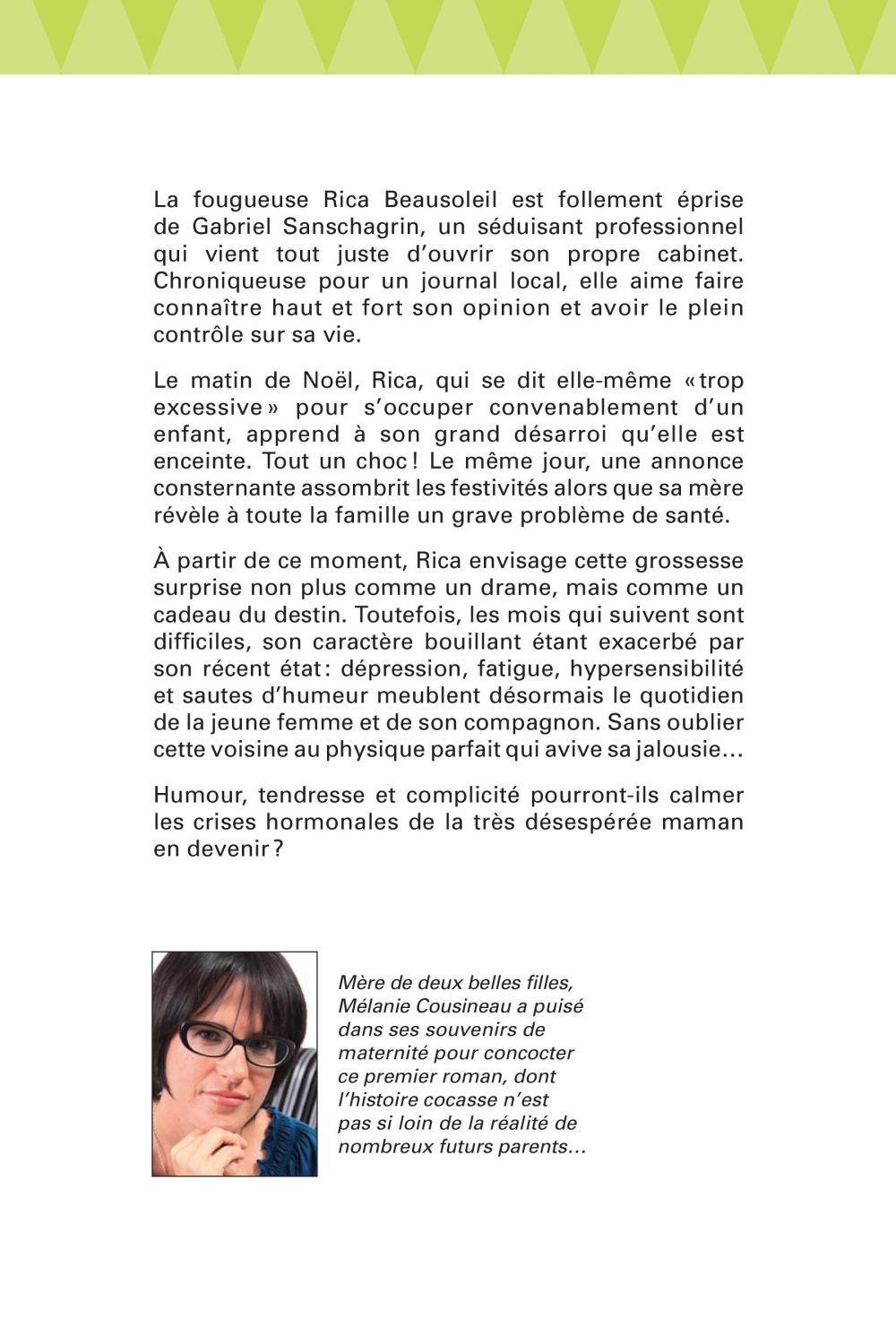 La fougueuse Rica Beausoleil est follement éprise de Gabriel Sanschagrin, un séduisant professionnel qui vient tout juste d'ouvrir son propre cabinet. Chroniqueuse pour un journal local, elle aime faire connaître haut et fort son opinion et avoir le plein contrôle sur sa vie.Le matin de Noël, Rica, qui se dit elle-même « trop excessive » pour s'occuper convenablement d'un enfant, apprend à son grand désarroi qu'elle est enceinte. Tout un choc ! Le même jour, une annonce consternante assombrit les festivités alors que sa mère révèle à toute la famille un grave problème de santé.A partir de ce moment, Rica envisage cette grossesse surprise non plus comme un drame, mais comme un cadeau du destin. Toutefois, les mois qui suivent sont difficiles, son caractère bouillant étant exacerbé par son récent état : dépression, fatigue, hypersensibilité et sautes d'humeur meublent désormais le quotidien de la jeune femme et de son compagnon. Sans oublier cette voisine au physique parfait qui avive sa jalousie…Humour, tendresse et complicité pourront-ils calmer les crises hormonales de la très désespérée maman en devenir ?